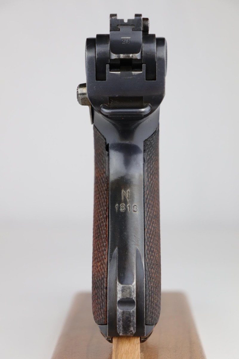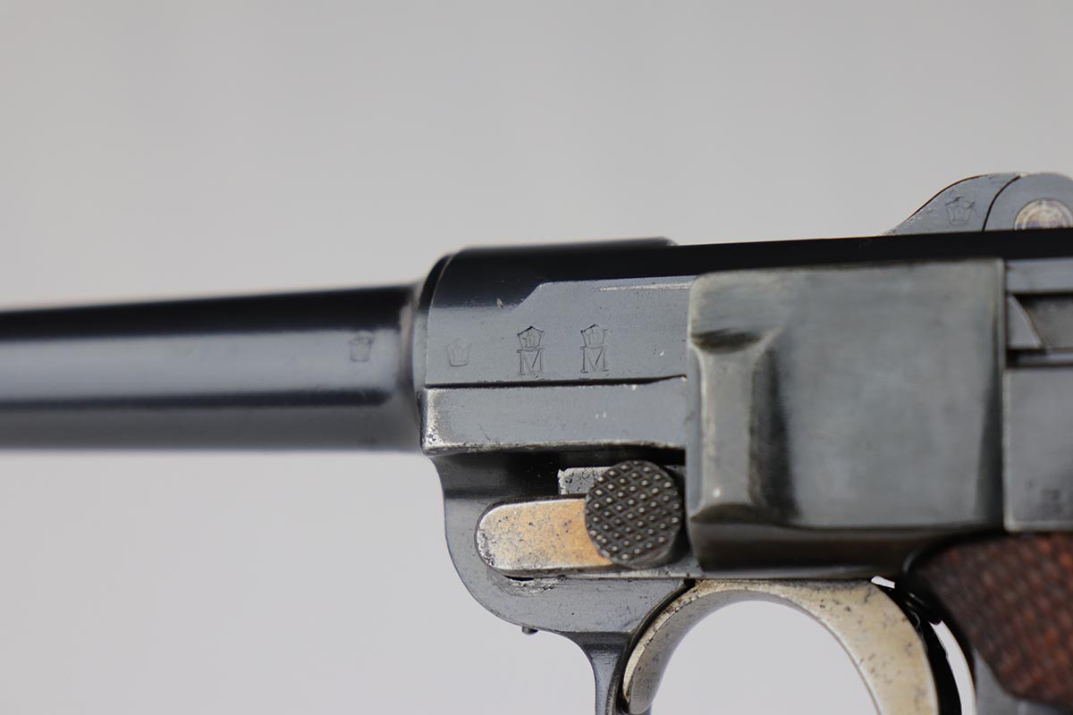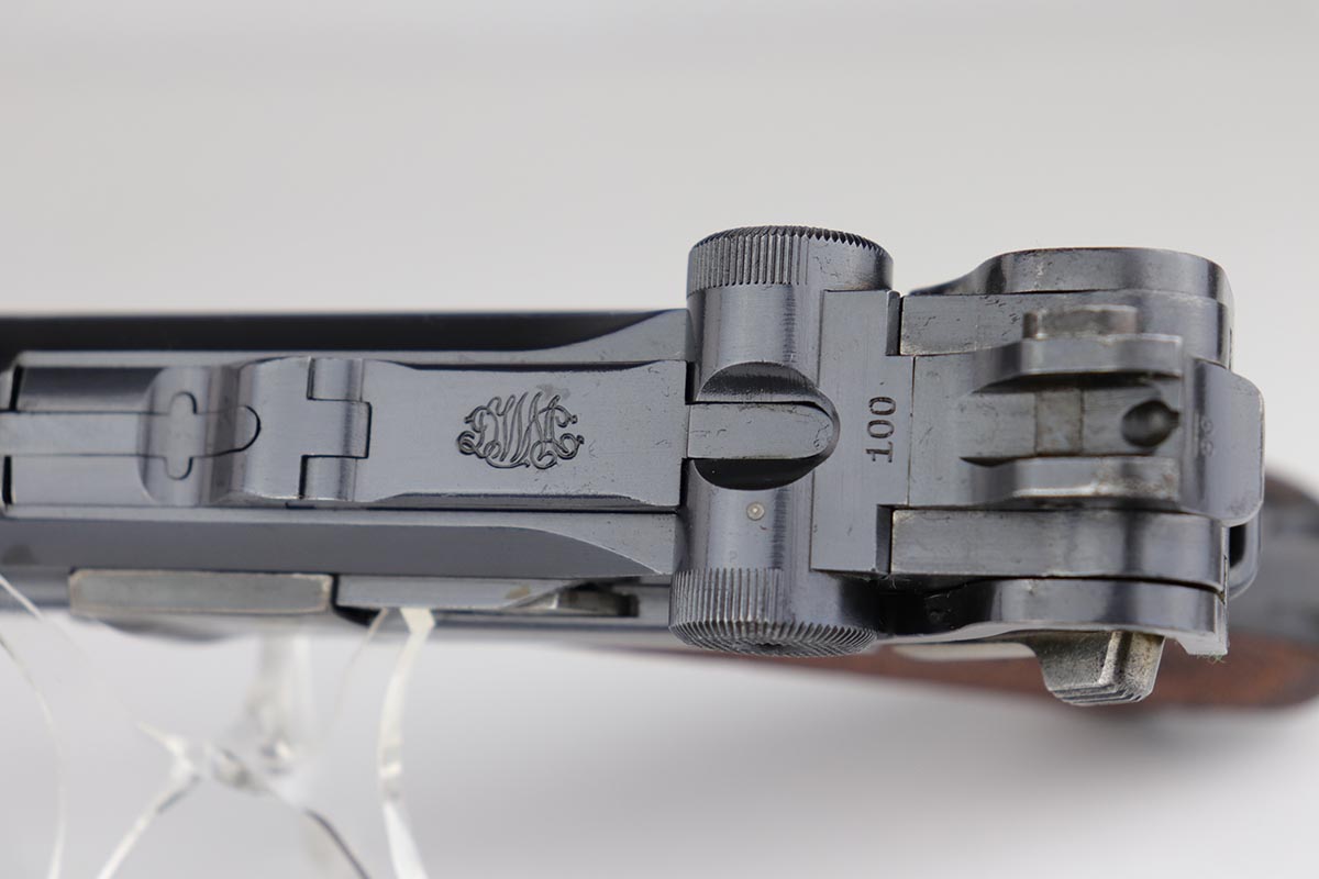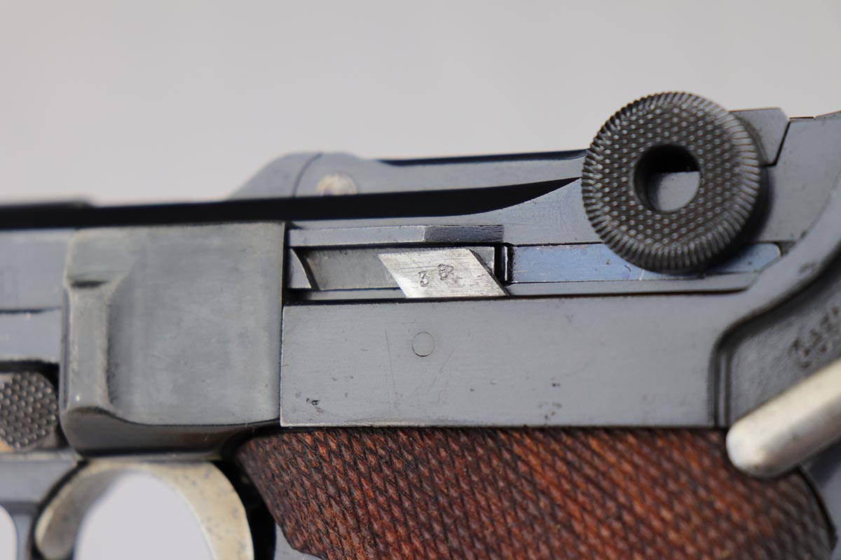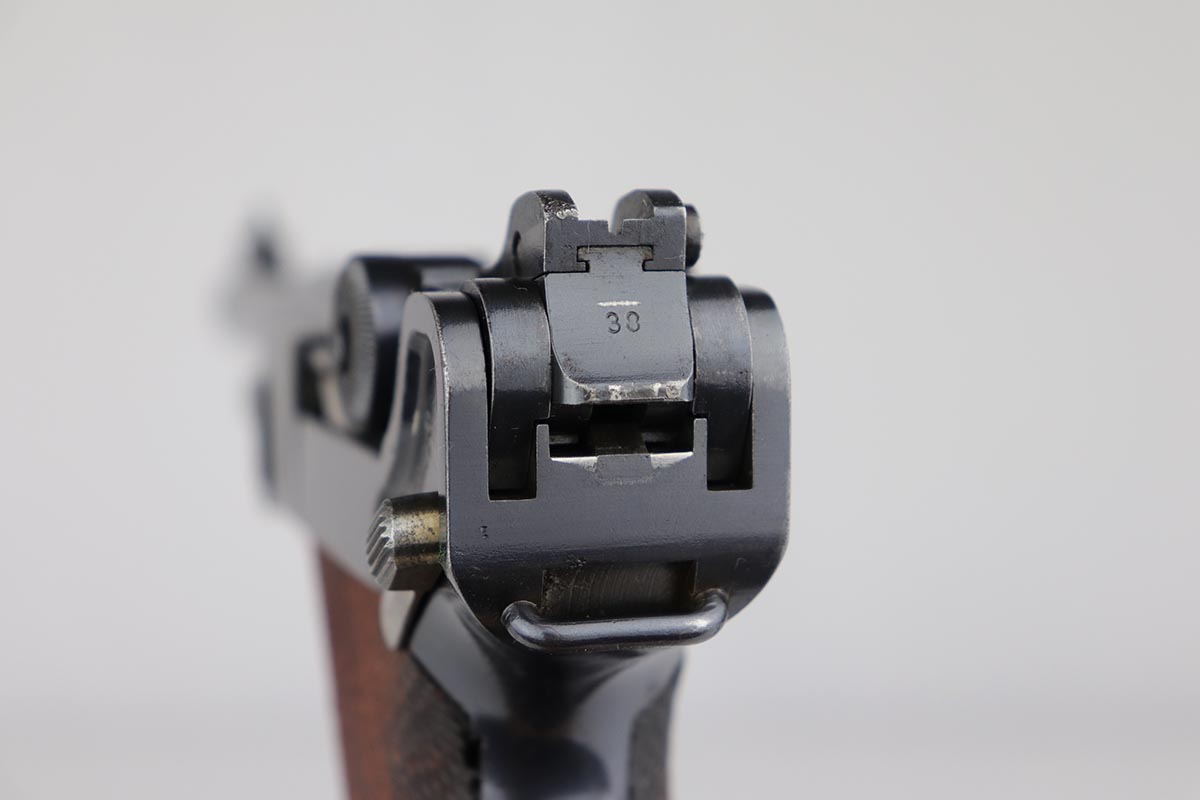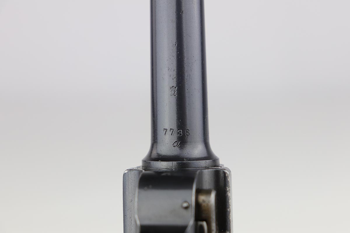 5/31/19 – This is a 1908 Navy Luger that was reworked after the Great War era. The pistol is all matching but was refurbished at some point. Bluing is excellent but likely redone, and side plate is a later refinish as it does not match the finish on the rest of the pistol. The toggle features the adjustable Navy sight, while the receiver shows the naval Crown/M proofs, and back strap features the naval property number that would’ve been seen on later Navy variants. The front sight is ‘1917’ marked, but the barrel was shortened at some point, likely to comply with treaties. Barrel is also Crown/M marked. The magazine is a Nazi era example that has no serial but was likely ground down. Grips are not numbered. Some pitting is present on the pistol, mostly on the right side rail.