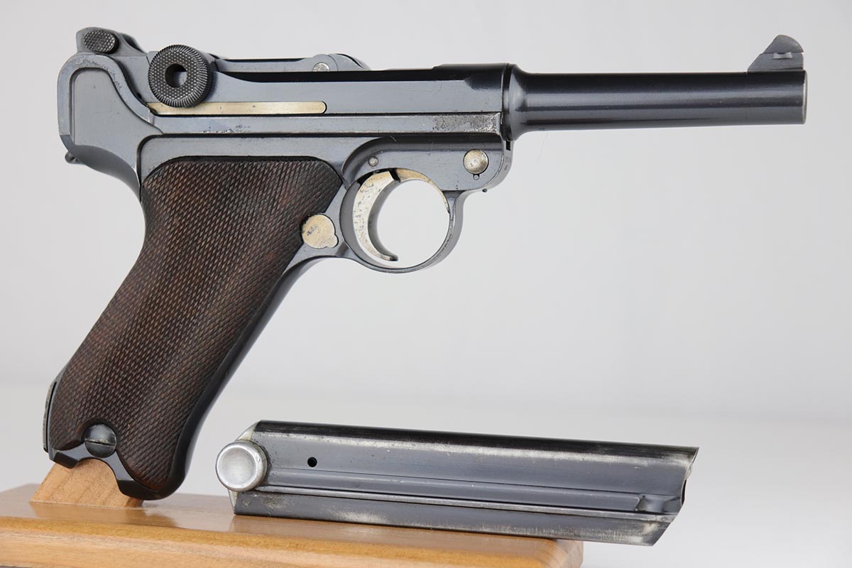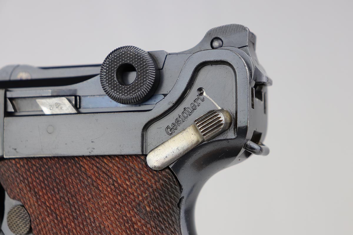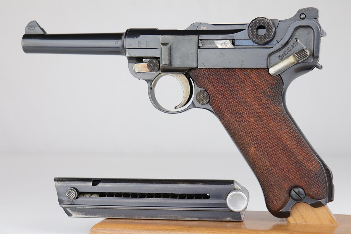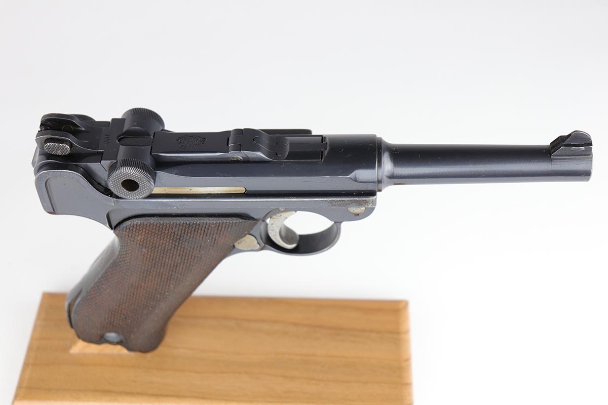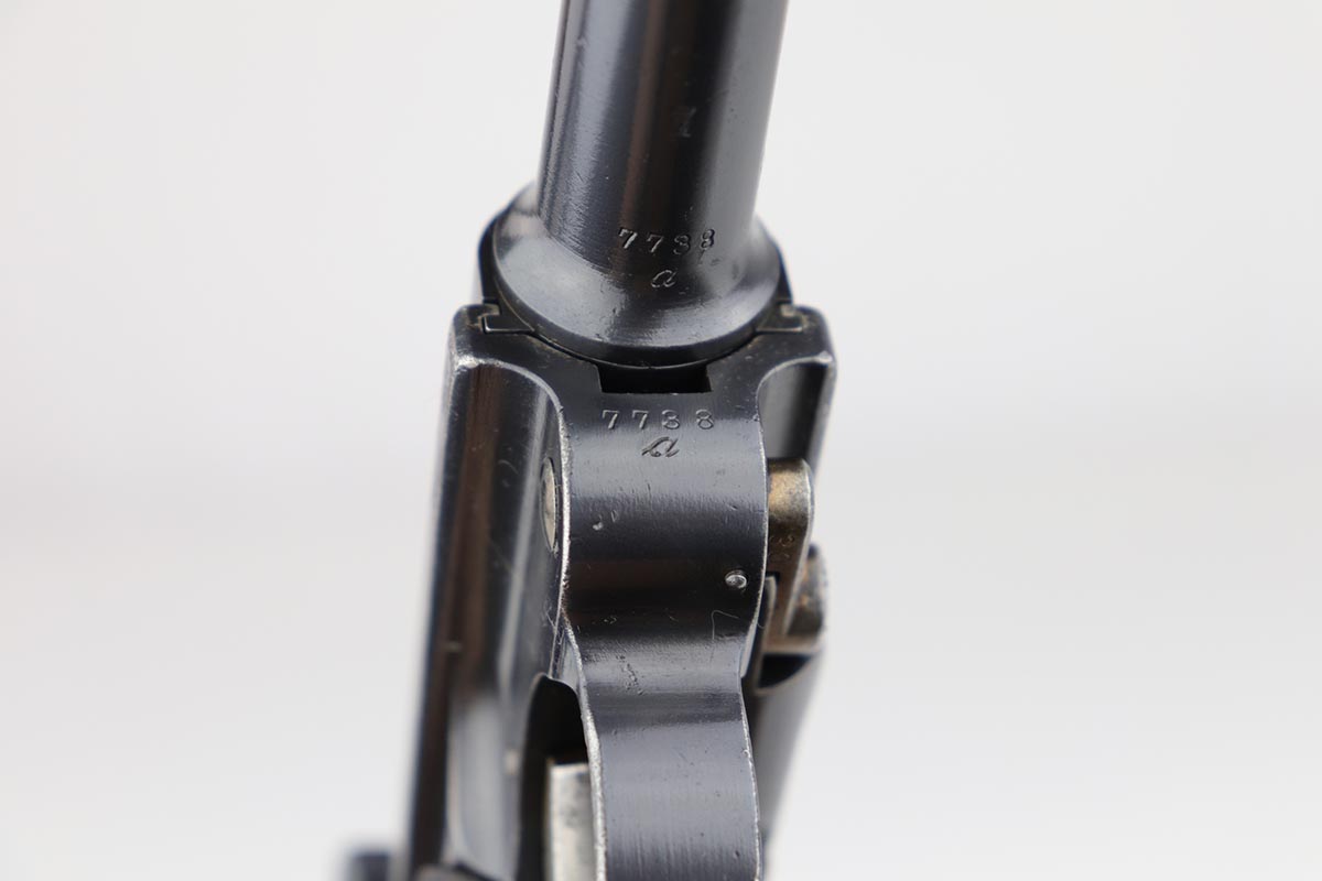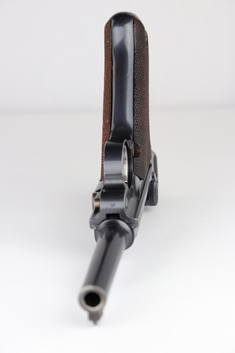 5/31/19 – This is a 1908 Navy Luger that was reworked after the Great War era. The pistol is all matching but was refurbished at some point. Bluing is excellent but likely redone, and side plate is a later refinish as it does not match the finish on the rest of the pistol. The toggle features the adjustable Navy sight, while the receiver shows the naval Crown/M proofs, and back strap features the naval property number that would’ve been seen on later Navy variants. The front sight is ‘1917’ marked, but the barrel was shortened at some point, likely to comply with treaties. Barrel is also Crown/M marked. The magazine is a Nazi era example that has no serial but was likely ground down. Grips are not numbered. Some pitting is present on the pistol, mostly on the right side rail.