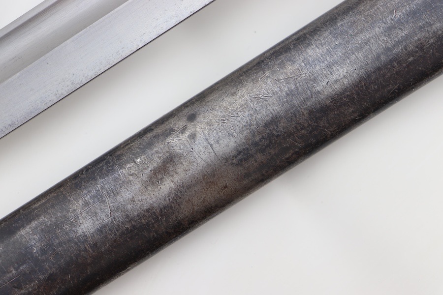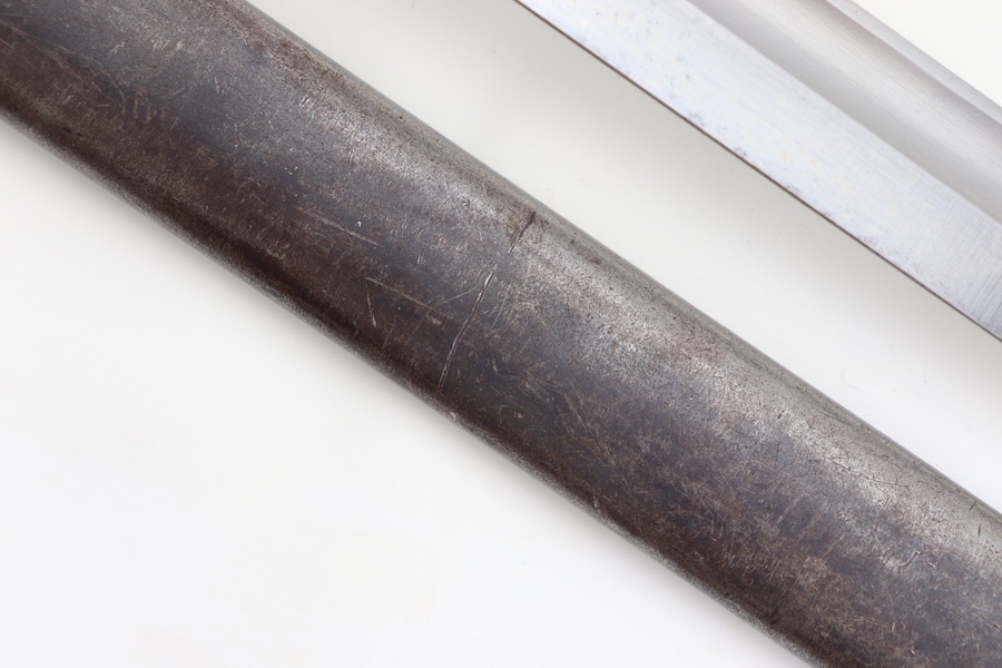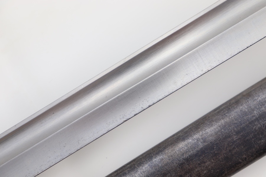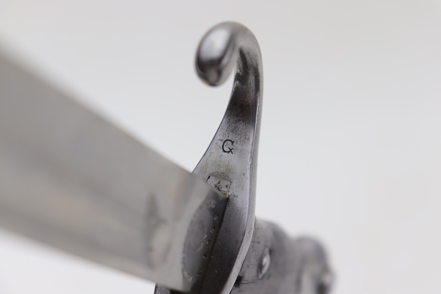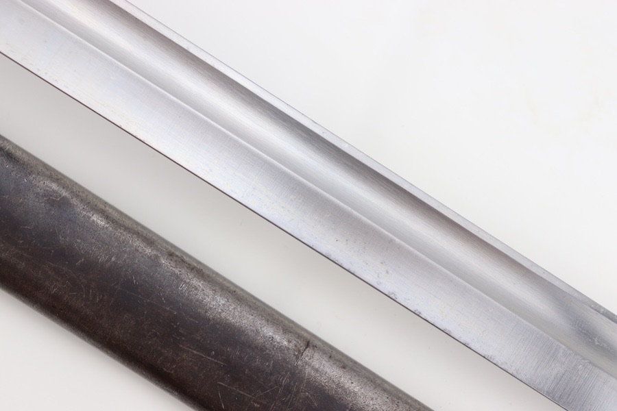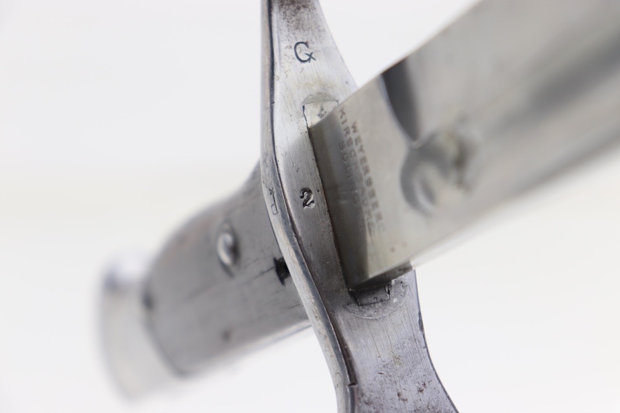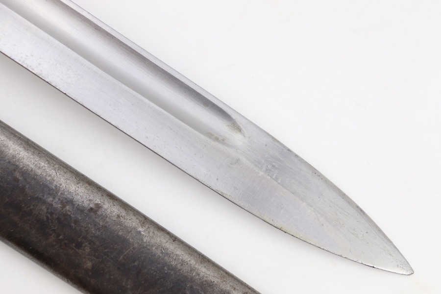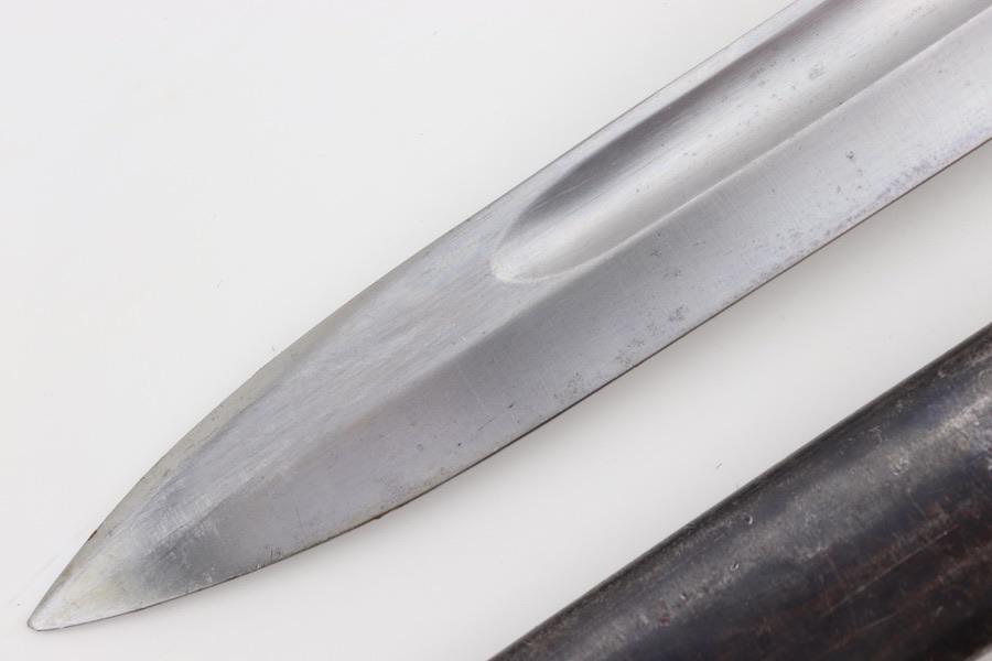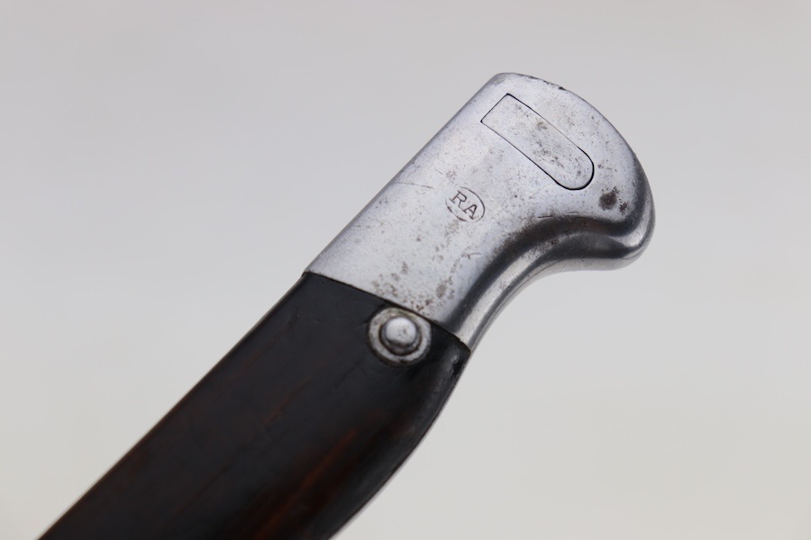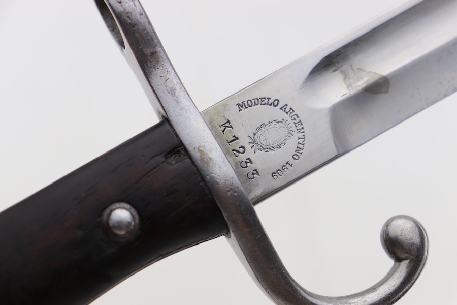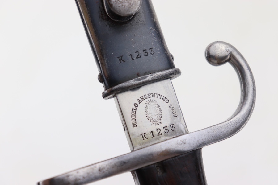 3/1/24 – This is an original and great condition 1909 Argentine Mauser bayonet. This bayonet comes with the original matching scabbard. The scabbard has some finish loss and one small dent below the frog stud. The blade has been well persevered and shows very little patina. The edge has not been sharpened. The ricasso is maker-stamped and has a serial number that matches the sheath; it reads K1233. Crossguard and pommel show some light surface patina with no significant issues. The handle is fitted with excellent dark brown wood grips that have no chips, splits, or cracks.