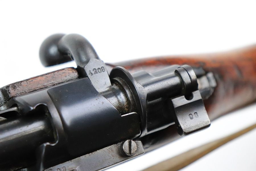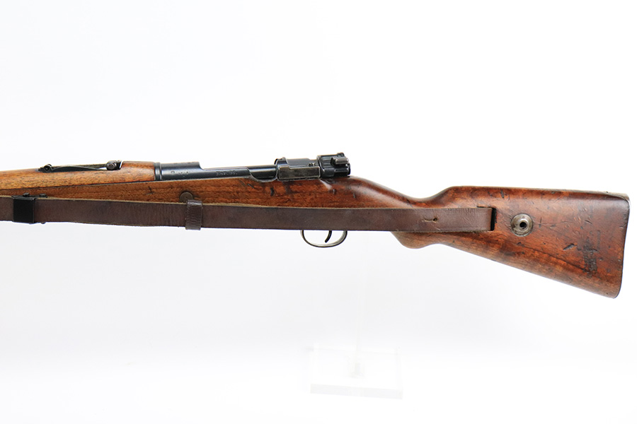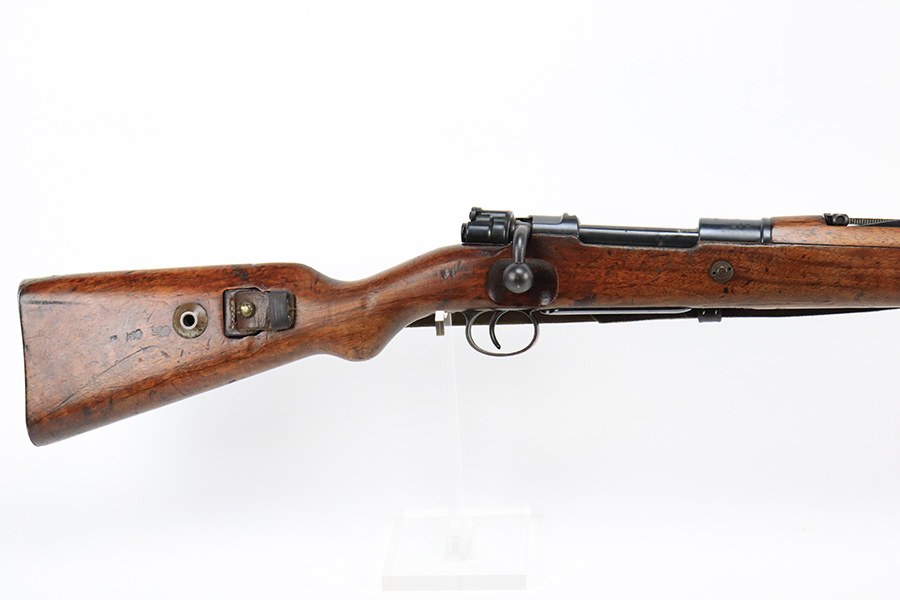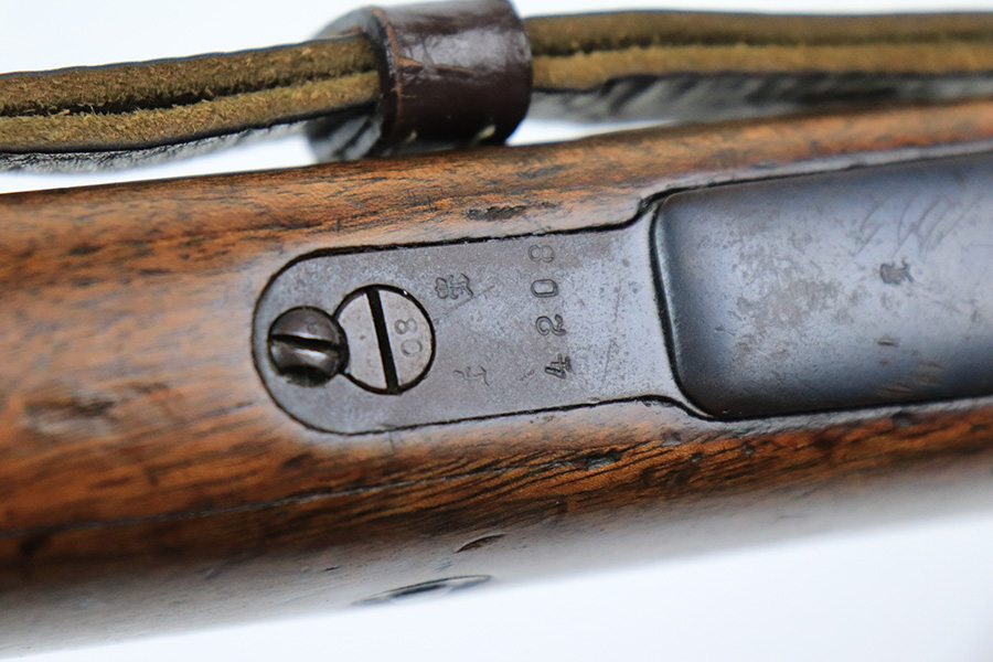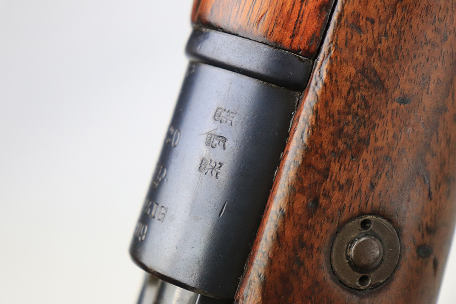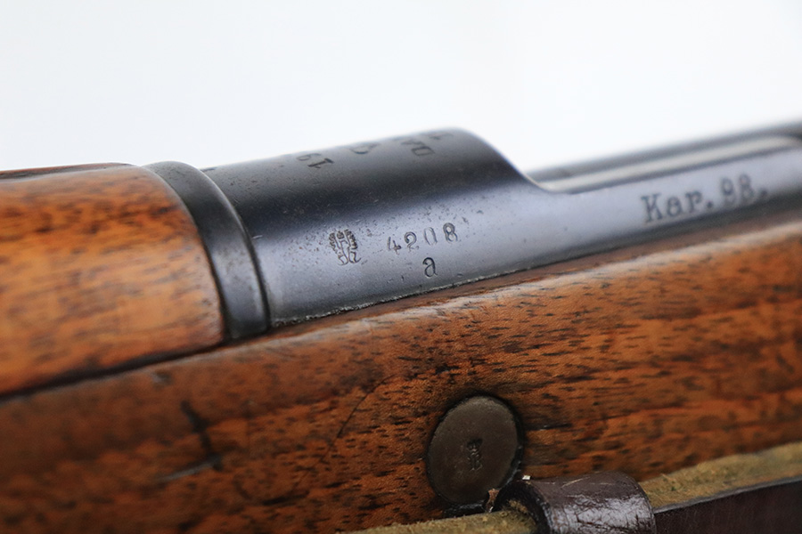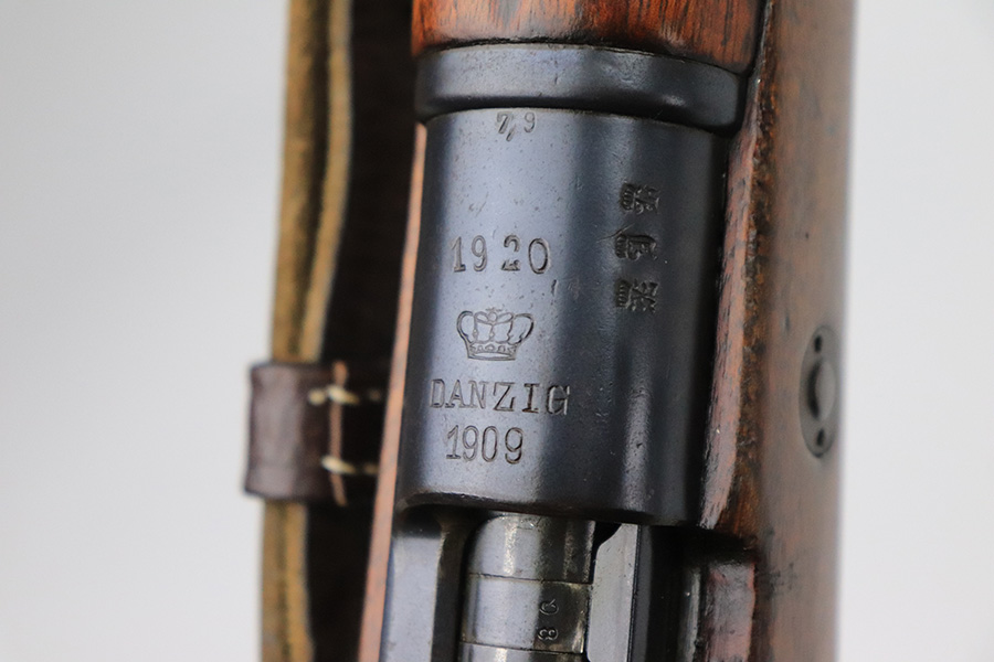 8/5/22 – This is a very nice example of a scarce, early Danzig Karabiner 98 A issued to the Imperial German Army in 1909. It is mostly matching with the proper Imperial proofs throughout. The front barrel band has been renumbered to match the receiver. The receiver is additionally dated with a “1920” stamp indicating the rifle remained in government service after WW1. This was a requirement of Germany’s compliance with the Treaty of Versailles. Rifles of this kind were typically reworked and sometimes refinished, as is the case with this rifle. The finish of the metal is consistent and shows minor oxidation and handling wear throughout. The wooden stock is numbered and matching to the receiver and is in overall nice condition showing handling wear throughout. There are imperial proofs on the right side of the stock. The bore shows good rifling but has some spots of minor frosting.
