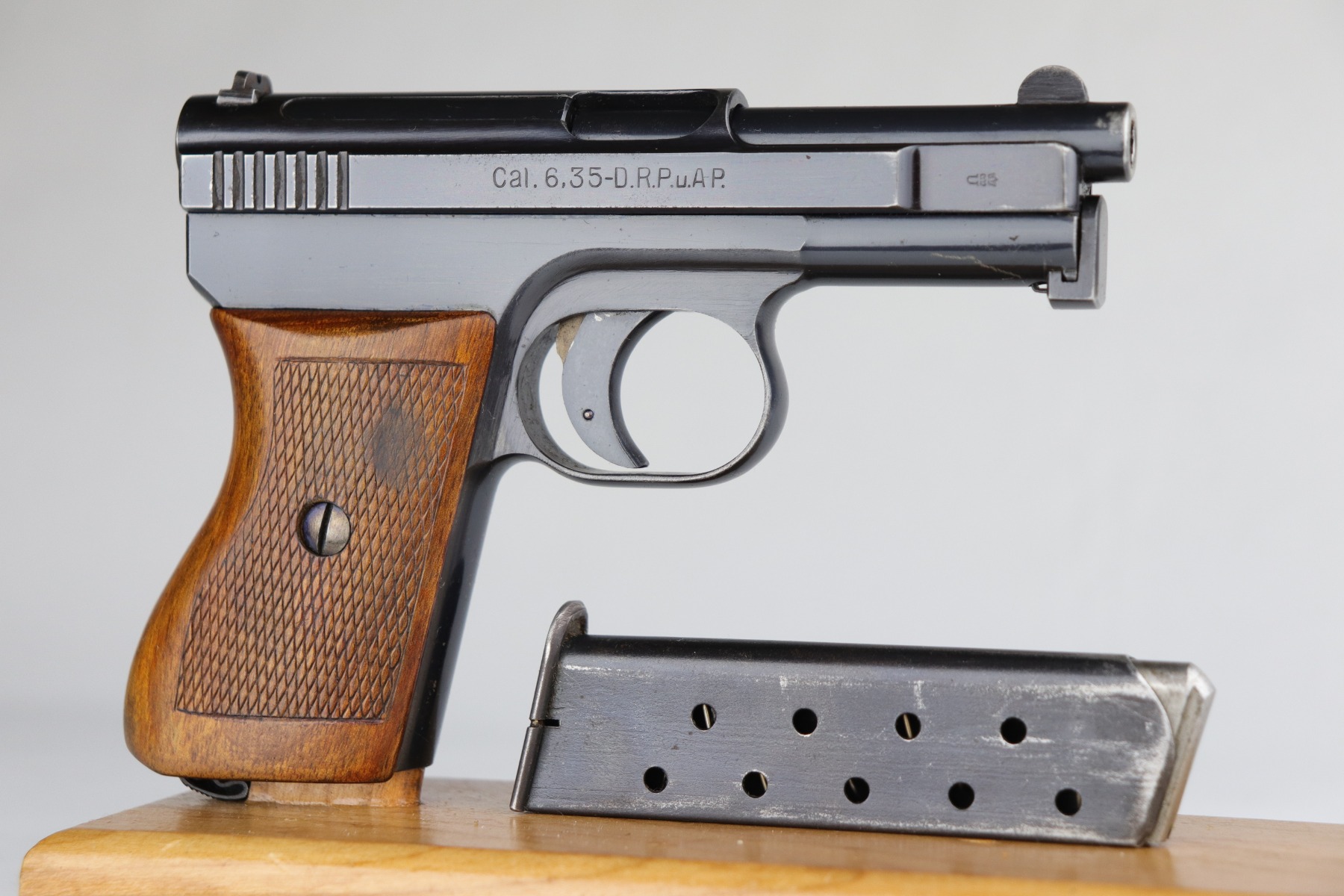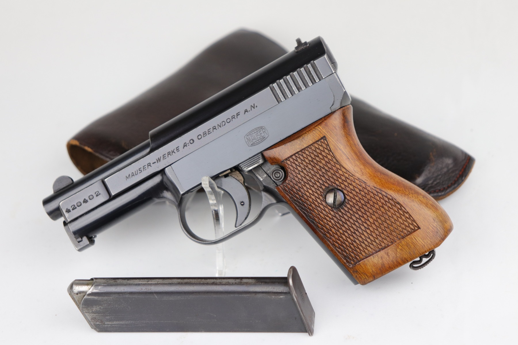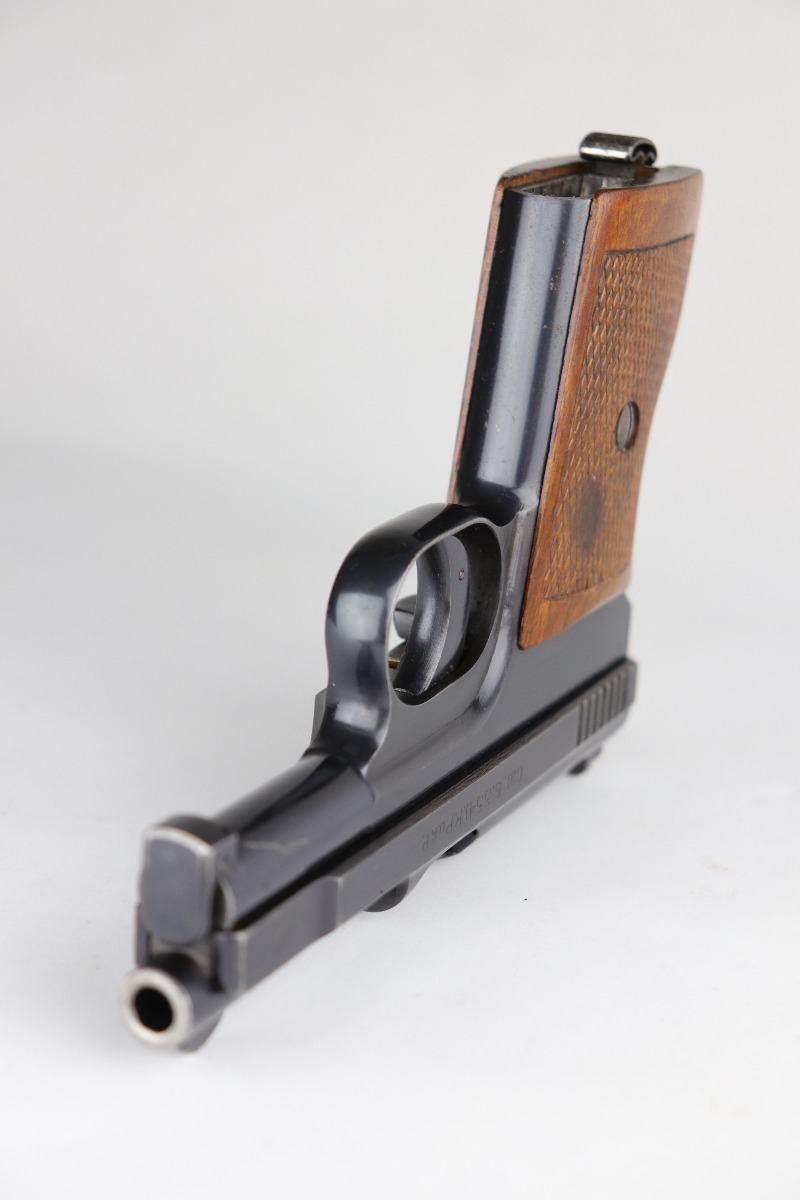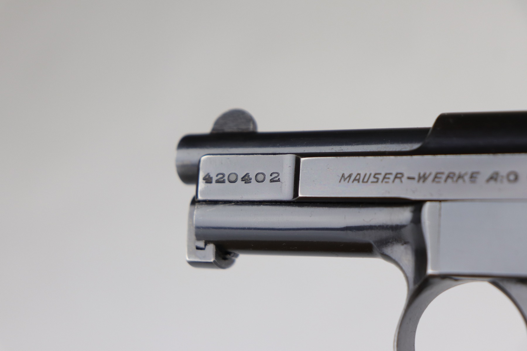 7/2/20 – This is a near-mint condition “baby” Mauser model 1910/34, made in the early 1930’s. The finish is excellent. There is a light scratch on the underside of the barrel, very minor muzzle wear, and small speckles of untextured wear on the front strap. The grips are excellent except for a small spot of wear on the right side of the grip, likely from the button on the holster. There are “Crown U” proofs on the slide and barrel. Comes with an excellent holster and a correct magazine. It seems to function well – strong action. Excellent, shiny bore.
