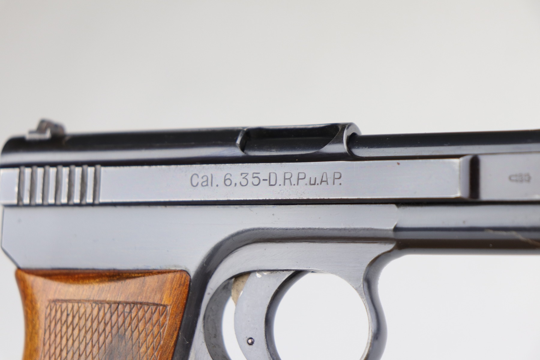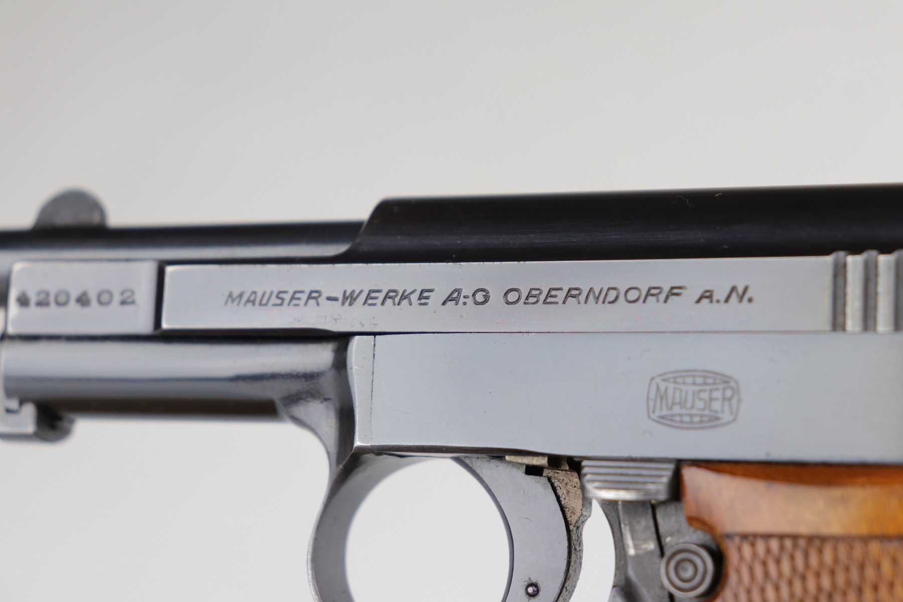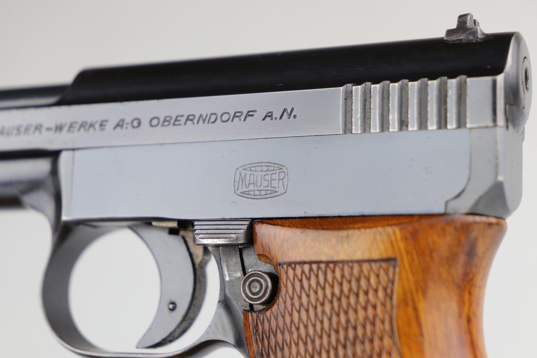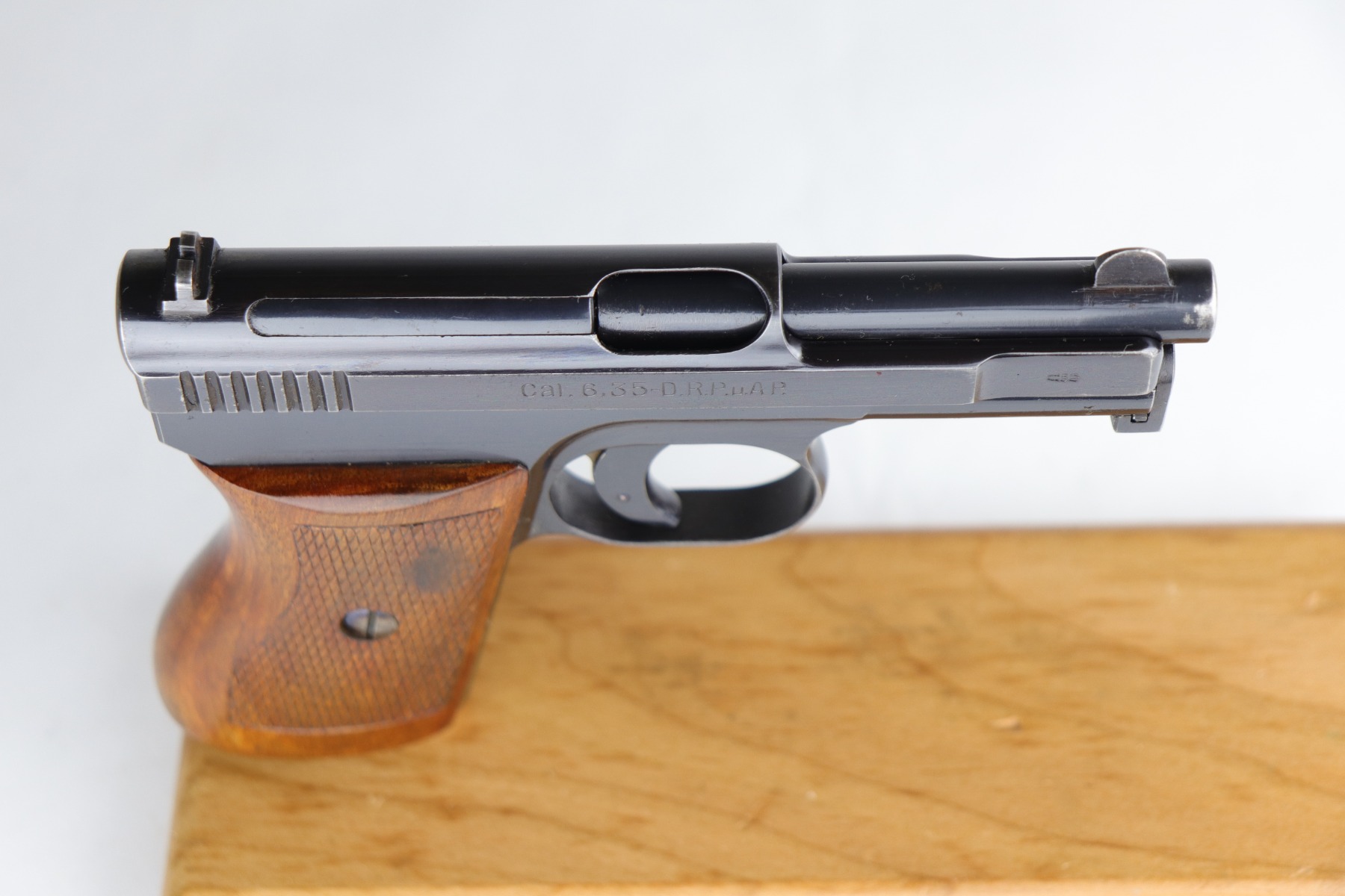 7/2/20 – This is a near-mint condition “baby” Mauser model 1910/34, made in the early 1930’s. The finish is excellent. There is a light scratch on the underside of the barrel, very minor muzzle wear, and small speckles of untextured wear on the front strap. The grips are excellent except for a small spot of wear on the right side of the grip, likely from the button on the holster. There are “Crown U” proofs on the slide and barrel. Comes with an excellent holster and a correct magazine. It seems to function well – strong action. Excellent, shiny bore.