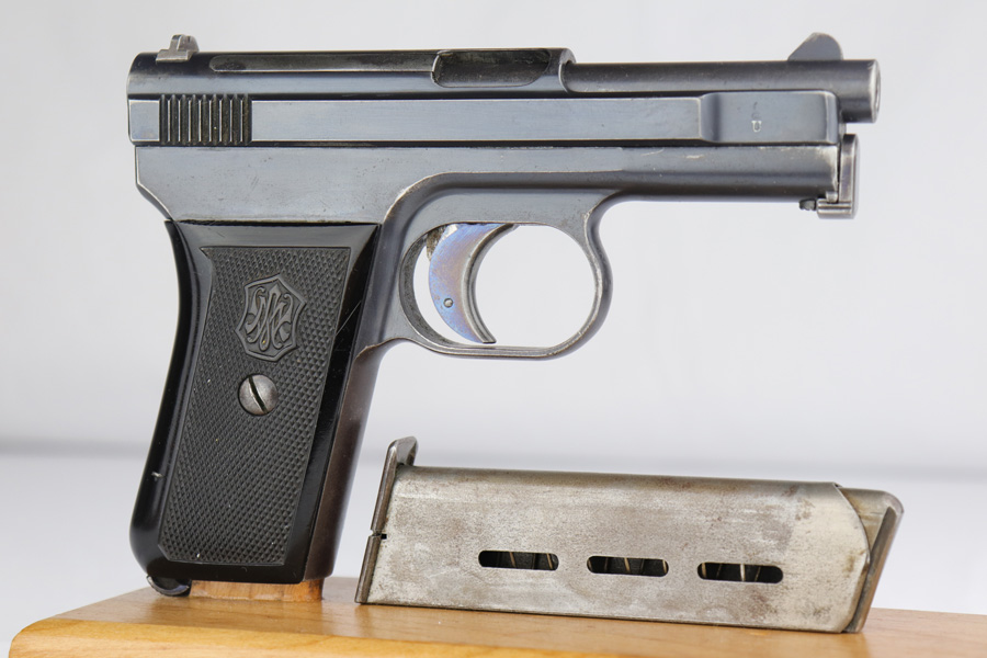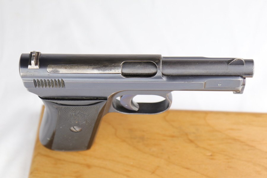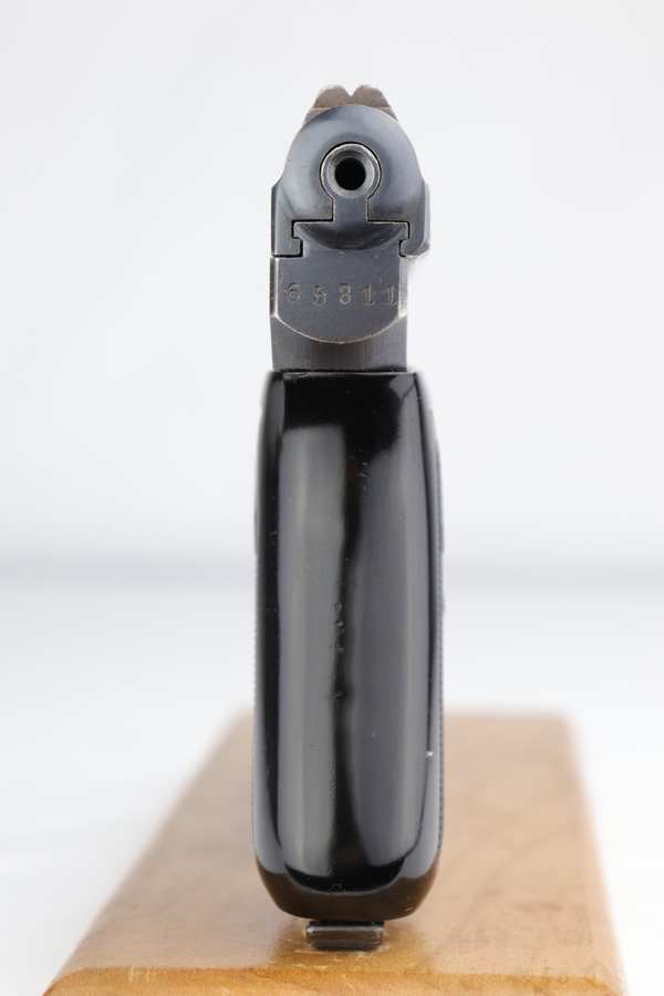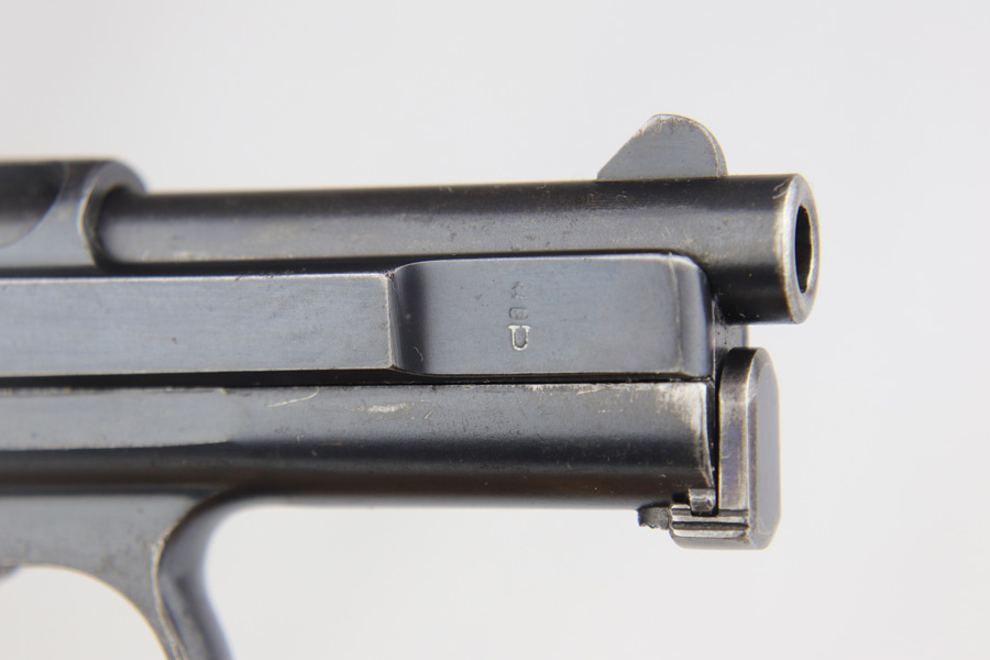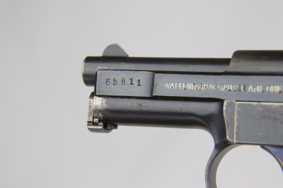 2/6/19 – This is an original Mauser model 1910 pistol made between 1914-1916 (during the WW1 era). The pistol is all original and is in good condition with about 85-90% of the original finish in tact. There’s some browning and patina on the slide and frame, as well as light pitting on the upper portion of the slide (pinpricking). Front strap is browning with most of the finish gone. The bore is nice with good rifling and some residue in the grooves, 8/10 overall. Nice original grips and a factory original magazine as well. 6.35mm pistol.