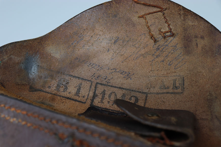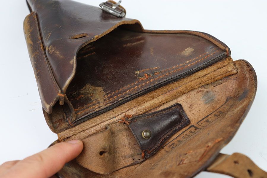 2/23/24 – This is an early WW1 Luger holster. The back of the holster is maker stamped, “A. Wunderlich Nachts” which is faint but still visible, and dated 1911. The holster has an additional interior lid ink stamp which indicates 1912 as the date. Our theory is this was made in 1911 but issued for military use in 1912. the leather is cut underneath the lid as shown. The leather is also slit at the bottom of the holster as shown. There’s some other wear throughout which is expected for its age. All original stitching is intact other than for the luger tool pouch. The lid for this pouch is disconnected but comes with the holster.