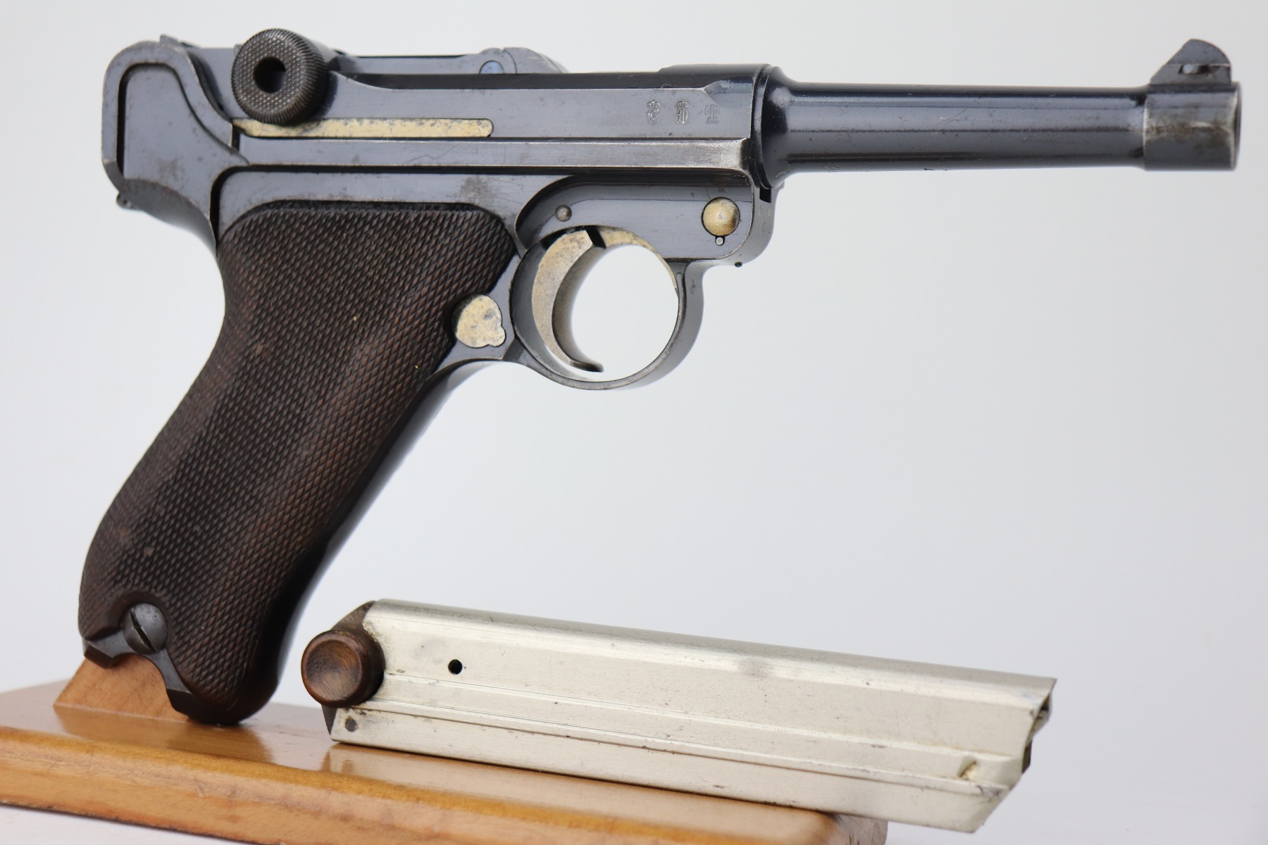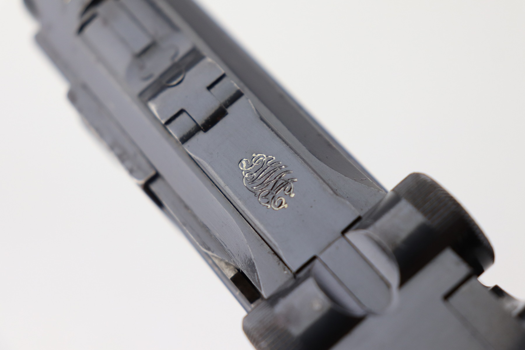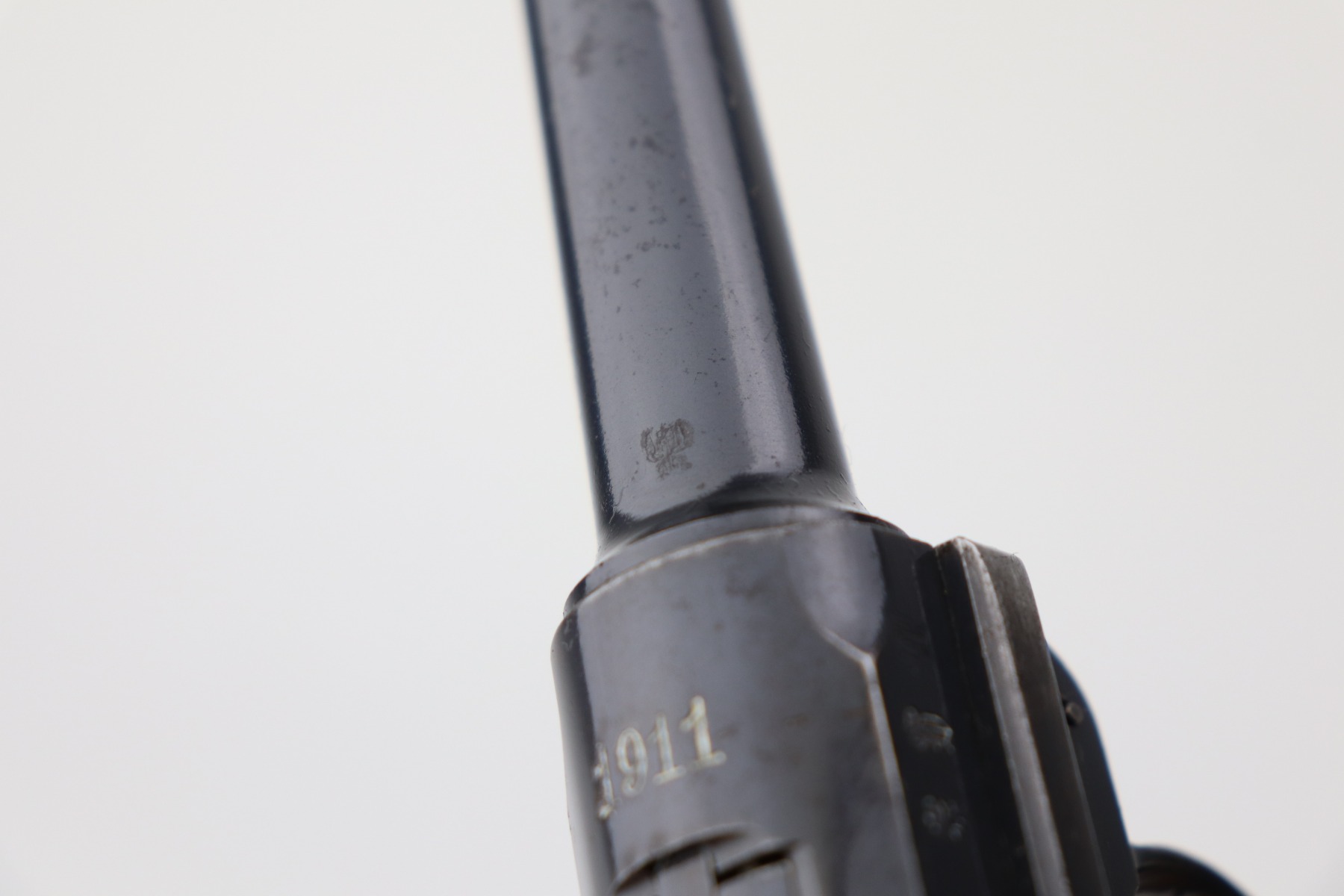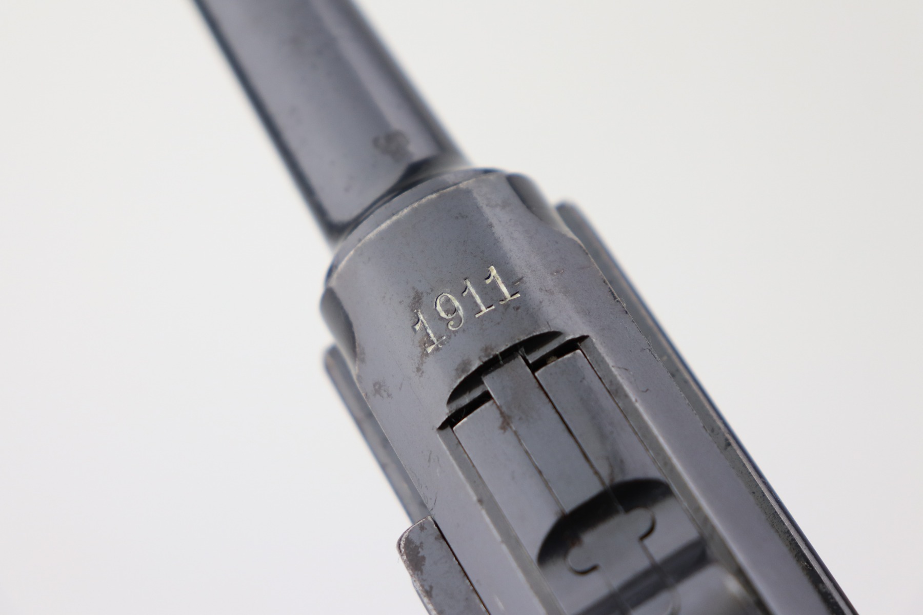 4/9/21 – This is a very nice example of a DWM Luger P.08 issued to the Imperial German military in 1911. The gun is all matching and has the proper Imperial proofs. The gun has retained about 94% of its original bluing. While there is not much actual finish loss, there is spotty oxidation and freckling throughout. There are areas of minor pitting on back strap, side plate, and barrel. There are some light dings and handling marks on the underside of the barrel. Minor wear on the side plate, high edges in general, and around the muzzle. Comes with very nice matching grips and a mismatched period-correct magazine. The bore has strong rifling with very minor pin-pricking throughout. The slide does not lock back with this magazine.