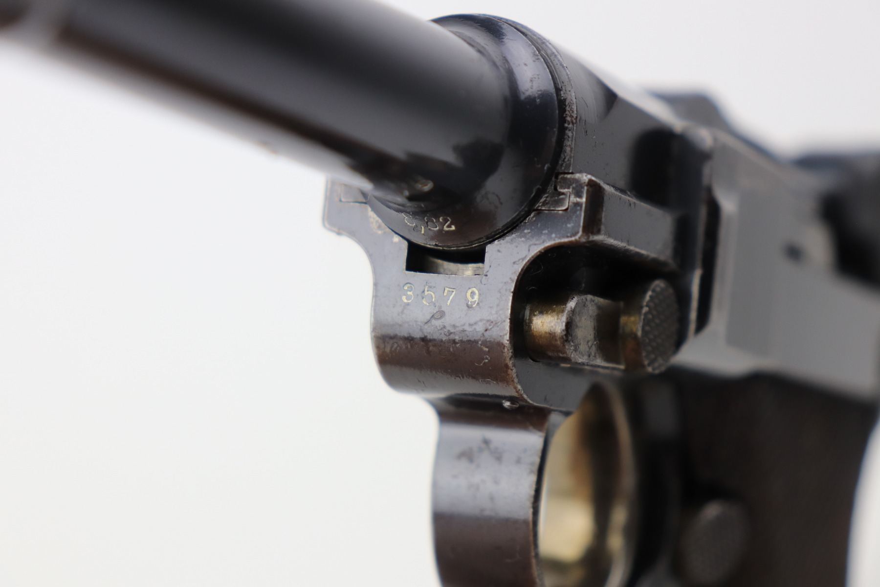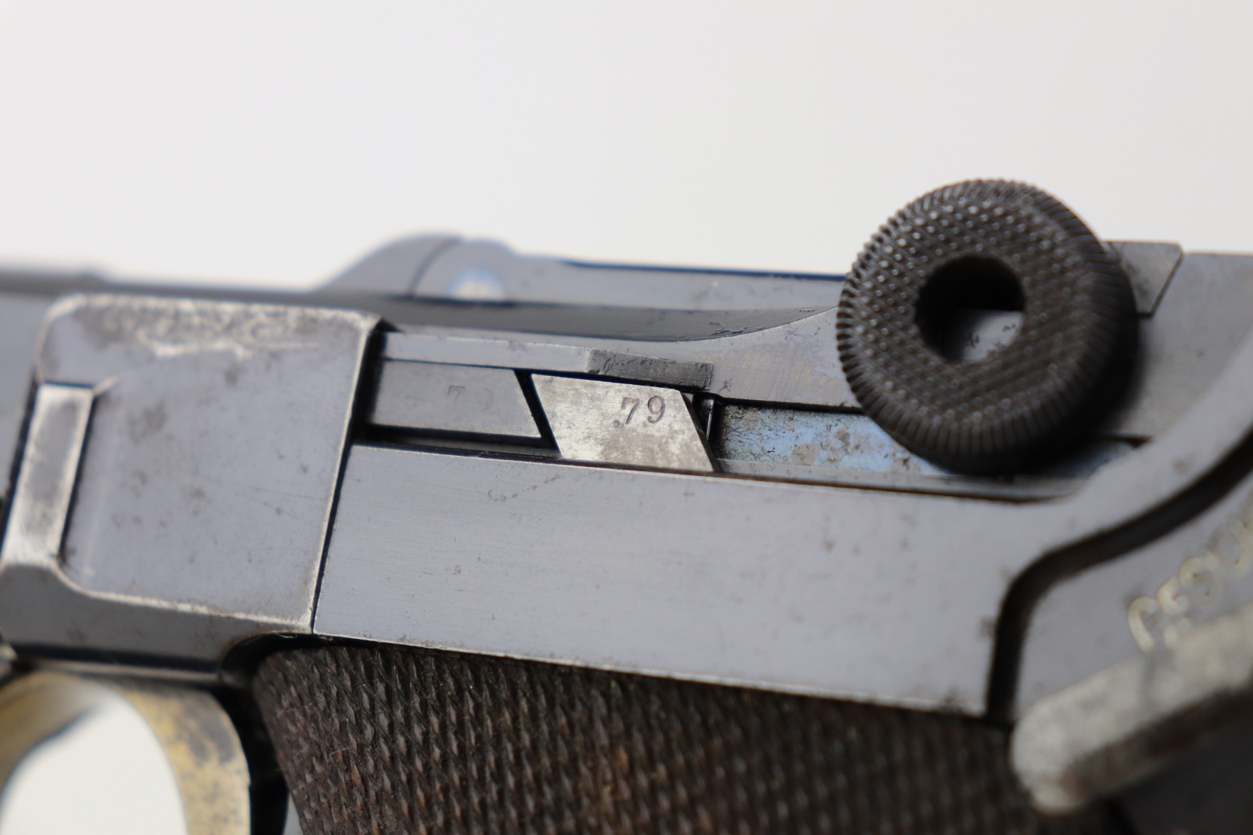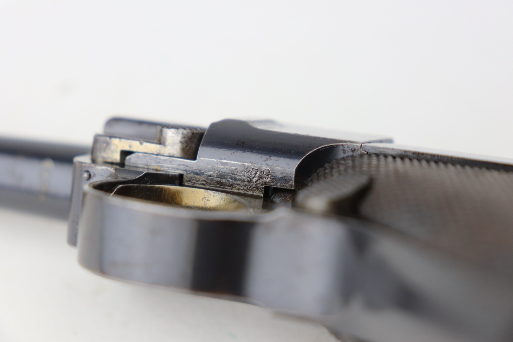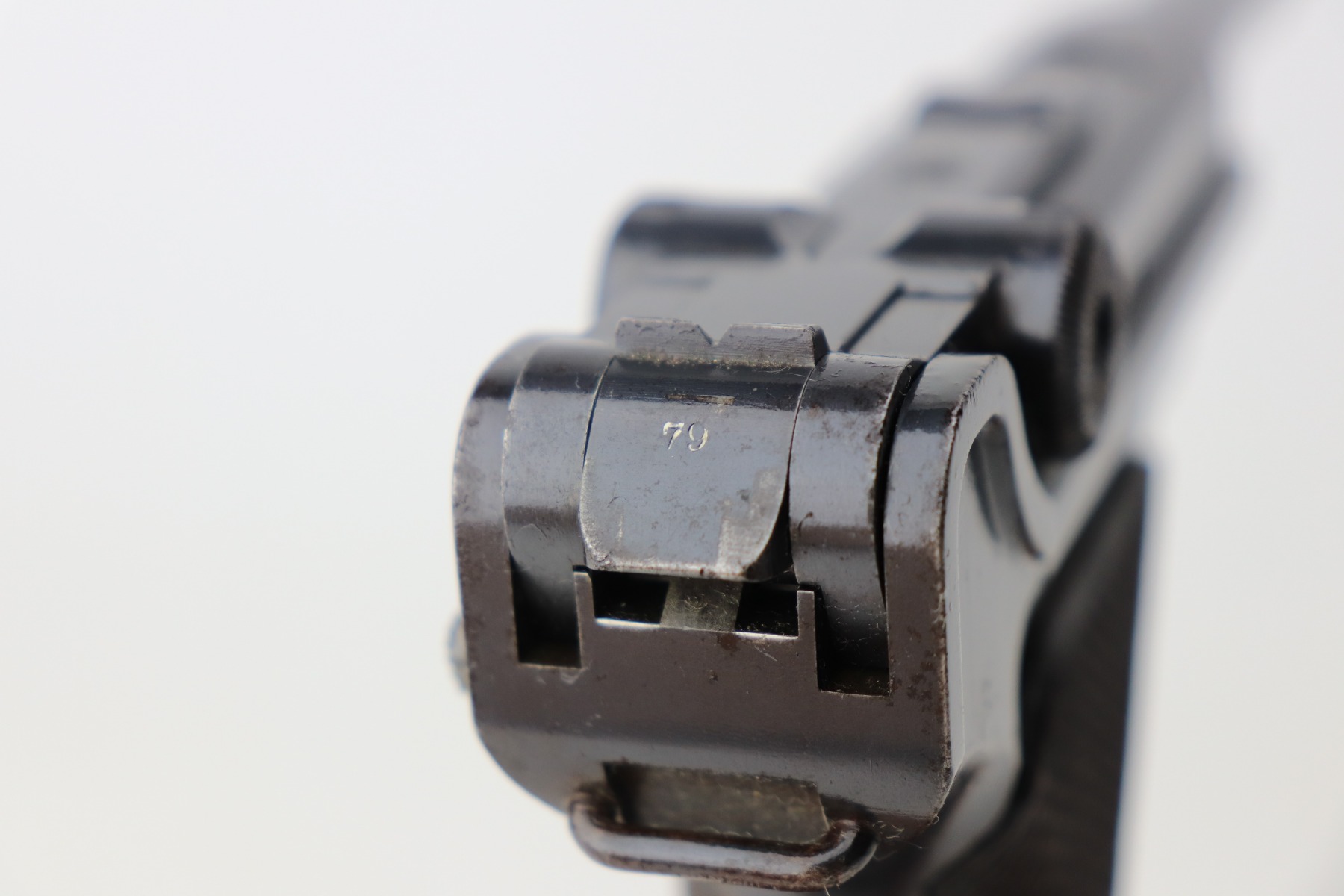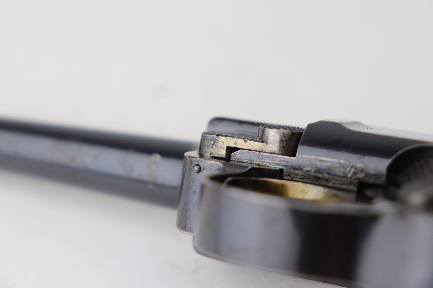 4/9/21 – This is a very nice example of a DWM Luger P.08 issued to the Imperial German military in 1911. The gun is all matching and has the proper Imperial proofs. The gun has retained about 94% of its original bluing. While there is not much actual finish loss, there is spotty oxidation and freckling throughout. There are areas of minor pitting on back strap, side plate, and barrel. There are some light dings and handling marks on the underside of the barrel. Minor wear on the side plate, high edges in general, and around the muzzle. Comes with very nice matching grips and a mismatched period-correct magazine. The bore has strong rifling with very minor pin-pricking throughout. The slide does not lock back with this magazine.