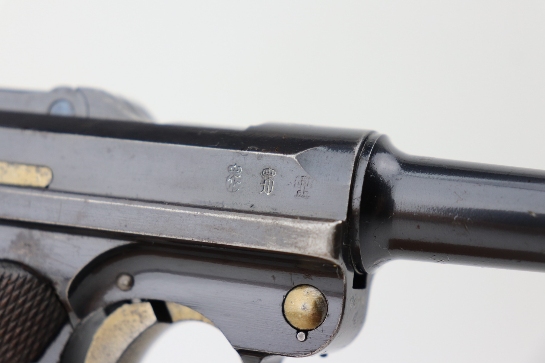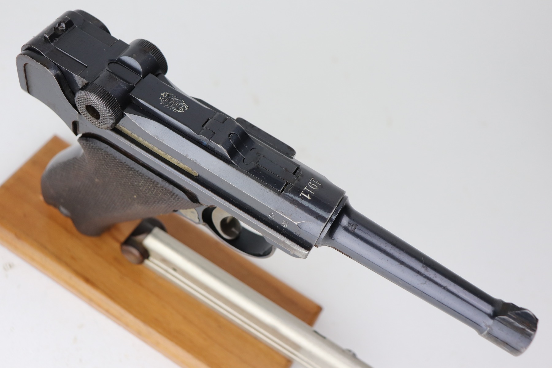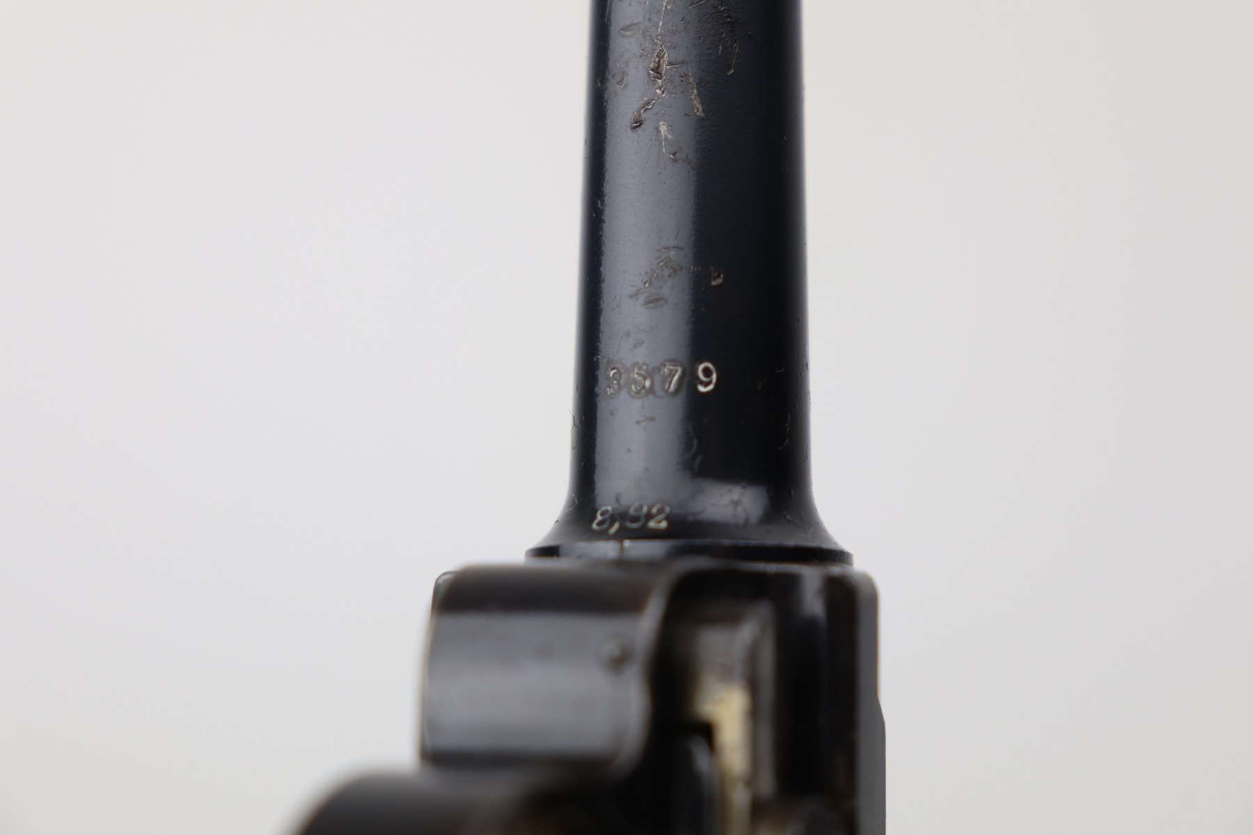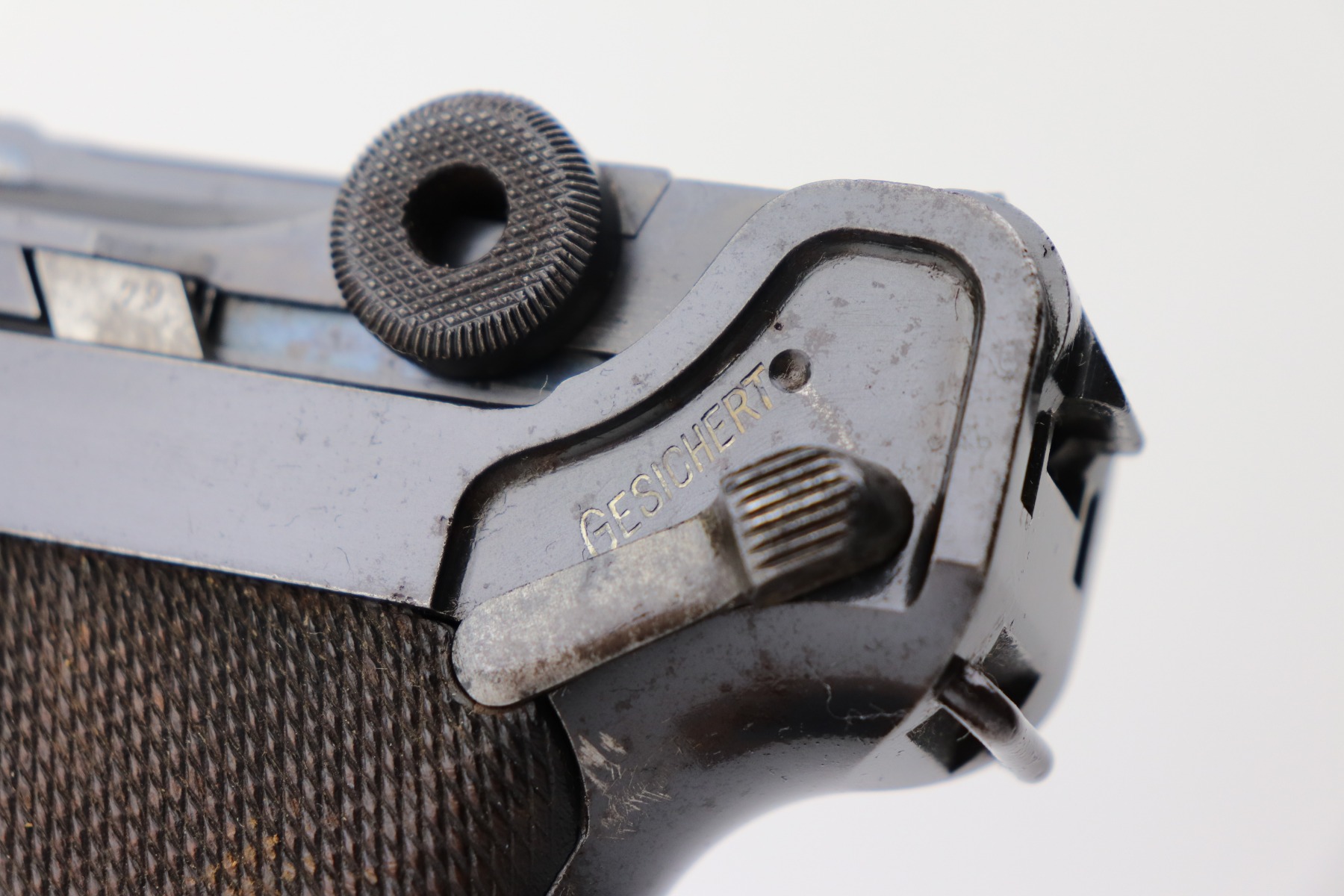 4/9/21 – This is a very nice example of a DWM Luger P.08 issued to the Imperial German military in 1911. The gun is all matching and has the proper Imperial proofs. The gun has retained about 94% of its original bluing. While there is not much actual finish loss, there is spotty oxidation and freckling throughout. There are areas of minor pitting on back strap, side plate, and barrel. There are some light dings and handling marks on the underside of the barrel. Minor wear on the side plate, high edges in general, and around the muzzle. Comes with very nice matching grips and a mismatched period-correct magazine. The bore has strong rifling with very minor pin-pricking throughout. The slide does not lock back with this magazine.