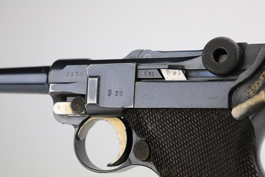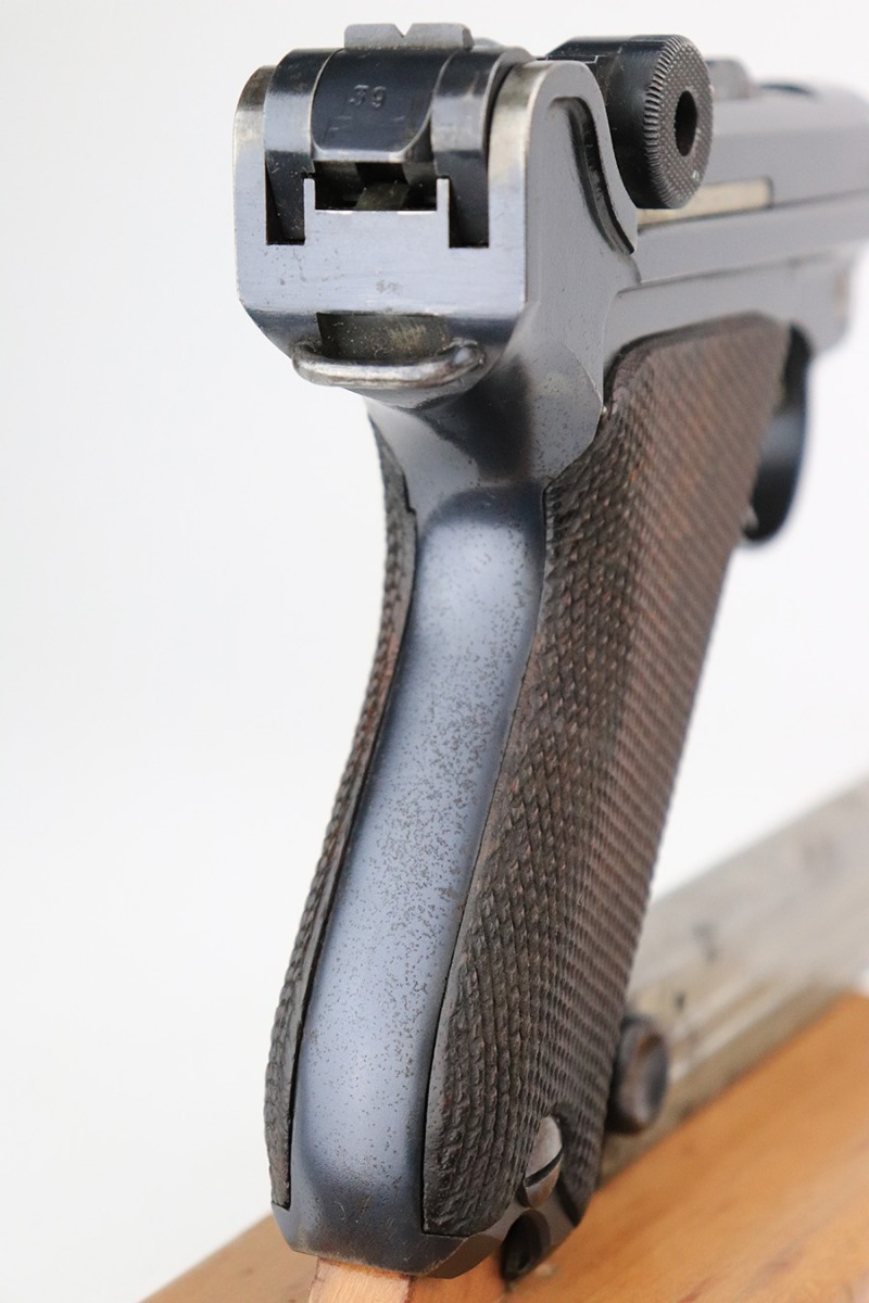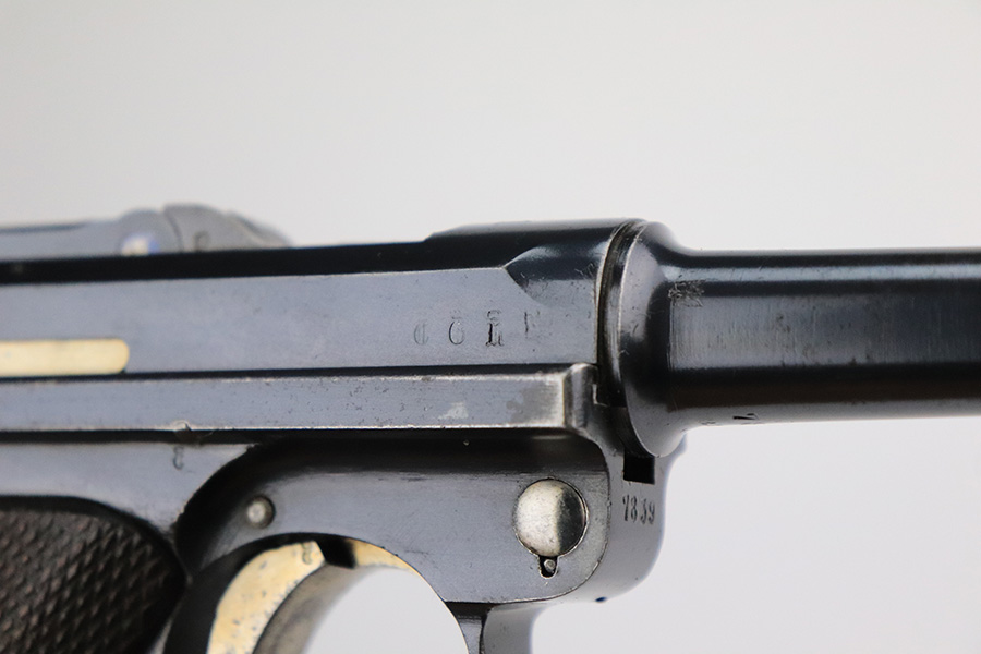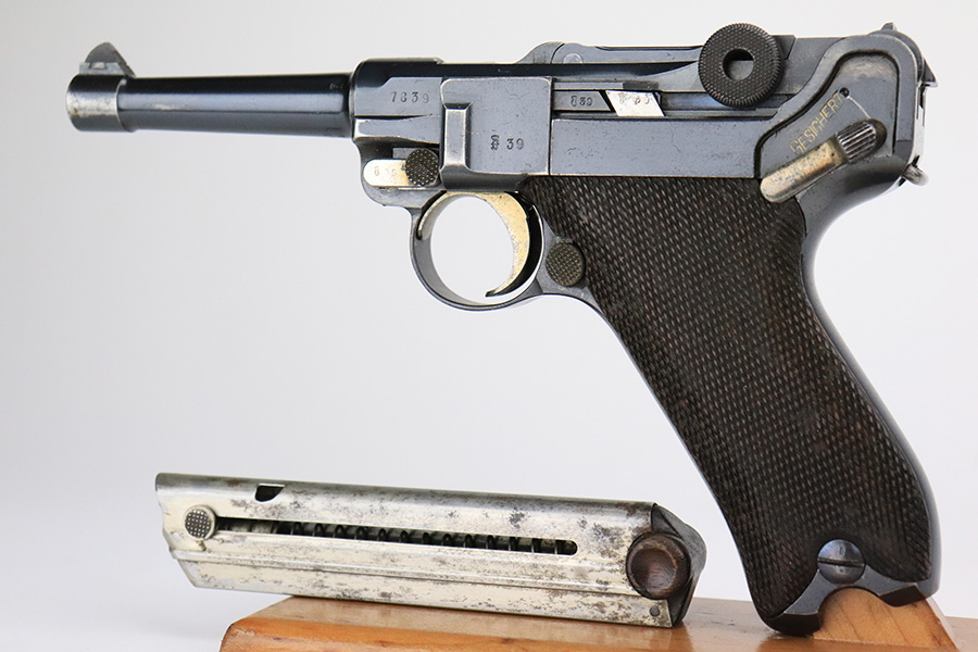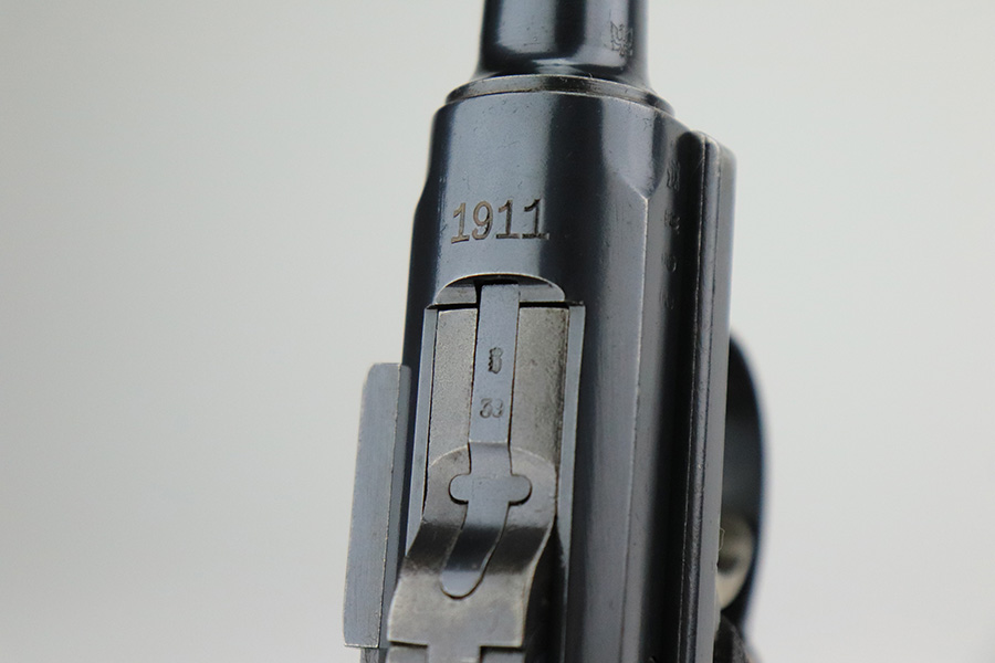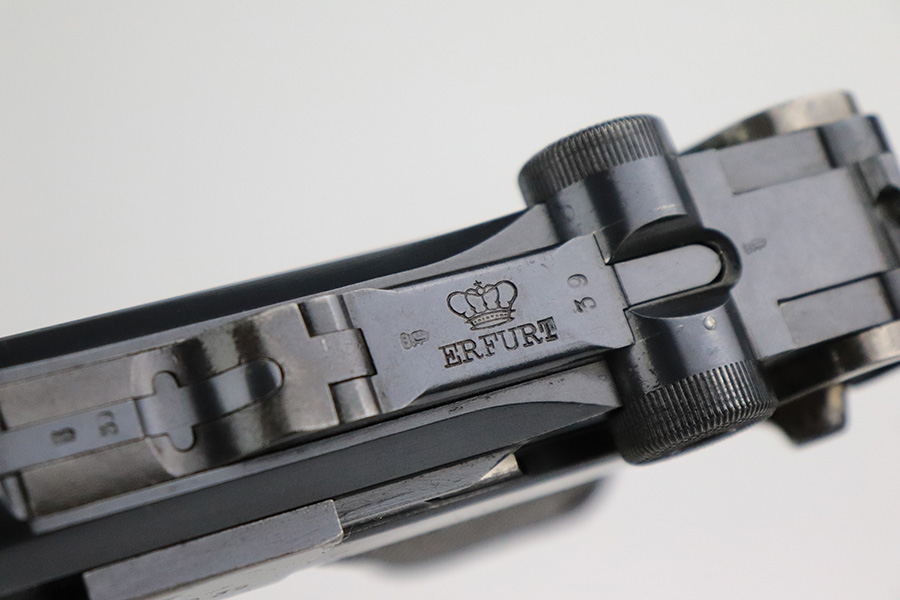 7/13/22 – This is a very nice example of an early Erfurt Luger issued to the Imperial German military in 1911. It is all matching and has the proper Imperial and Erfurt proofs throughout. It has the proper early features such as no hold open (originally) and no stock lug on the back strap. A hold open was added later. It has retained about 96% of its original finish. Areas of very minor on the side plate, side rails, around the muzzle, and at the base of the straps. While there is very little actual finish loss, there are tiny dots of oxidation on most of the gun, most noticeable on grip straps. Comes with very nice matching-numbered grips and a blank bottom magazine – a couple of tiny chips in the wood. Very nice bore with great rifling.