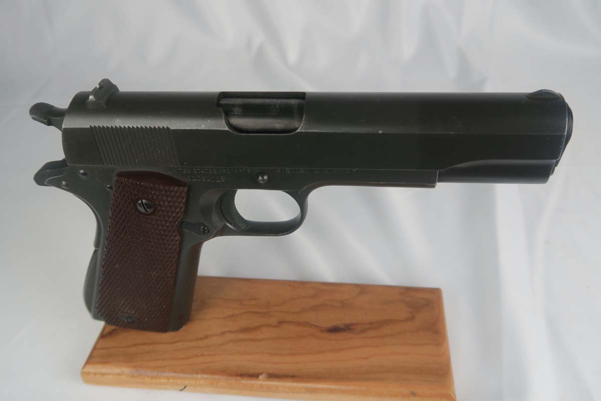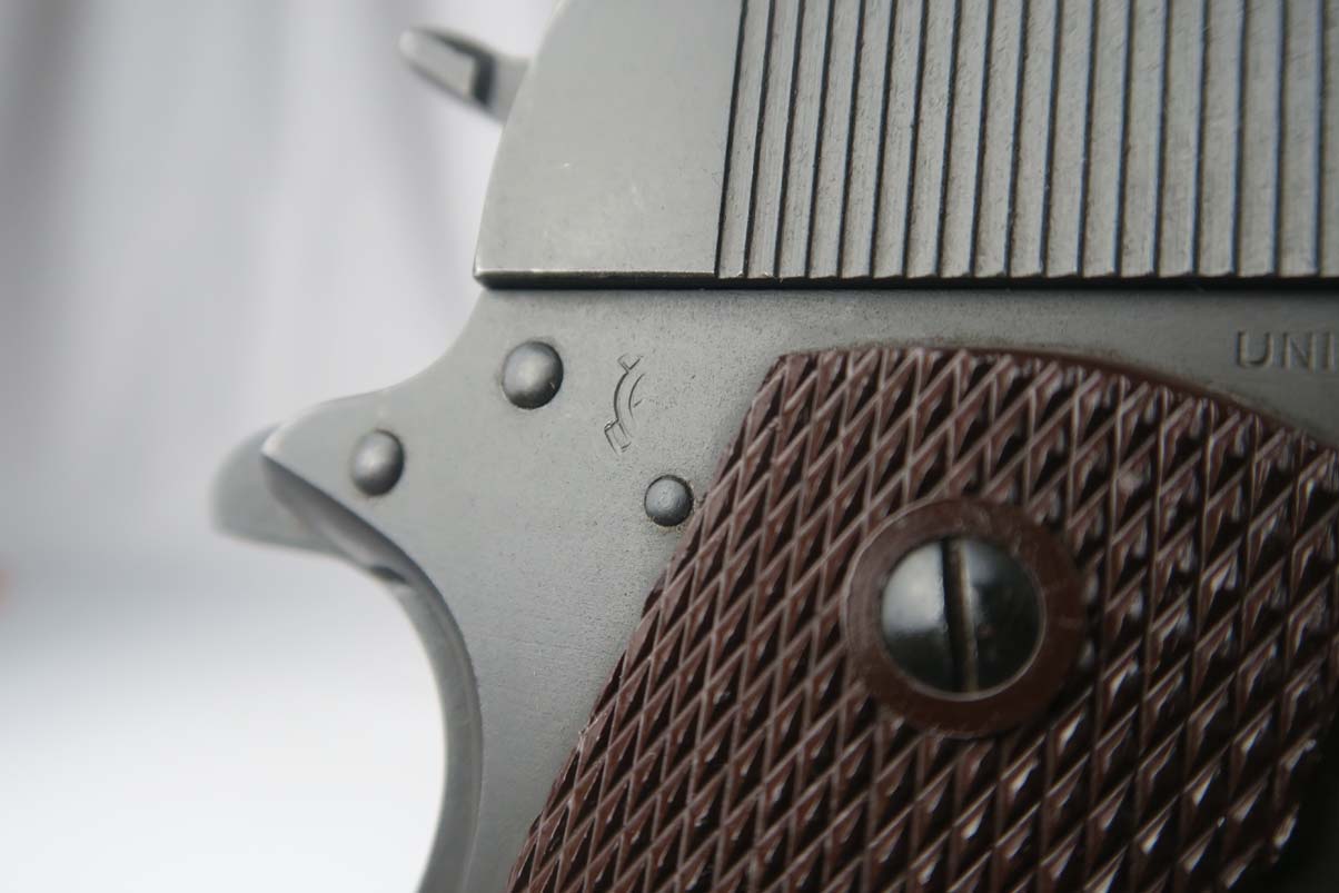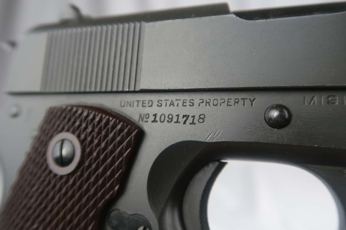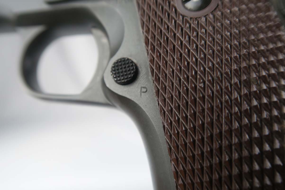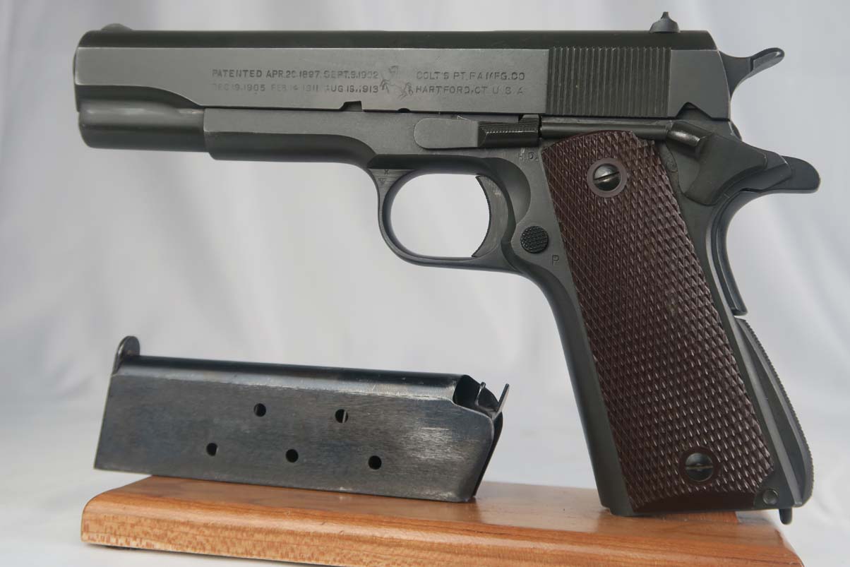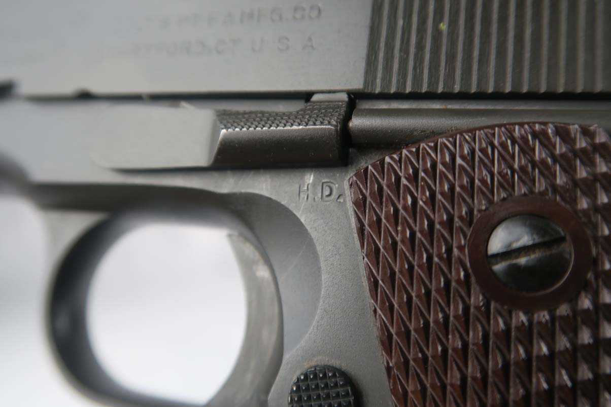 3/20/17 – This is a US Army, WW2 issued, original Colt.   The serial number places it to a 1943 manufacture date.   The original parkarized finish is excellent and covers about 98% of the gun.  The slide has that correct “two tone” color to it with a visible line about an inch from the muzzle demonstrating an original finish.   Most wear is either minor holster wear or rub marks from the slide being moved.   The slide legend has the Rampart Colt in the middle of the logo.   The slide is unnumbered.   Small parts appear to be all correct for the gun – it was not reworked or arsenal refurbished.   The barrel is correct for the gun as well and marked Colt – 45 Auto.   The bore is strong but with frosting especially in the groves.   On a scale of 1 to 10, I would give it a 6.    Correct wartime plastic grips.  Also correct wartime magazine as the base is marked with an L.
