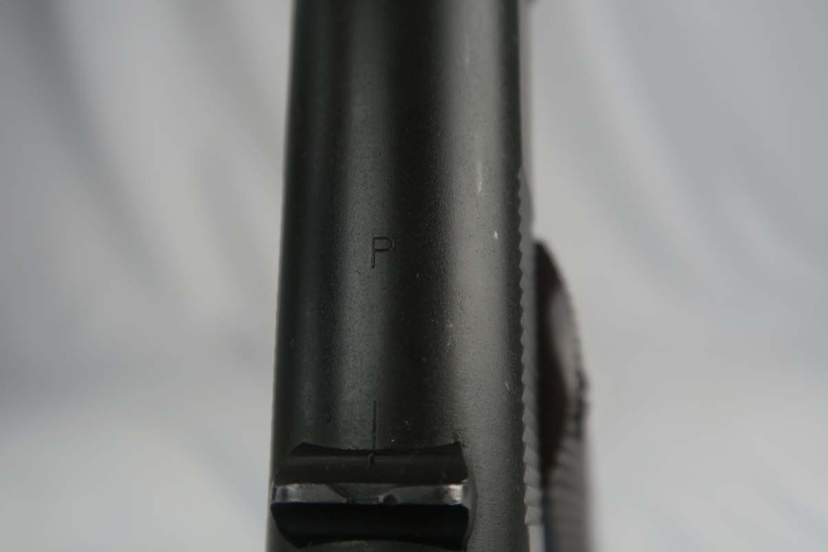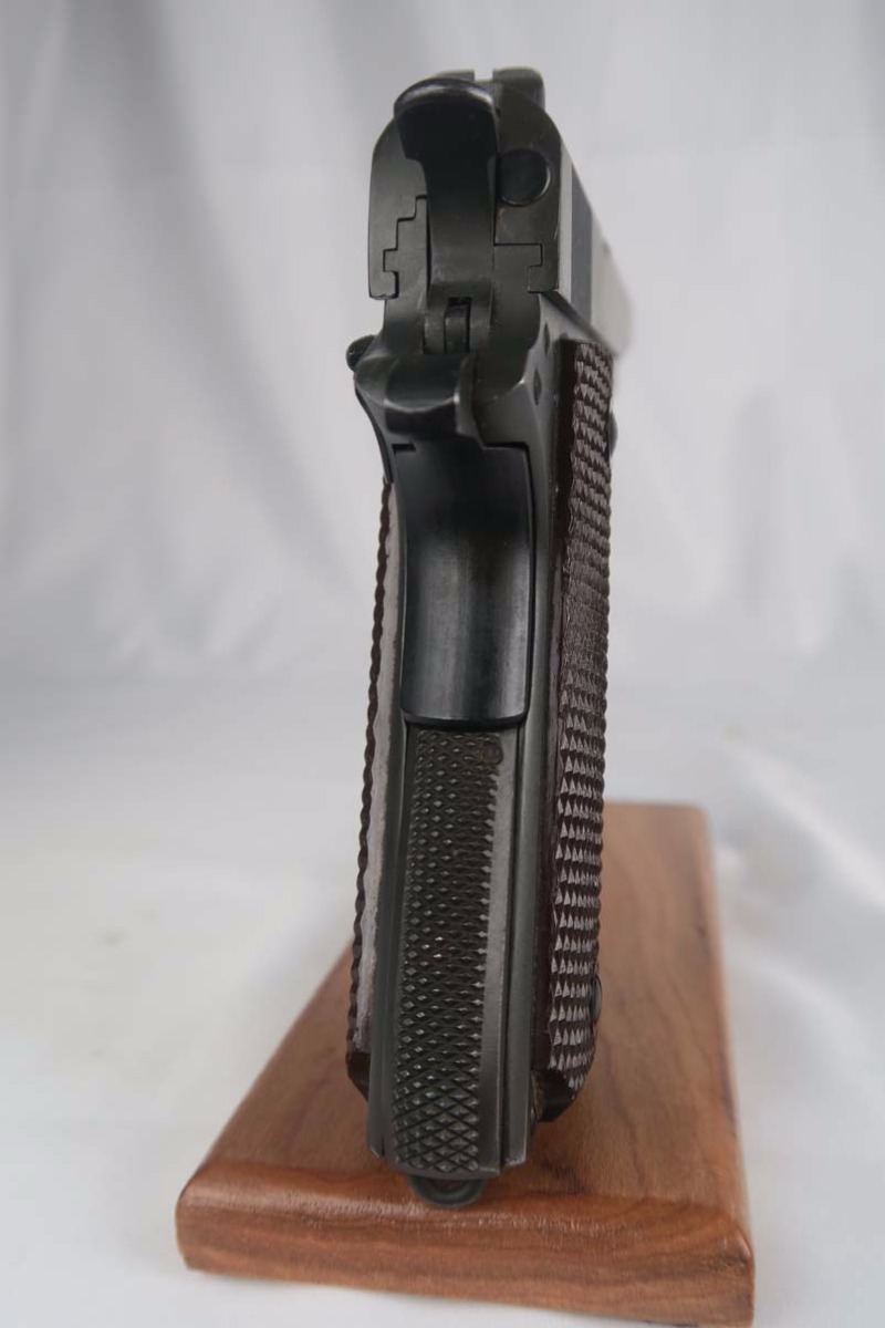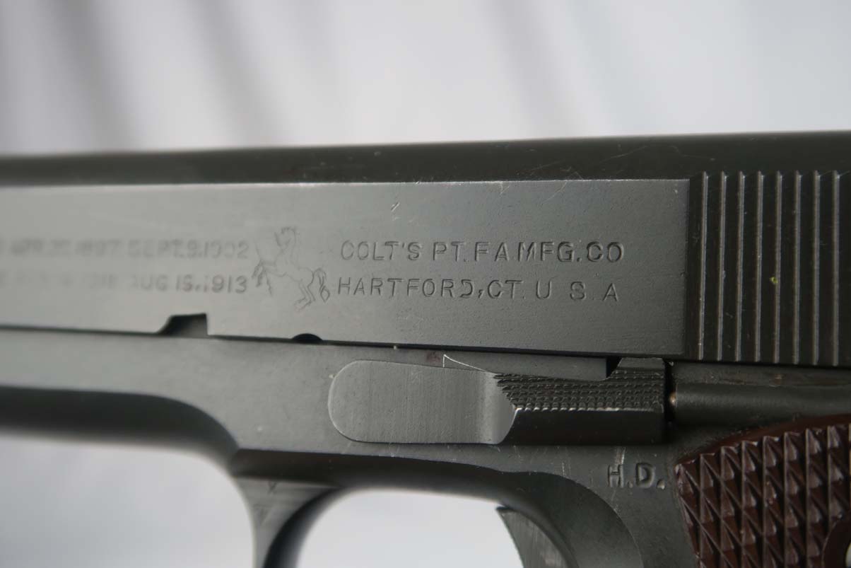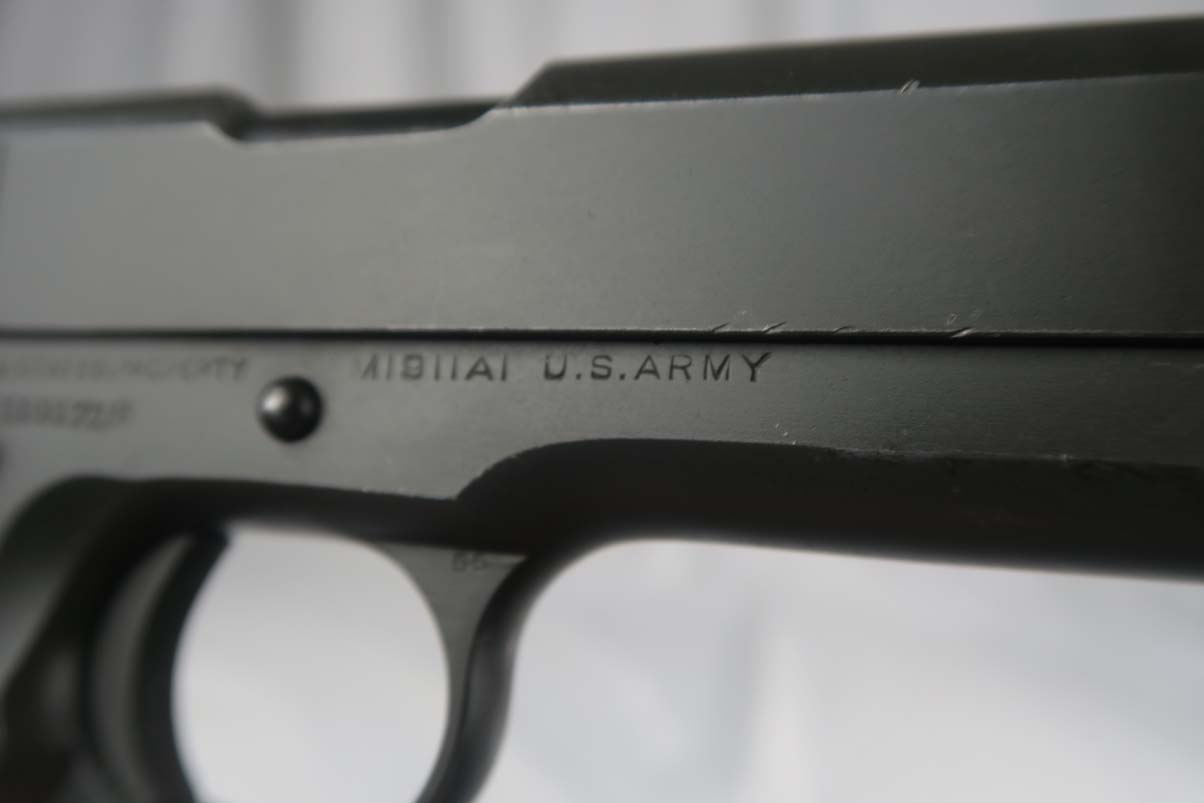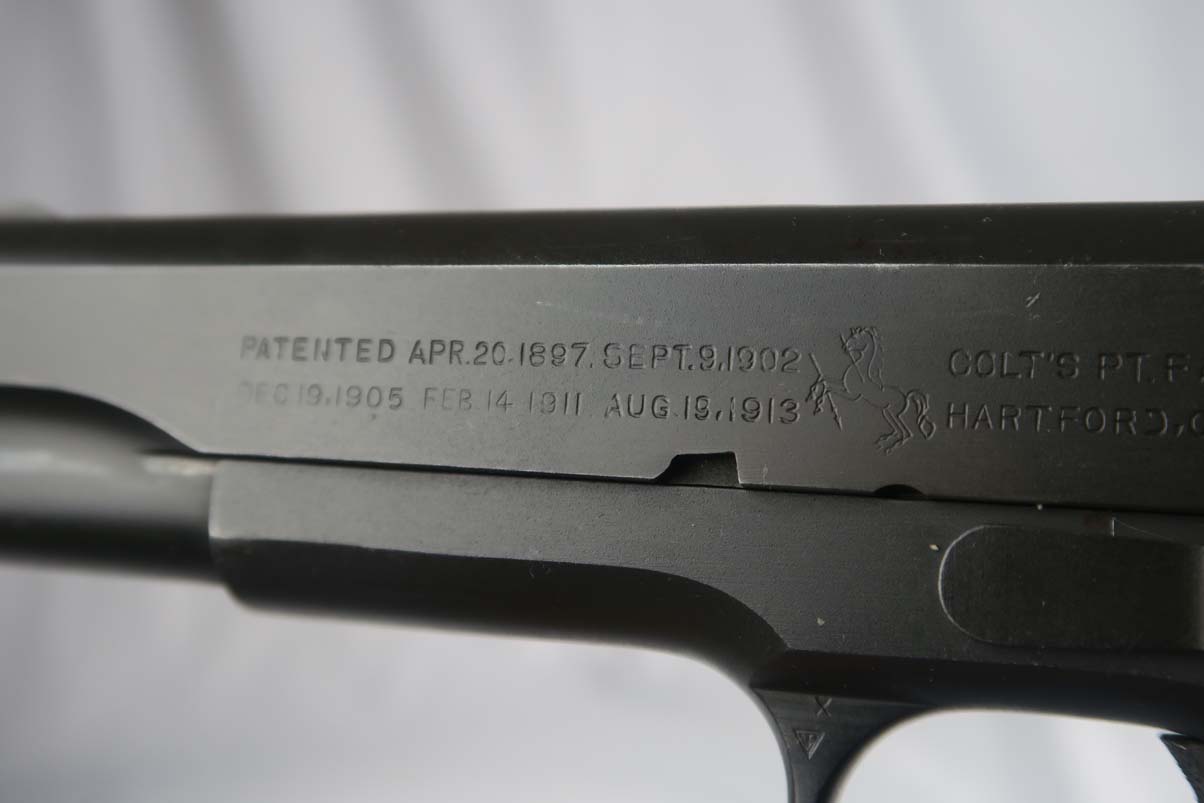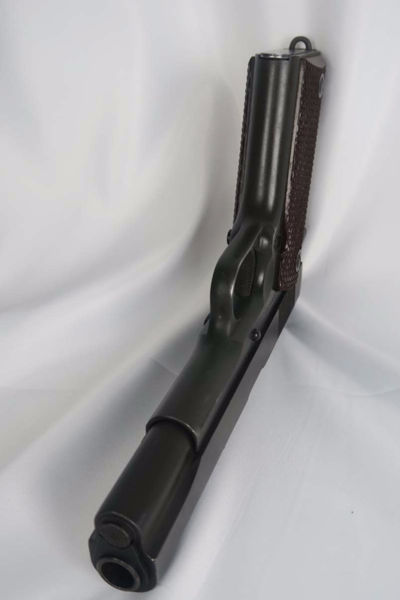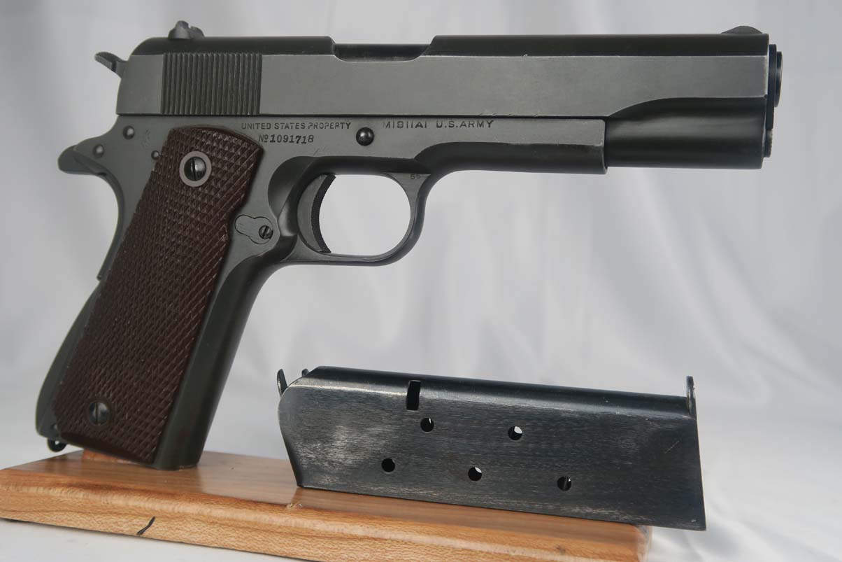 3/20/17 – This is a US Army, WW2 issued, original Colt.   The serial number places it to a 1943 manufacture date.   The original parkarized finish is excellent and covers about 98% of the gun.  The slide has that correct “two tone” color to it with a visible line about an inch from the muzzle demonstrating an original finish.   Most wear is either minor holster wear or rub marks from the slide being moved.   The slide legend has the Rampart Colt in the middle of the logo.   The slide is unnumbered.   Small parts appear to be all correct for the gun – it was not reworked or arsenal refurbished.   The barrel is correct for the gun as well and marked Colt – 45 Auto.   The bore is strong but with frosting especially in the groves.   On a scale of 1 to 10, I would give it a 6.    Correct wartime plastic grips.  Also correct wartime magazine as the base is marked with an L.