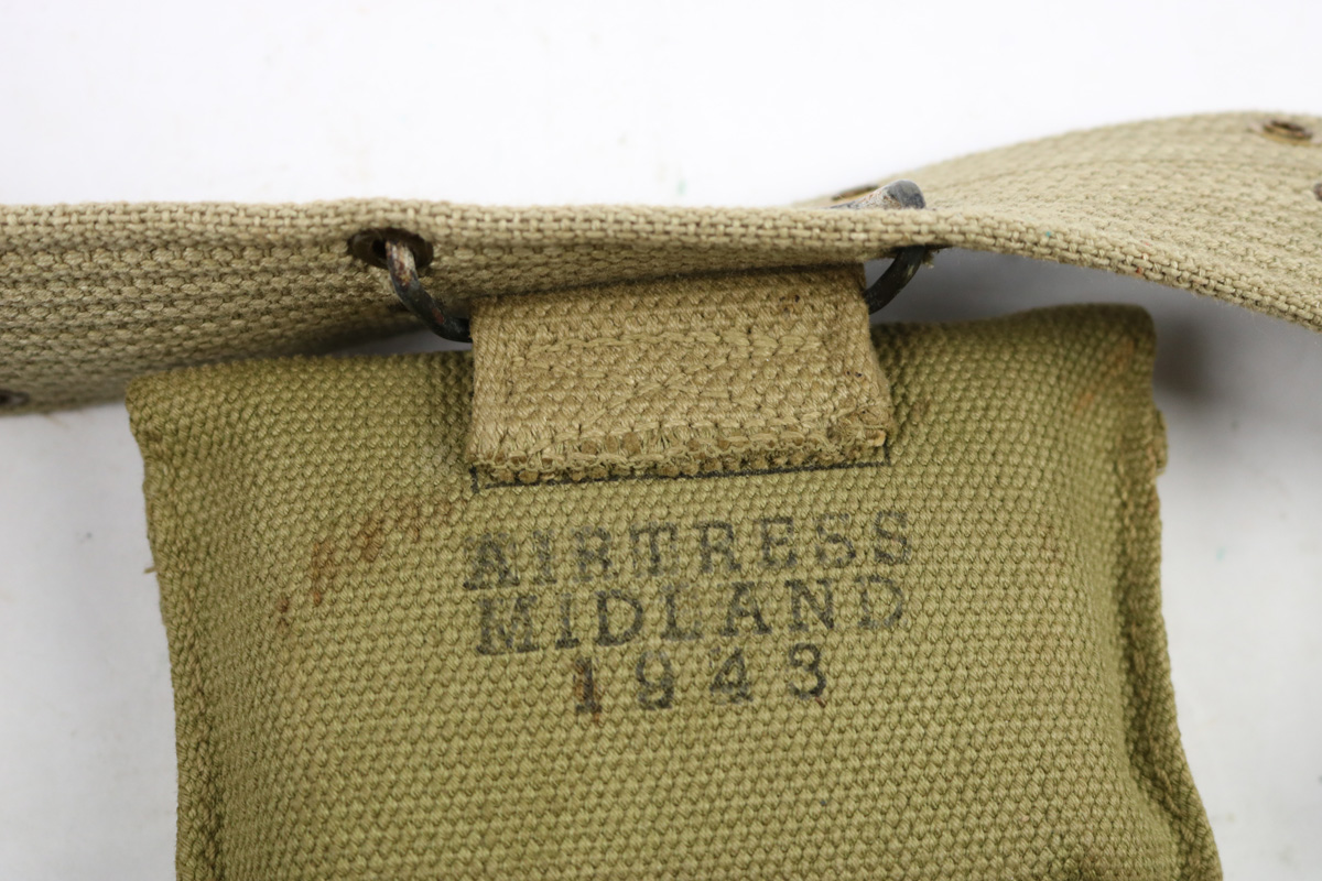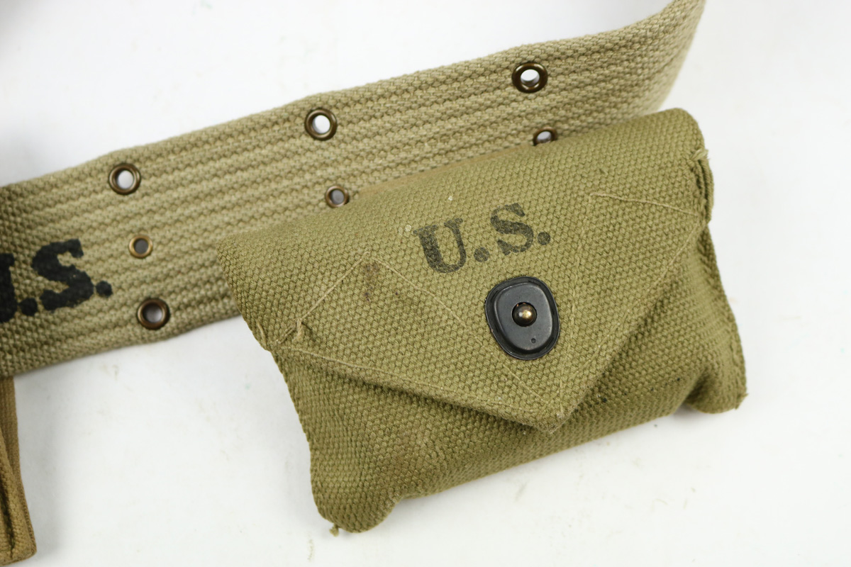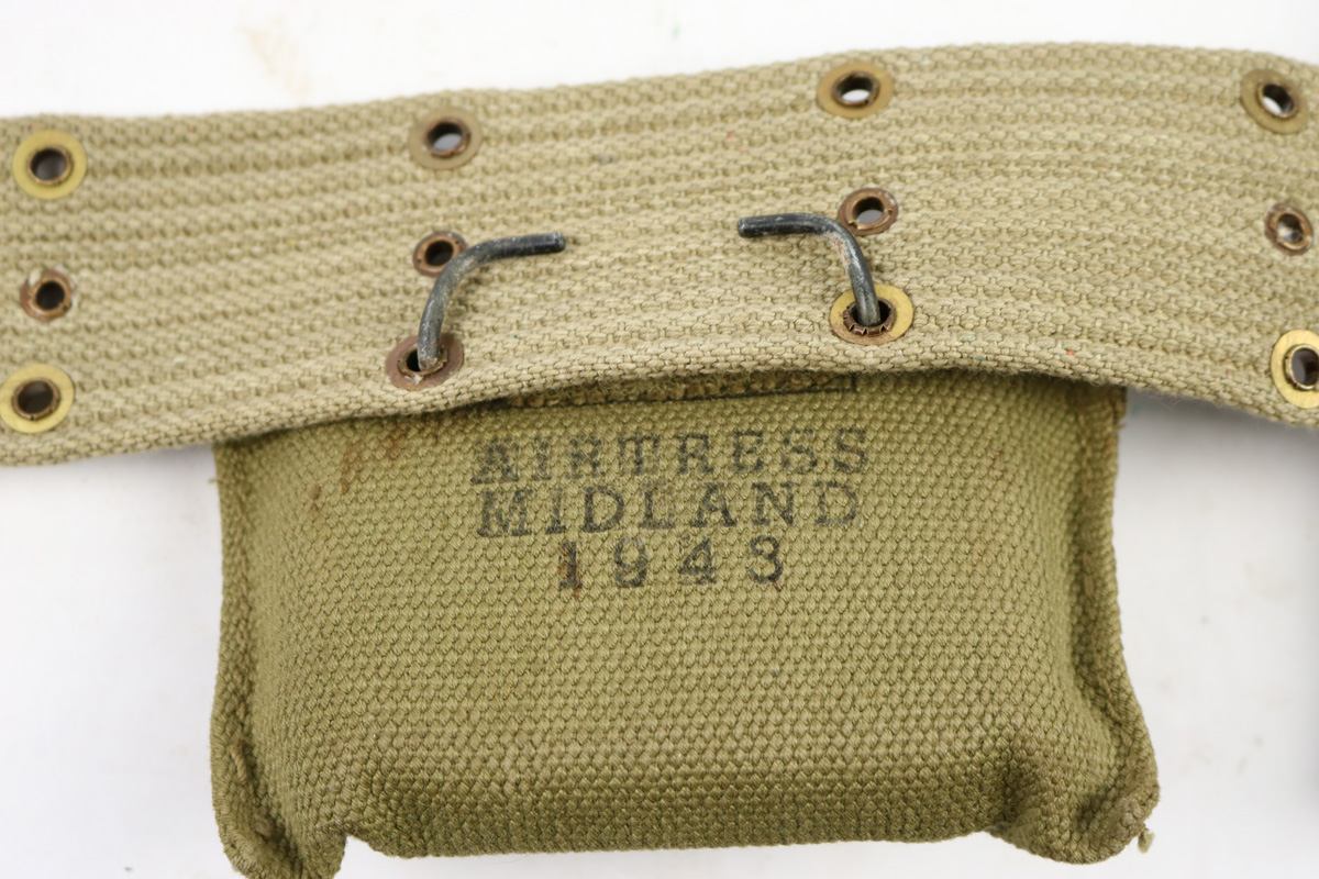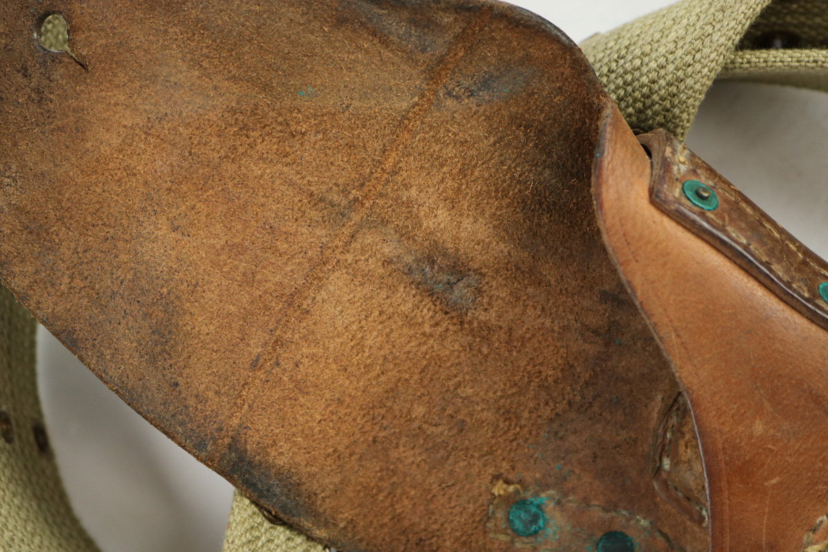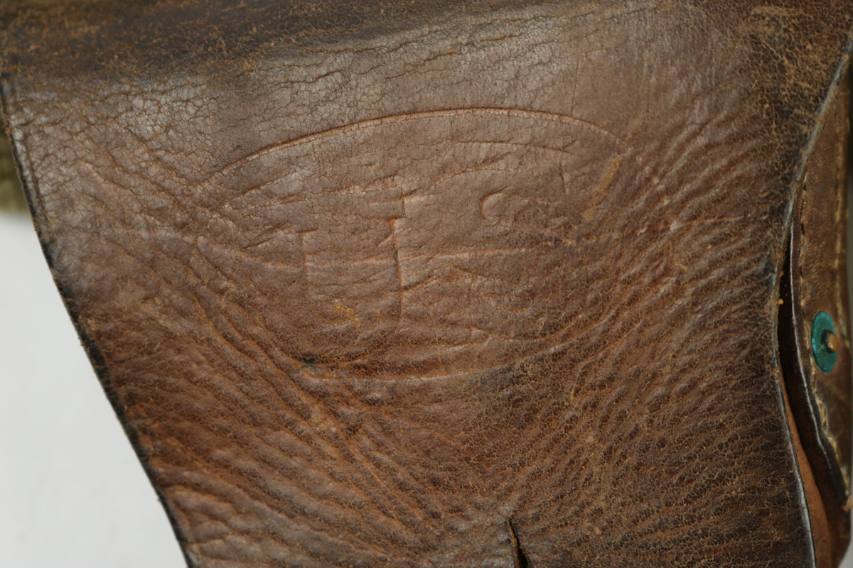 8/24/18 – This is an original 1911A1 holster made by Graton & Knight in 1943. Comes with a reproduction canvas belt, WW1 original magazine pouch, and WW2 original med kit pouch. Inside the 1943 dated canvas med kit pouch is what appears to be an original WW2 med pouch unopened in excellent, minty condition. Olive green paint on the exterior. The magazine pouch is lighter tan canvas (not olive green) and dated 1918 on the interior. The holster is in great condition with some normal exterior scuffing and signs of use. Interior shows normal aging. The back of the holster is maker stamped and 1943 dated. Guaranteed original, except for the belt, which we believe is reproduction.