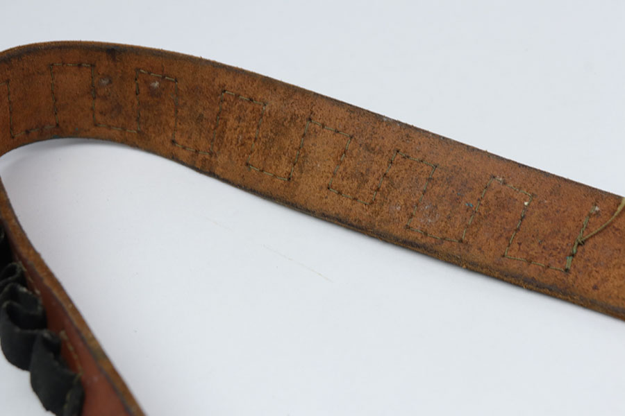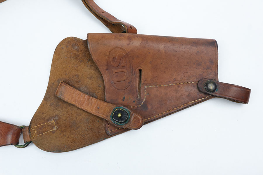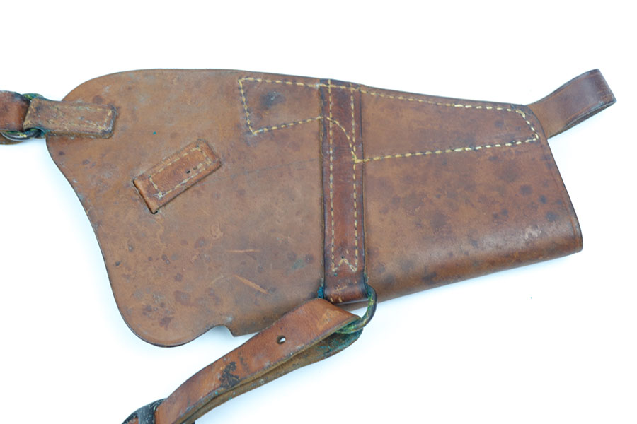 10/27/20 – This is a very nice WW2 1911a1 pistol holster for the USMC on the Pacific. The holster is all original except for some shell loops added to the shoulder strap. Well stamped on the back leather. There is some light discoloration and signs of aging but no major wear. All original stitching in tact.