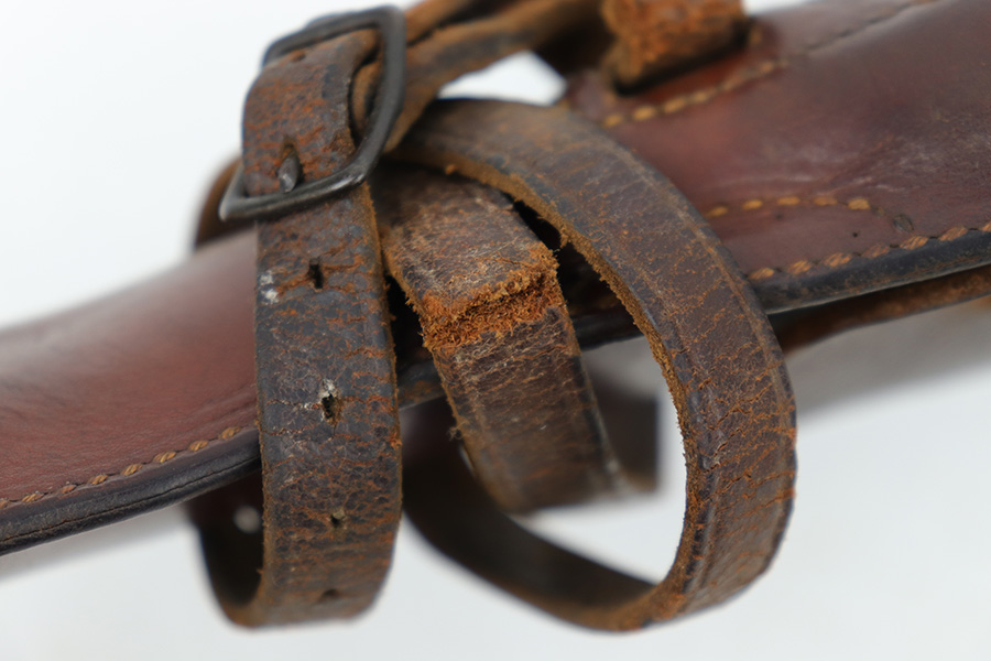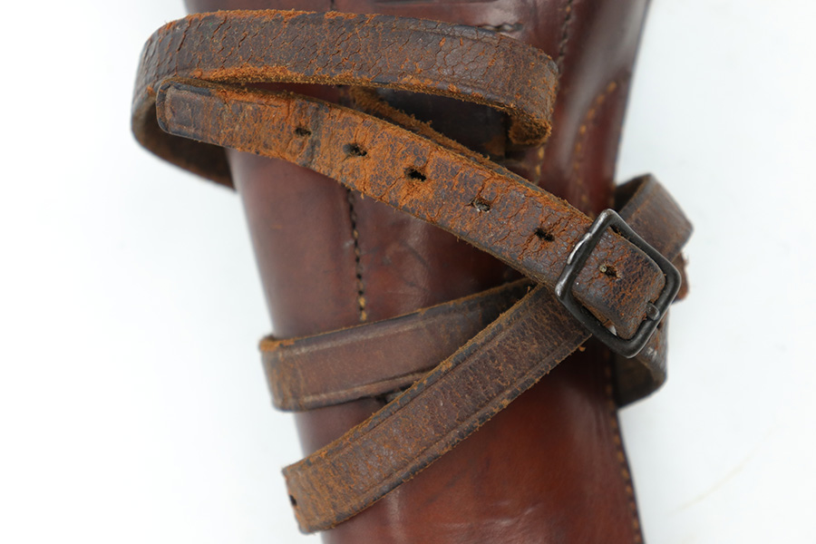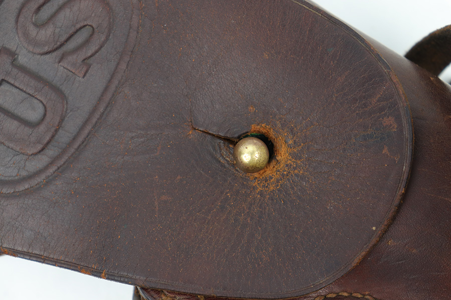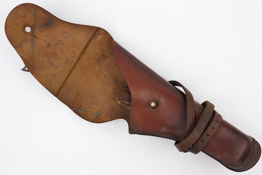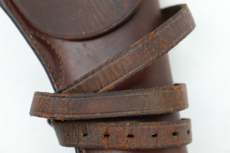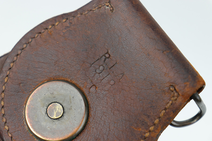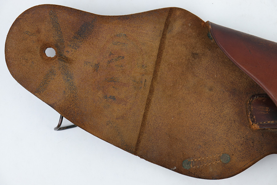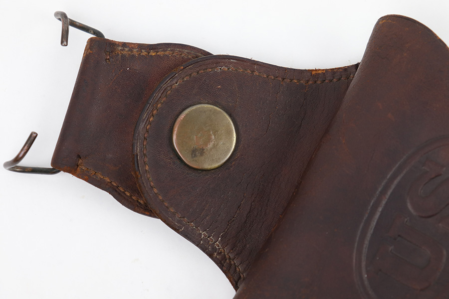 4/6/23 – This is a rare 1st year of production, 1912 dated holster for a M1911 Colt pistol. The holster is in great condition and complete with attached belt hooks and swivel. The leather hanger is maker stamped “R.I.A.” and dated. There’s some light surface cracking along the right side of the holster (when looking at the front), but all of the leather is original and intact. The leather is soft from age and previous use, but there’s no excessive wear. Strong, crisp US stamp on the front leather. The original leg strap is still attached and in great shape as well. All original stitching is intact. A very hard to find example!
