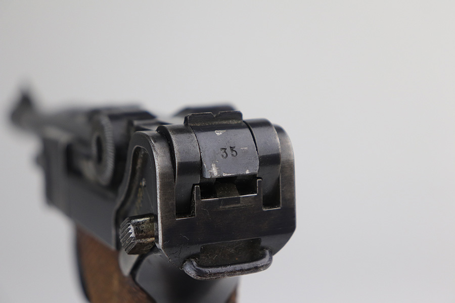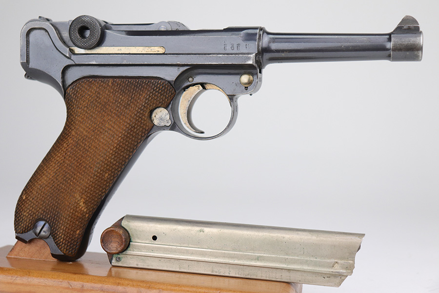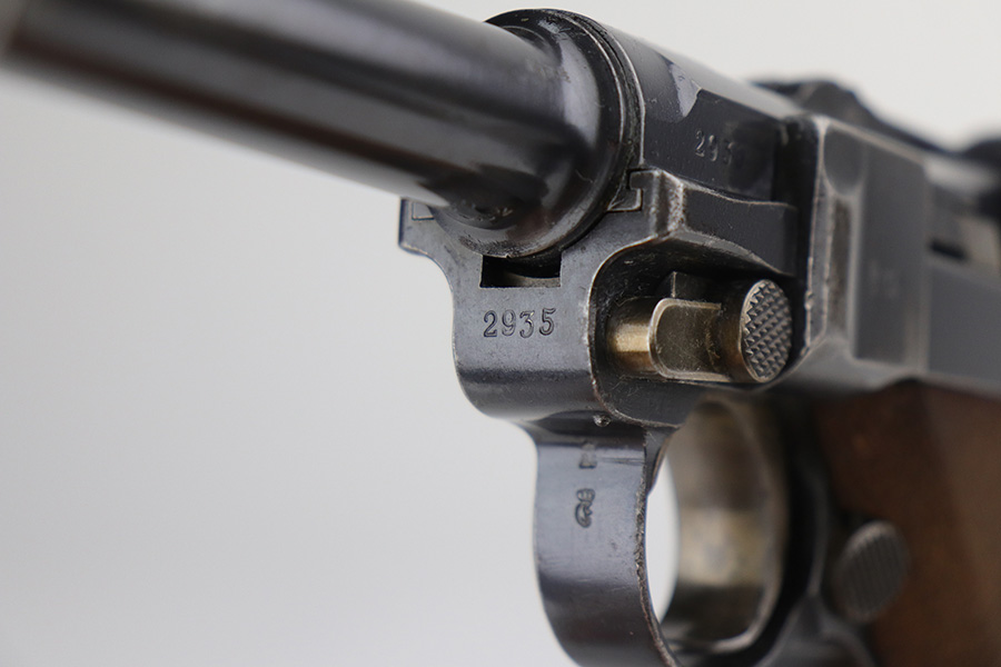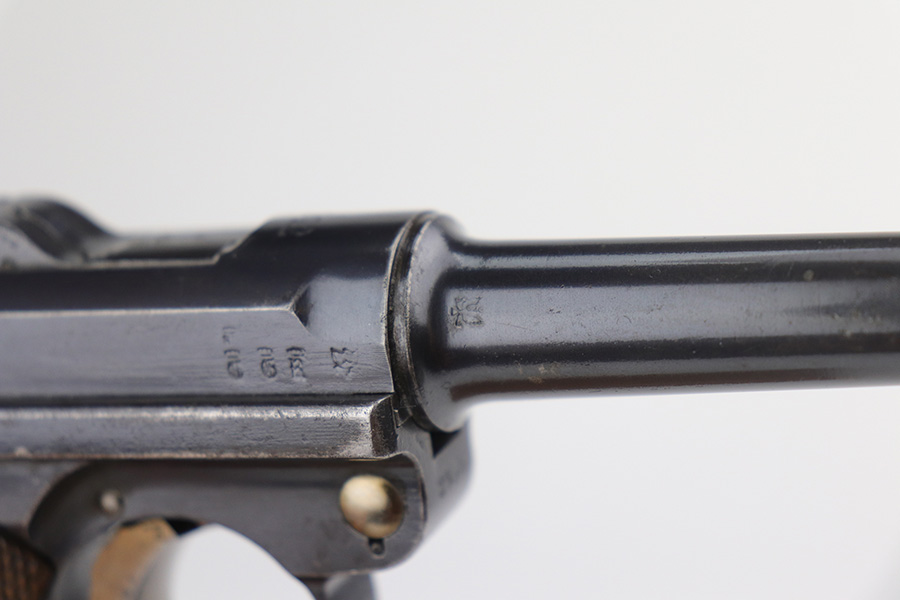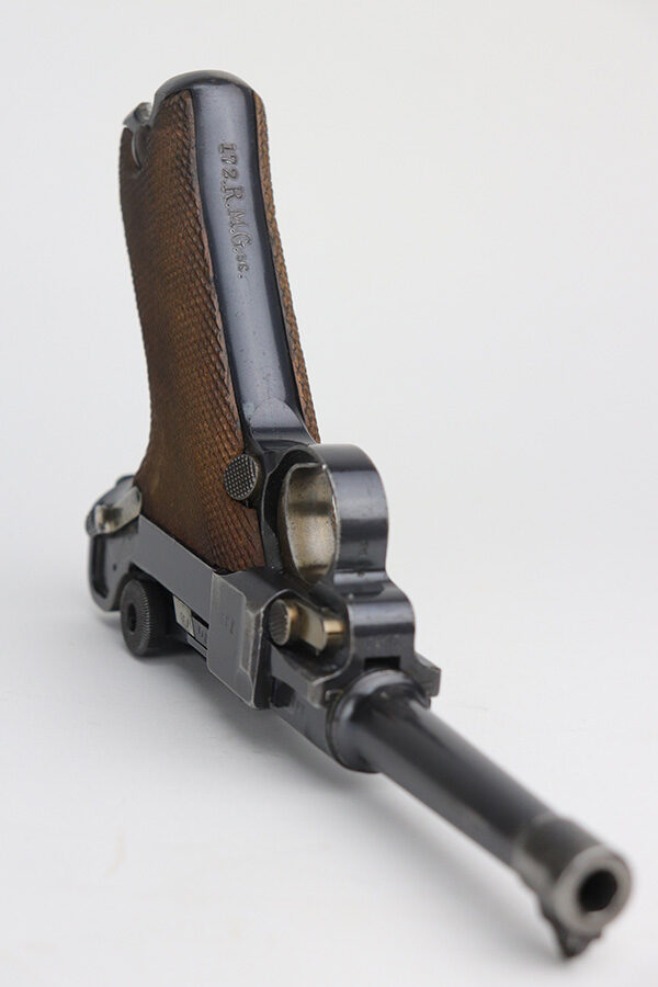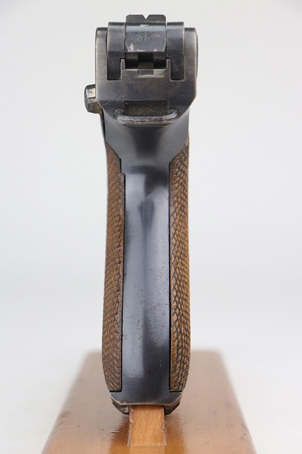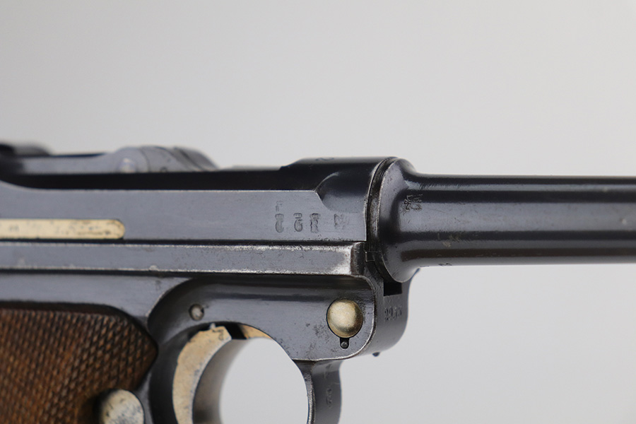 11/5/21 – This is a very nice example of an early Erfurt Luger issued to the Imperial German military in 1912. The gun is all matching, has the proper Imperial German military proofs, and has the proper Erfurt proofs throughout. It also has a “172.R.M.G.56” regimental military marking on the front strap. It has early features such as no stock lug on the rear grip strap and no factory hold-open. A hold-open was added later, as evidence by a tiny weld hold on the right side of the frame. The gun has retained about 92% of its original finish. There is wear on the side plate, side rails, and around the muzzle. Some tiny dots of oxidation in the same areas and some tiny pits around the muzzle. There are some light handling marks and a few dots of oxidation on the barrel. Some very minor freckling on both grip straps. Comes with very nice matching-numbered wood grips and a period-correct but mismatched Erfurt magazine. The bore has decent rifling with minor pin-pricking throughout.