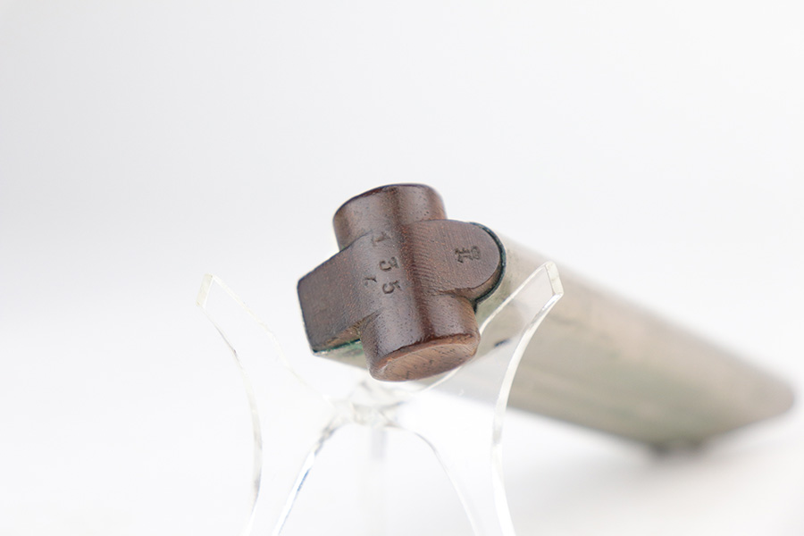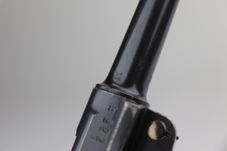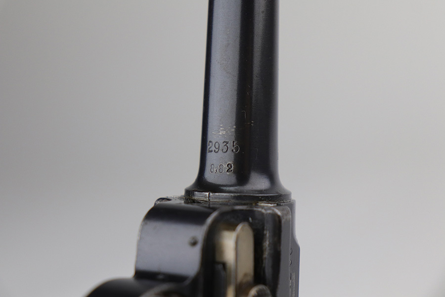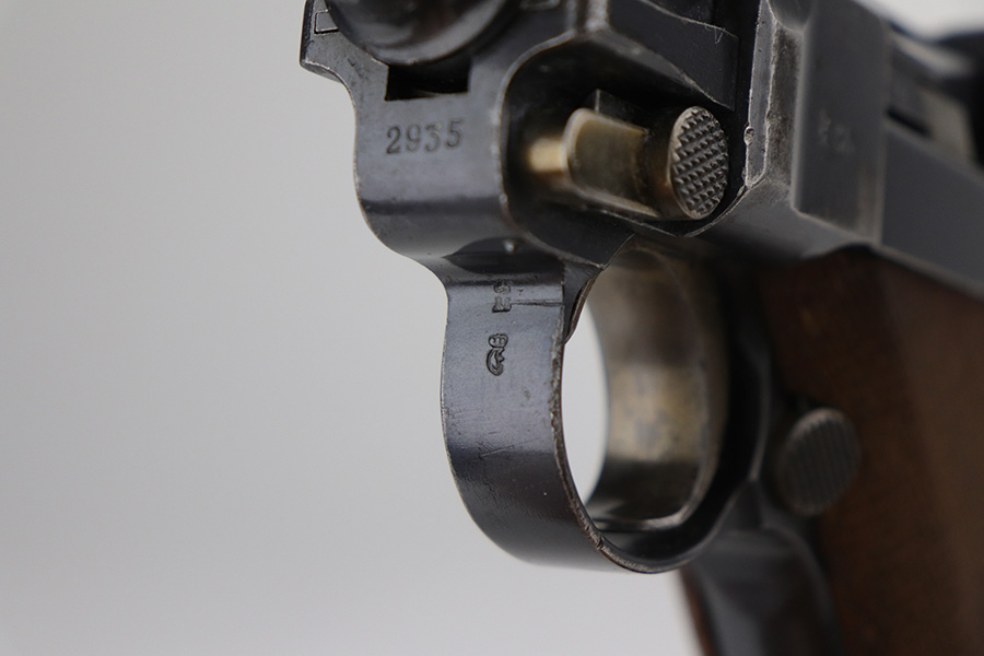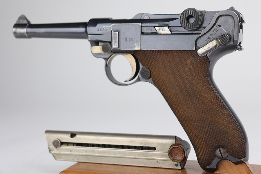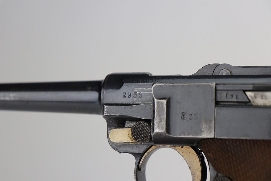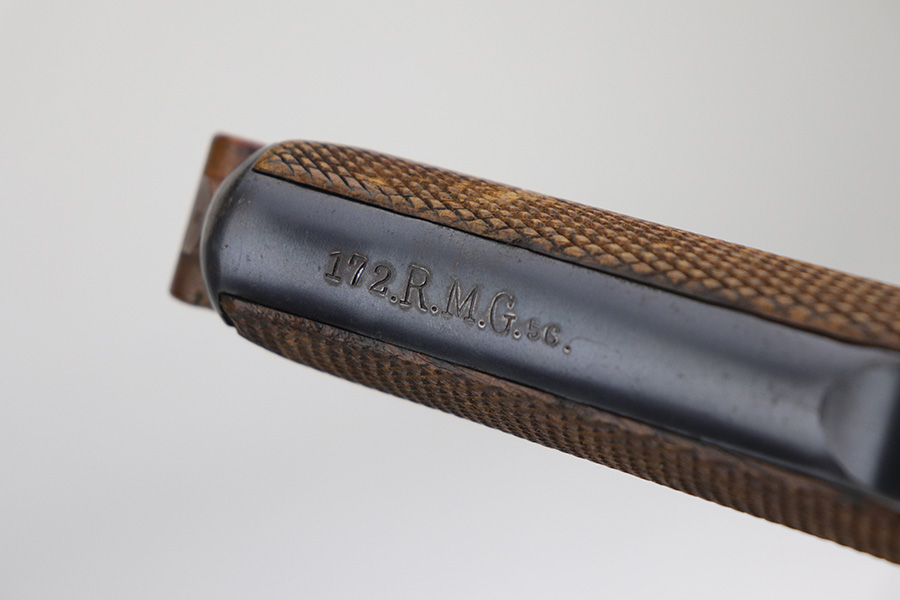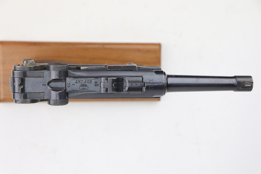 11/5/21 – This is a very nice example of an early Erfurt Luger issued to the Imperial German military in 1912. The gun is all matching, has the proper Imperial German military proofs, and has the proper Erfurt proofs throughout. It also has a “172.R.M.G.56” regimental military marking on the front strap. It has early features such as no stock lug on the rear grip strap and no factory hold-open. A hold-open was added later, as evidence by a tiny weld hold on the right side of the frame. The gun has retained about 92% of its original finish. There is wear on the side plate, side rails, and around the muzzle. Some tiny dots of oxidation in the same areas and some tiny pits around the muzzle. There are some light handling marks and a few dots of oxidation on the barrel. Some very minor freckling on both grip straps. Comes with very nice matching-numbered wood grips and a period-correct but mismatched Erfurt magazine. The bore has decent rifling with minor pin-pricking throughout.