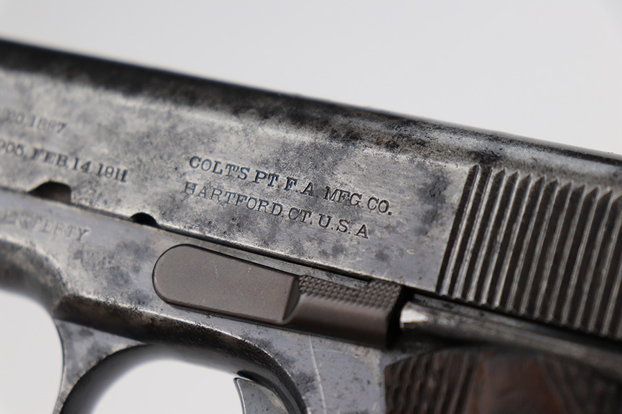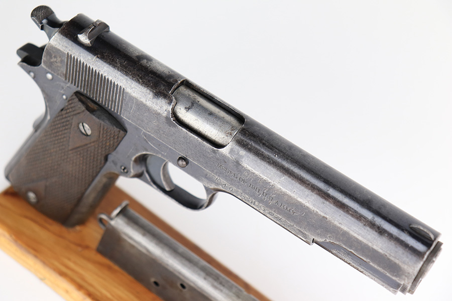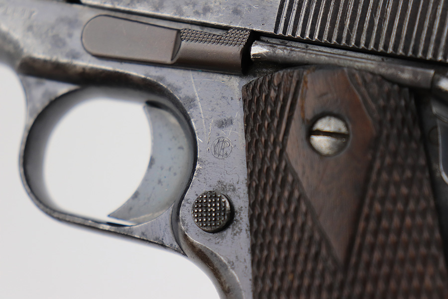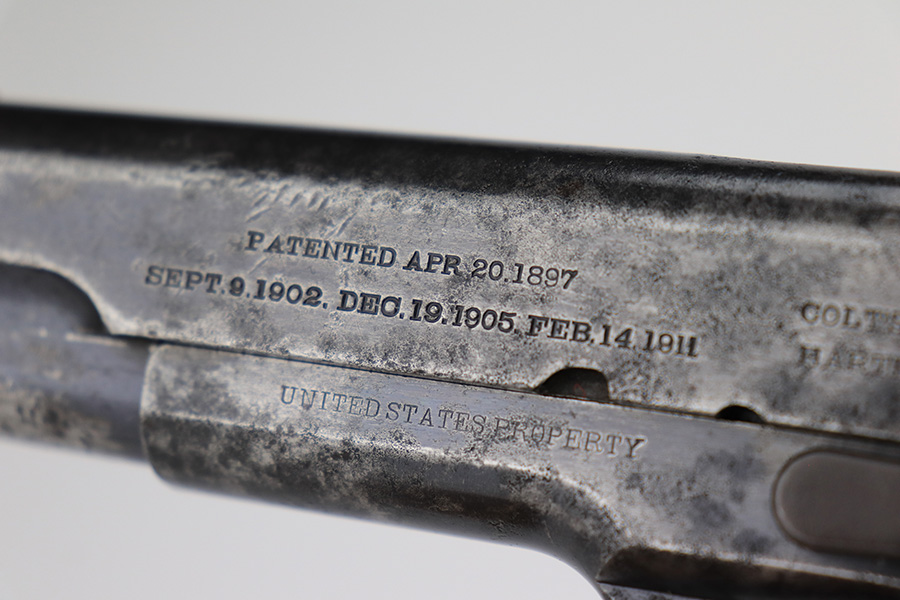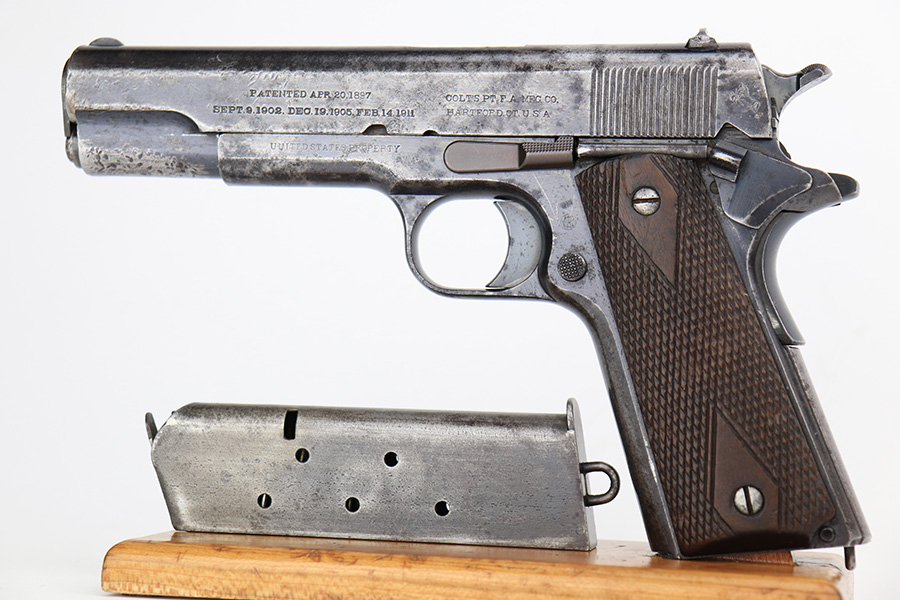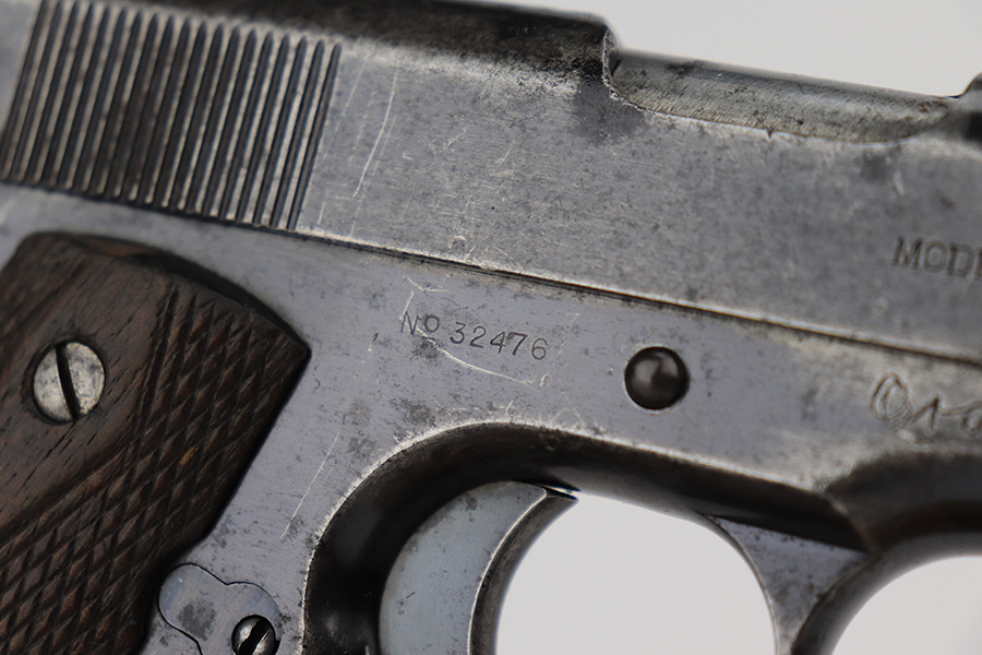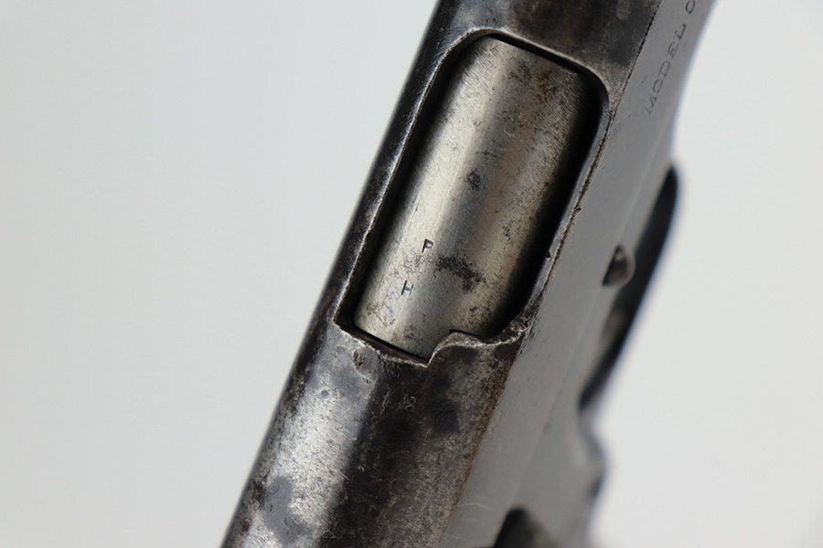 5/17/23 – This is an early Colt Model 1911 issued to the US military in 1913. It is “United States Property” marked and has the proper military inspection proof. Correct “H P” Colt barrel. Correct early half-moon rear sight. Unfortunately, there is a name scratched into the right side of the frame. The slide release lever has been replaced. The gun itself has lost most of its original finish with obvious spotty wear and noticeable spotty oxidation throughout. There is also an area of small dings in the metal around the muzzle on the underside of the slide. Fitted with fairly worn wood grips and comes with a worn but period-correct two-tone magazine. The bore is slightly worn with pin-pricking throughout.