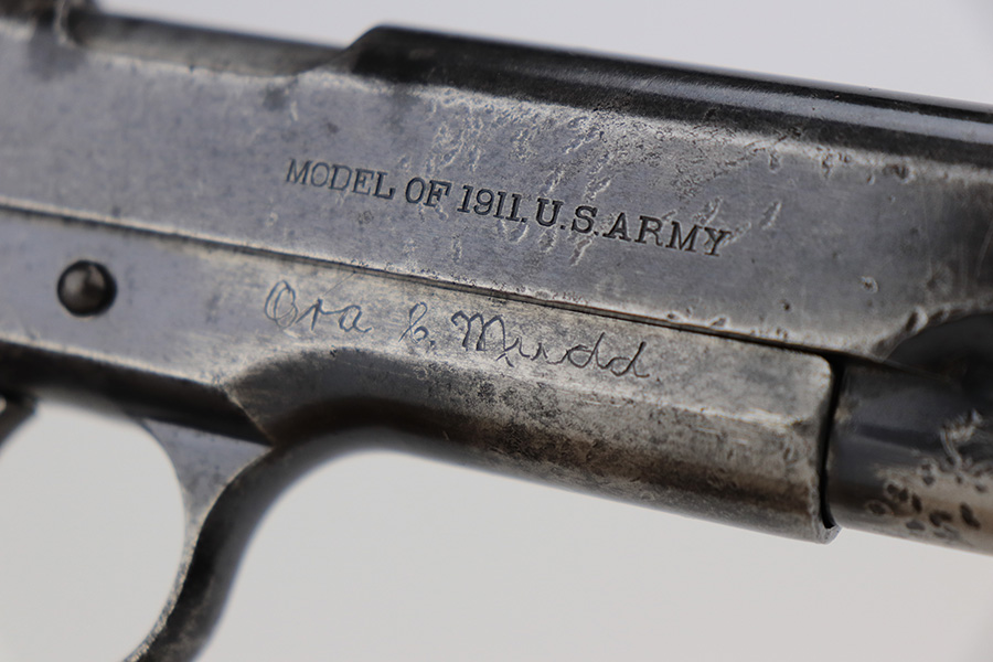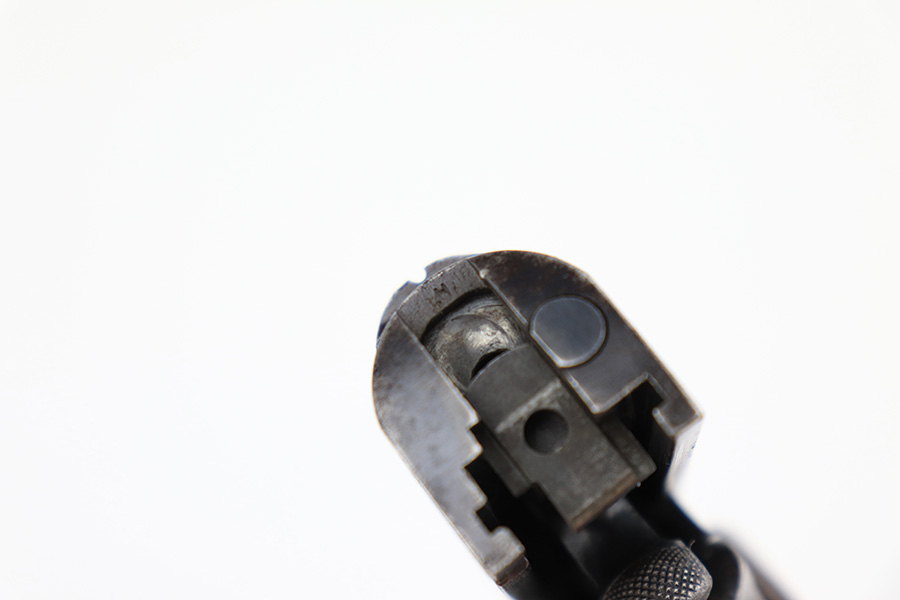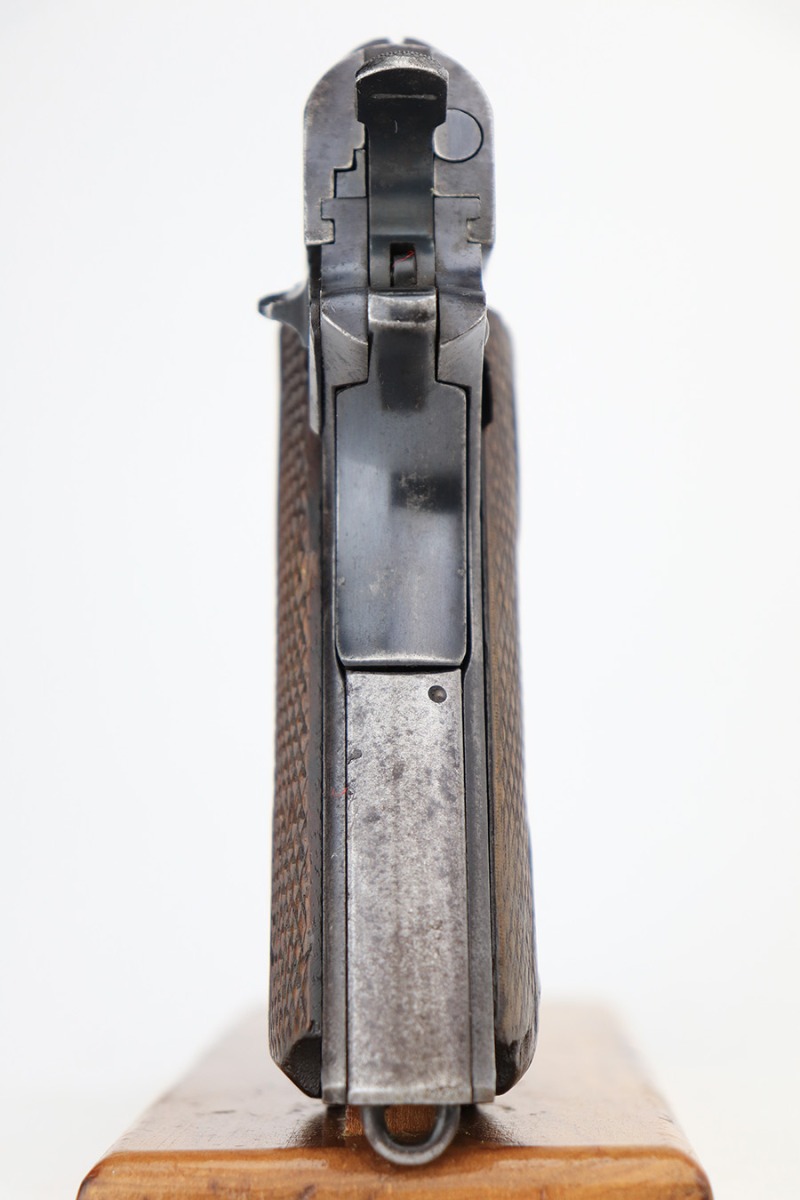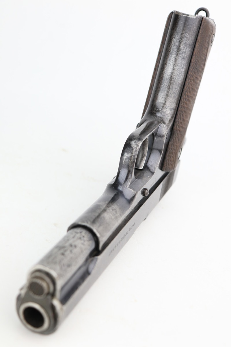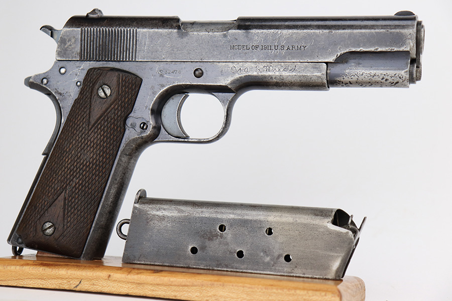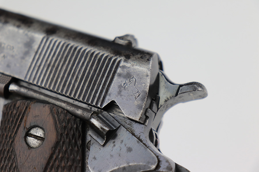5/17/23 – This is an early Colt Model 1911 issued to the US military in 1913. It is “United States Property” marked and has the proper military inspection proof. Correct “H P” Colt barrel. Correct early half-moon rear sight. Unfortunately, there is a name scratched into the right side of the frame. The slide release lever has been replaced. The gun itself has lost most of its original finish with obvious spotty wear and noticeable spotty oxidation throughout. There is also an area of small dings in the metal around the muzzle on the underside of the slide. Fitted with fairly worn wood grips and comes with a worn but period-correct two-tone magazine. The bore is slightly worn with pin-pricking throughout.