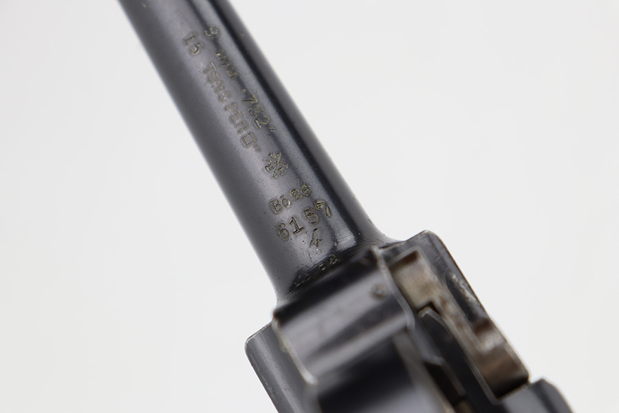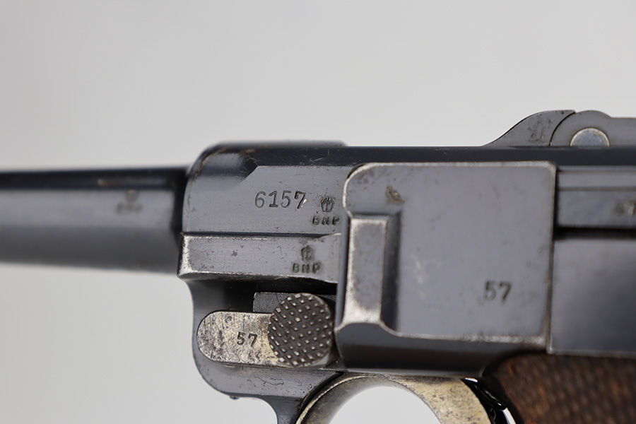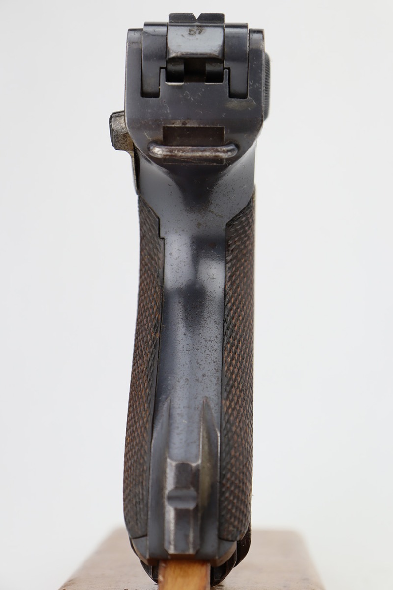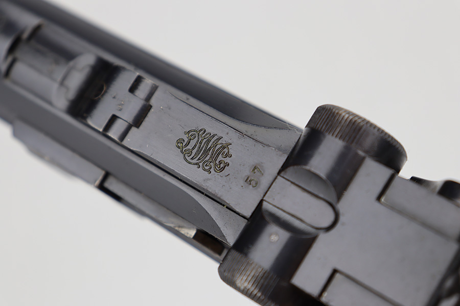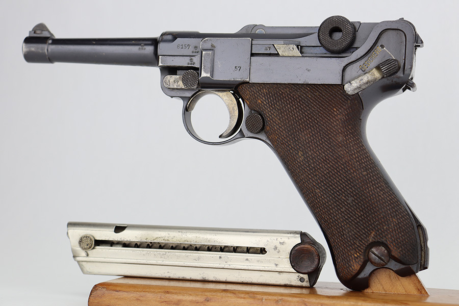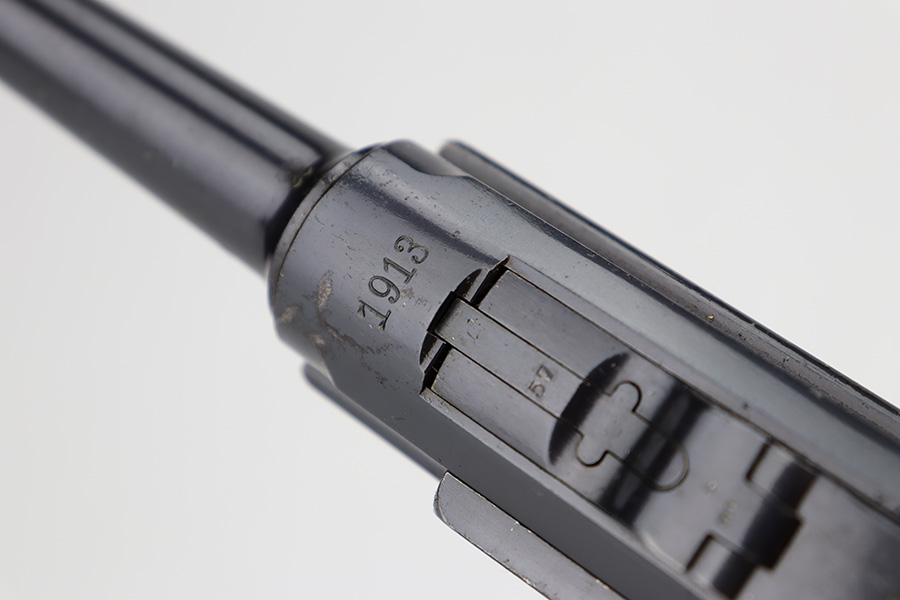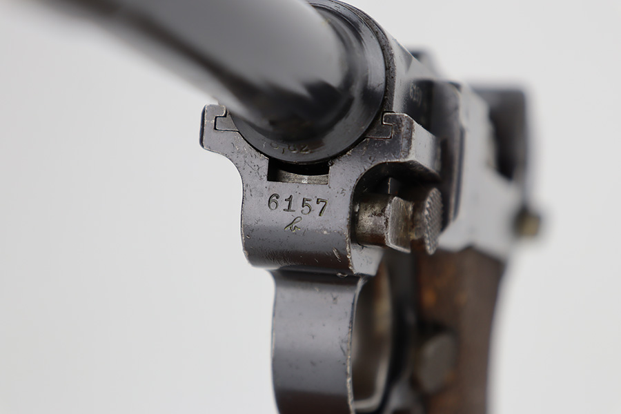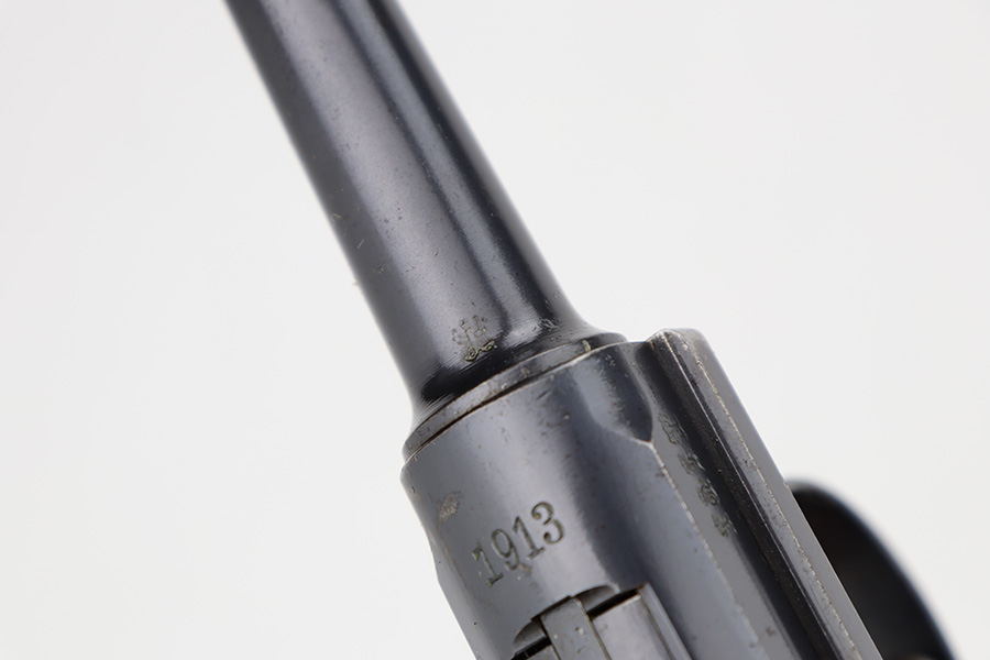6/14/23 – This is an excellent example of a DWM Luger issued to the Imperial German military in 1913. It is all matching with proper Imperial military acceptance proofs. There are British proofs on the left side of the gun and on the underside of the barrel, indicating this gun was likely captured and exported by the British. It has retained about 97% of its original finish with very minor wear around the muzzle, on the side plate, and on the front edges of the side rails. Spotty freckling on the grip straps. A tiny ding in the metal on the side plate. Fitted with matching-numbered wood grips – tiny repaired chip in the upper corner of the left panel. Comes with a mismatched magazine. The rifling in the bore is a bit worn with pin-pricking throughout.