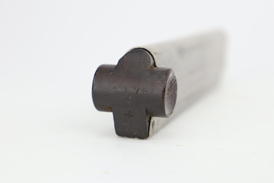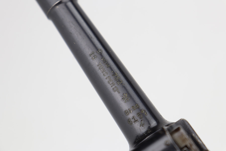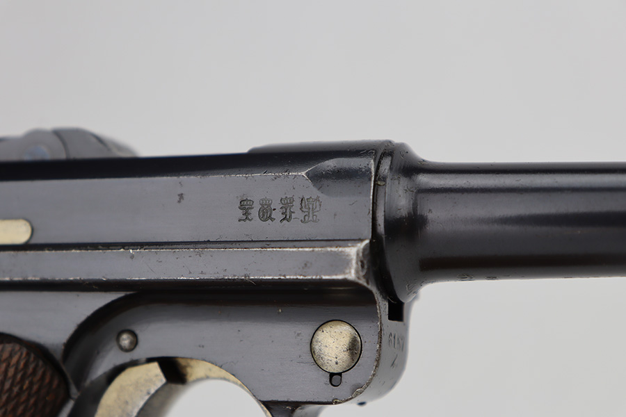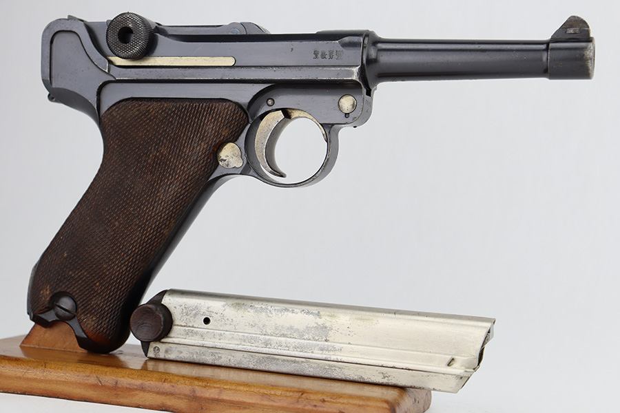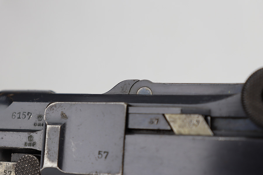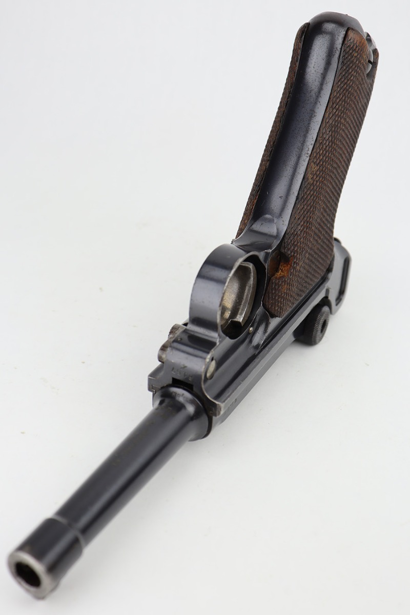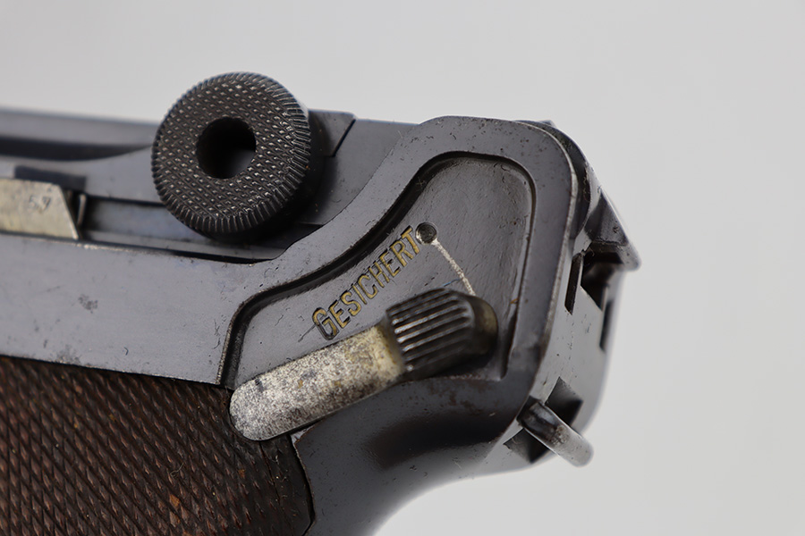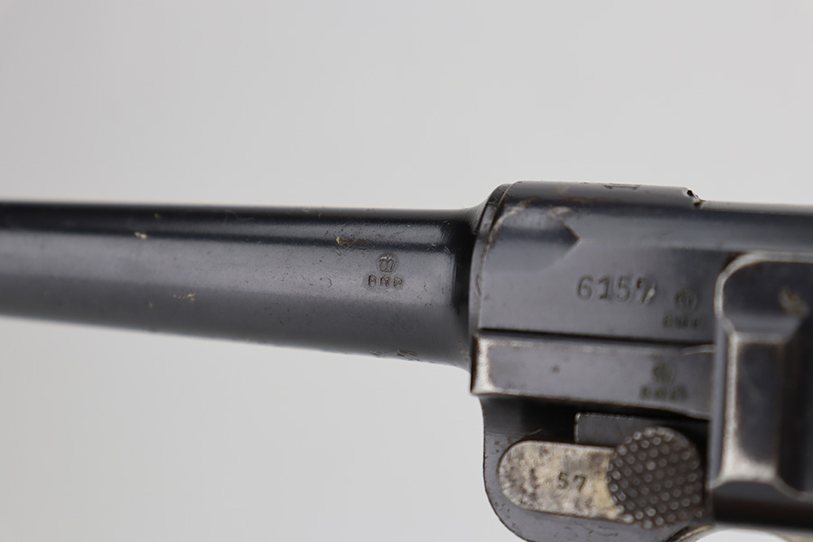 6/14/23 – This is an excellent example of a DWM Luger issued to the Imperial German military in 1913. It is all matching with proper Imperial military acceptance proofs. There are British proofs on the left side of the gun and on the underside of the barrel, indicating this gun was likely captured and exported by the British. It has retained about 97% of its original finish with very minor wear around the muzzle, on the side plate, and on the front edges of the side rails. Spotty freckling on the grip straps. A tiny ding in the metal on the side plate. Fitted with matching-numbered wood grips – tiny repaired chip in the upper corner of the left panel. Comes with a mismatched magazine. The rifling in the bore is a bit worn with pin-pricking throughout.