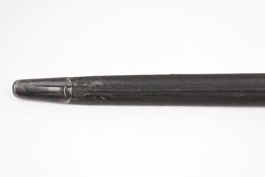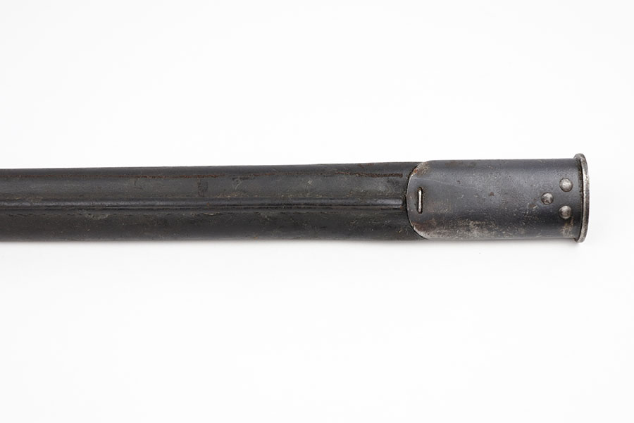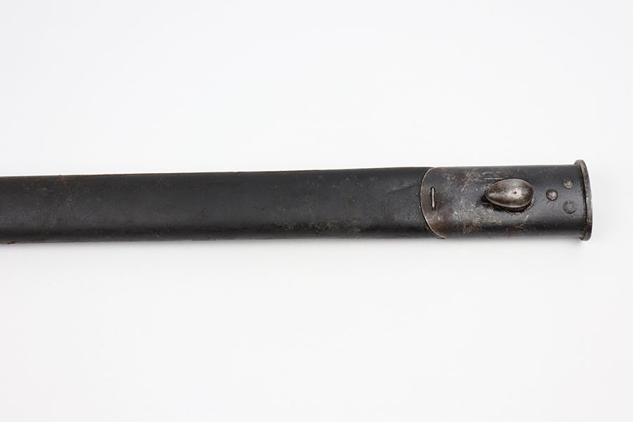 9/4/19 – This is an original WW1 era production Enfield Rifle bayonet. The bayonet is 1913 dated on one side and has British proofs on the other side near the base of the blade. The blade is excellent given its’ age, but there is some speckling patina and light wear in a few places. No signs of sharpening. The wood handle is in great shape as well. Some minor patina on the handle. The scabbard is original and shows aging throughout but is completely in tact. Guaranteed original.