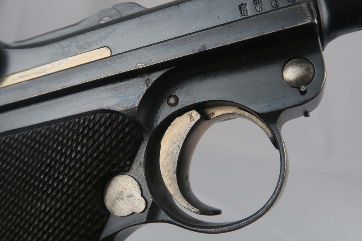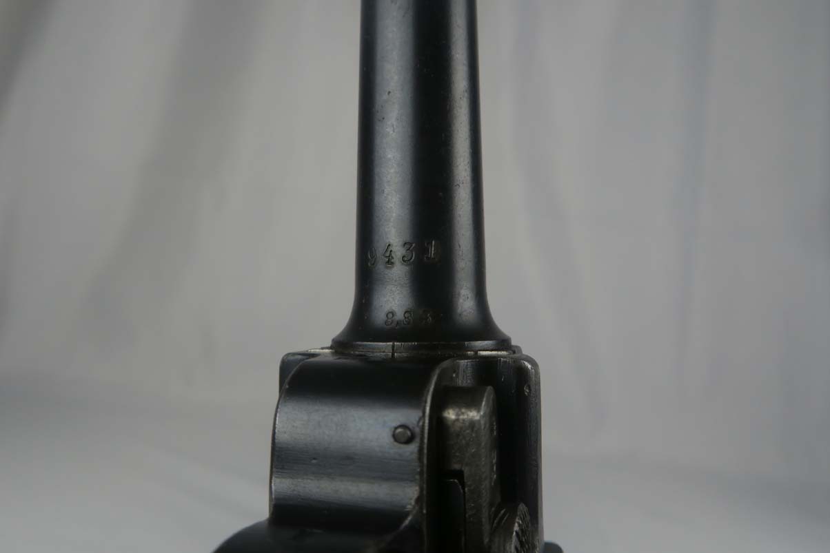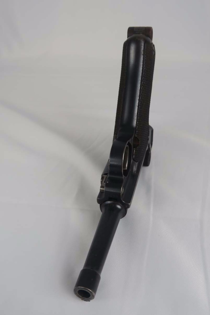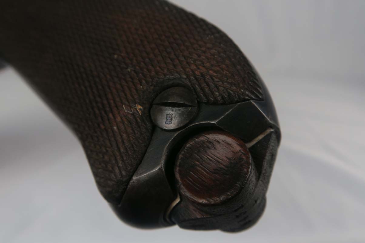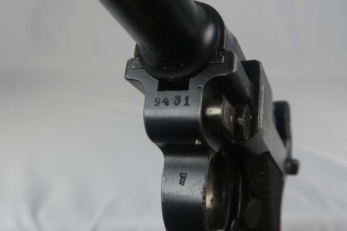 3/6/17 – This is a WWI era Erfurt luger, all original, with matching magazine!  These were heavily proofed pistols, and this one is no different.  All small parts received Erfurt’s imperial proof, including the grip screws, and all numbered parts on this pistol match – including the grips and magazine.  From 1908 to 1914, these pistols were produced without the hold open or stock lug.  Erfurt eventually changed this as soldiers found they couldn’t tell if the pistol was empty.  The finish on this pistol rates at about 92-94%, with some muzzle and sideplate wear, as well as some patina showing through on the straps.  The bore is very good with strong rifling.
