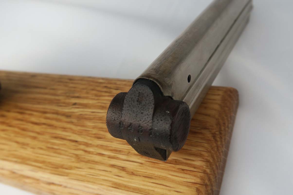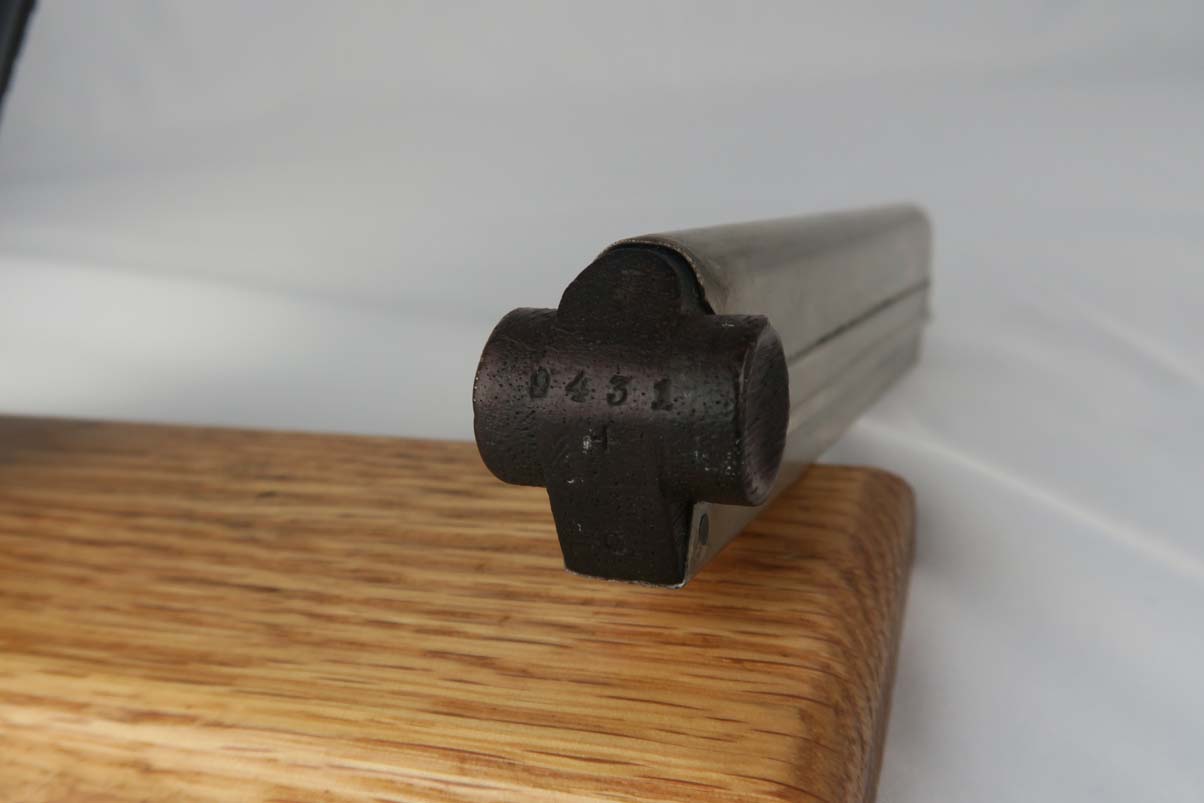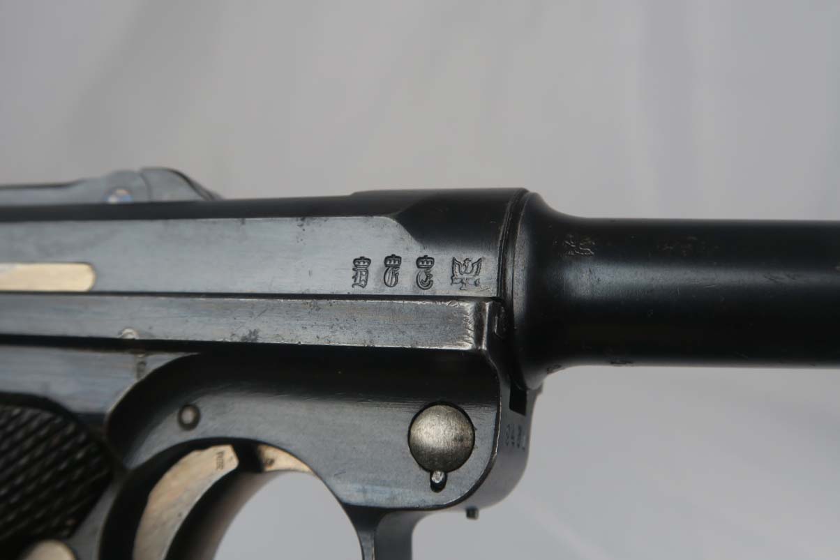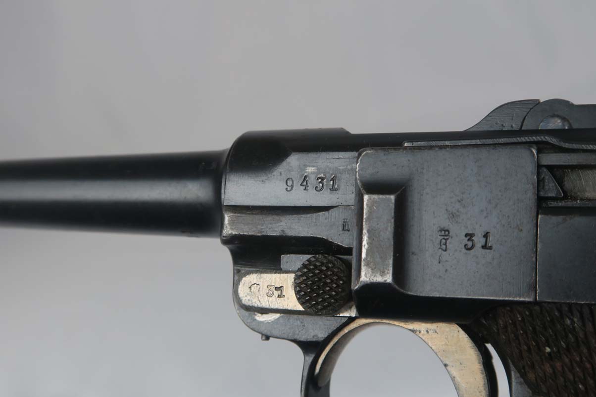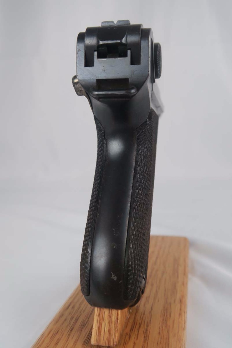 3/6/17 – This is a WWI era Erfurt luger, all original, with matching magazine!  These were heavily proofed pistols, and this one is no different.  All small parts received Erfurt’s imperial proof, including the grip screws, and all numbered parts on this pistol match – including the grips and magazine.  From 1908 to 1914, these pistols were produced without the hold open or stock lug.  Erfurt eventually changed this as soldiers found they couldn’t tell if the pistol was empty.  The finish on this pistol rates at about 92-94%, with some muzzle and sideplate wear, as well as some patina showing through on the straps.  The bore is very good with strong rifling.