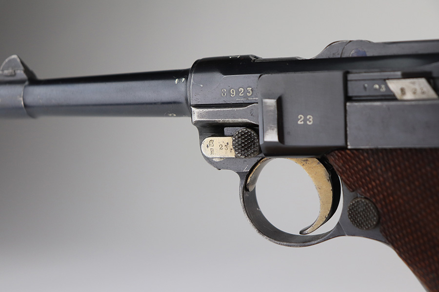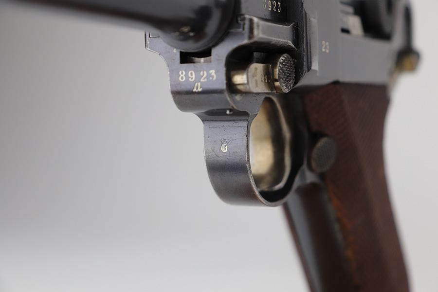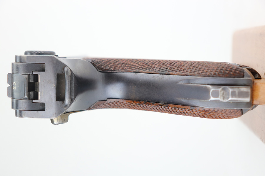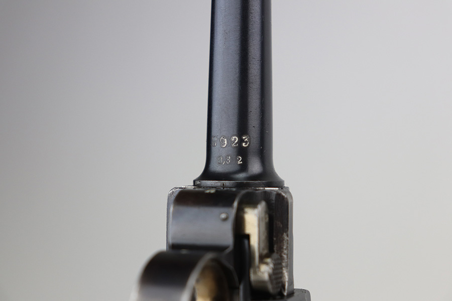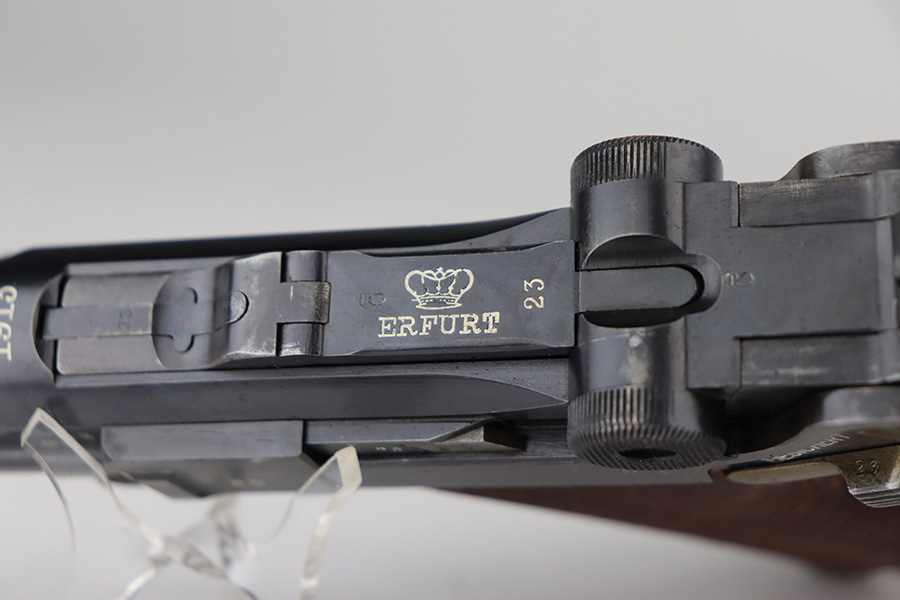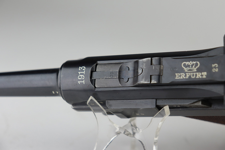 5/20/21 – This is a very nice example of an Erfurt Luger issued to the Imperial German military in 1913. The gun is all matching and has the proper Imperial proofs. It comes with two matching magazines (the magazine bottoms are reproduction and have been numbered to match), an unmarked Luger tool, and a rare Portuguese-contract holster. We don’t know much about these holsters. The gun has retained about 94% of its original finish. There are areas of minor wear at the base of the straps, side plate, front of the side rails, and around the muzzle. Spotty wear on the top of the slide. Spotty freckling on the straps. Excellent shiny bore with strong rifling.