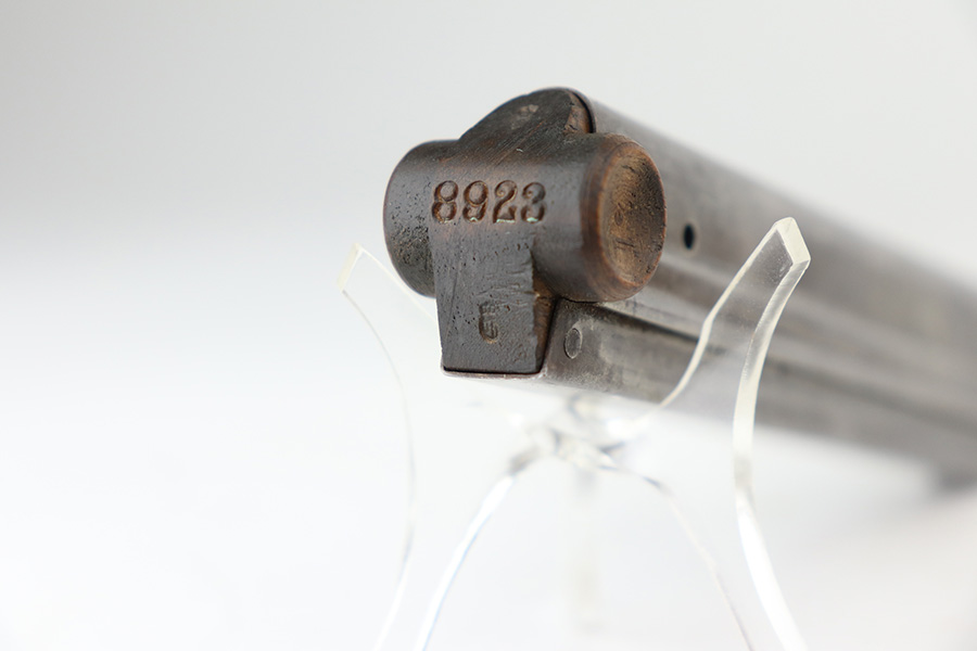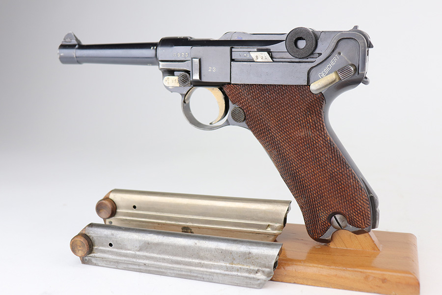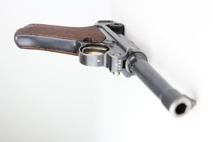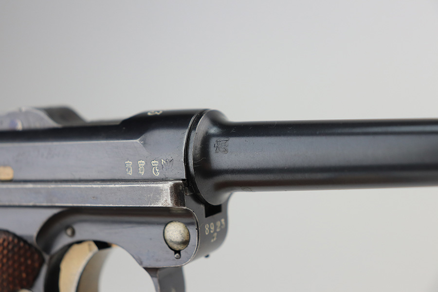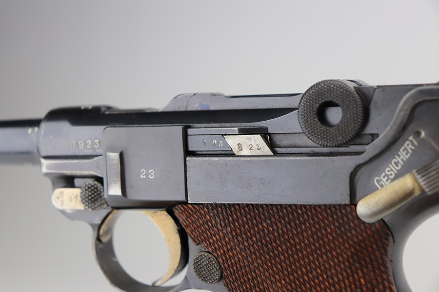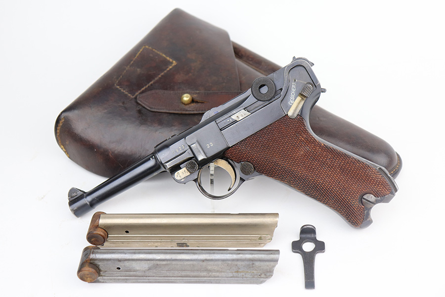 5/20/21 – This is a very nice example of an Erfurt Luger issued to the Imperial German military in 1913. The gun is all matching and has the proper Imperial proofs. It comes with two matching magazines (the magazine bottoms are reproduction and have been numbered to match), an unmarked Luger tool, and a rare Portuguese-contract holster. We don’t know much about these holsters. The gun has retained about 94% of its original finish. There are areas of minor wear at the base of the straps, side plate, front of the side rails, and around the muzzle. Spotty wear on the top of the slide. Spotty freckling on the straps. Excellent shiny bore with strong rifling.
