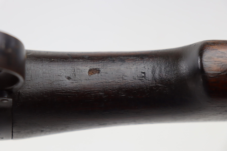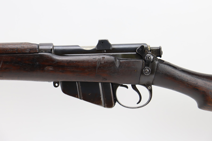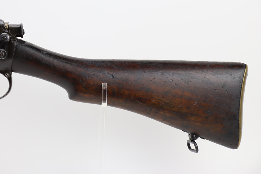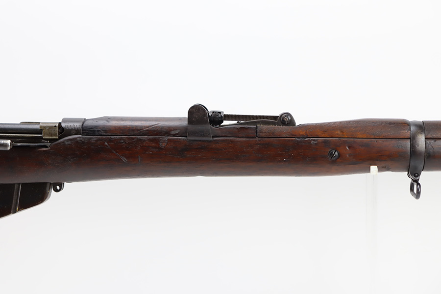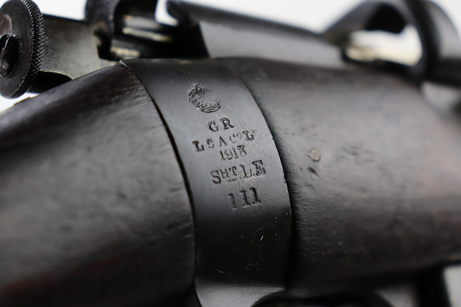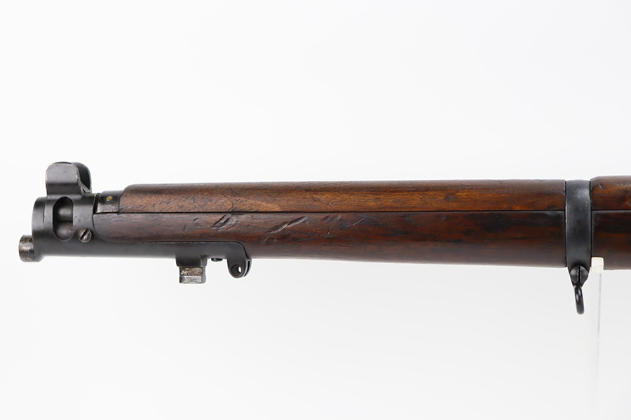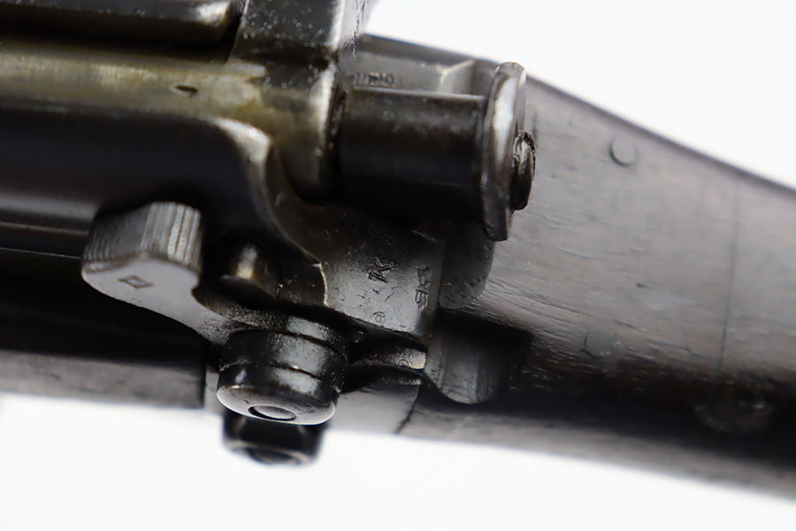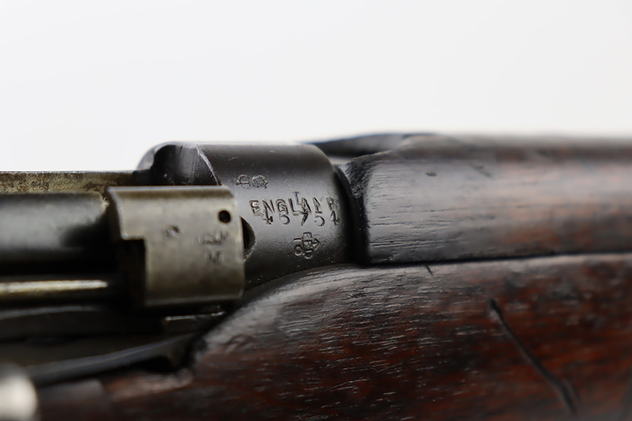 11/3/23 – This is a nice London Small Arms SHTLE III rifle issued to the British military in 1913. All matching with the proper British proofs throughout. England export mark on the receiver. No legible numbering on the stock. The stock disc is likely a replacement. The finish on the metal rates about 90%. While there is not much actual finish loss, there is noticeable brown patina throughout. The wood shows minor bruising and scratching throughout with a small hairline crack in the upper handguard in front of the receiver. Minty bore.