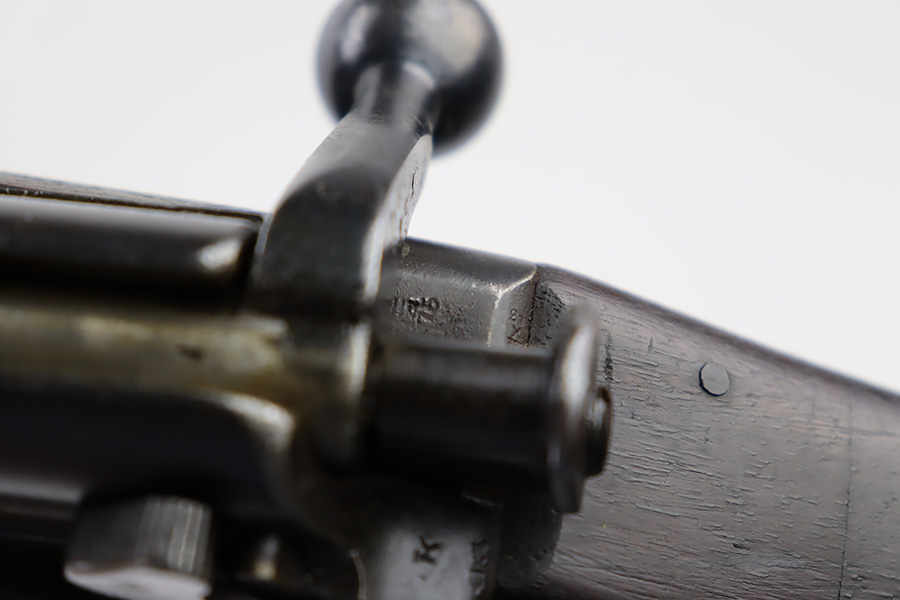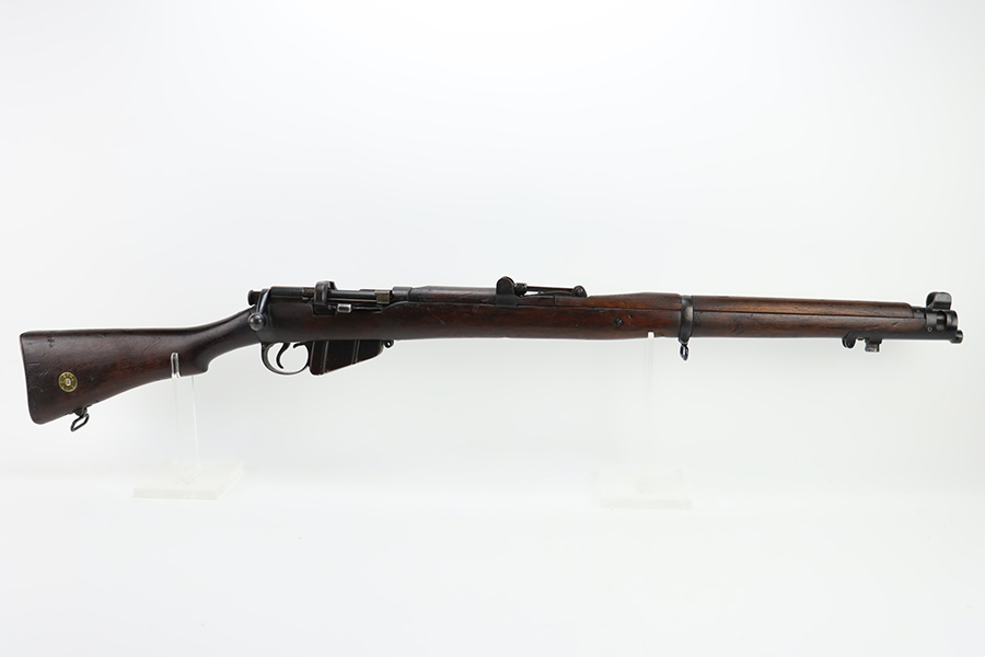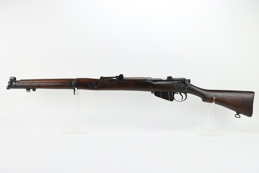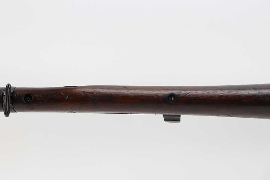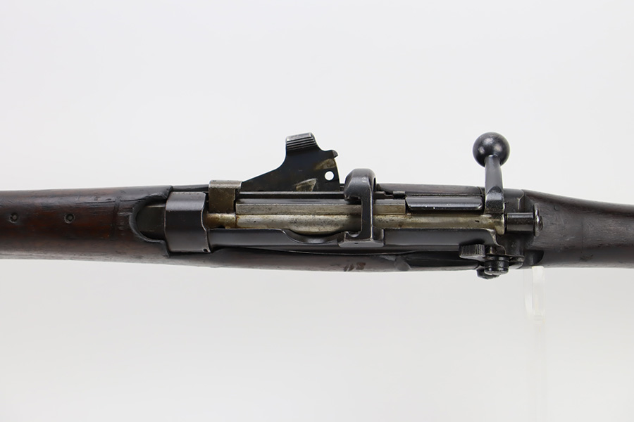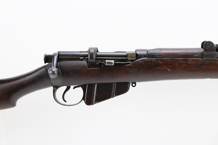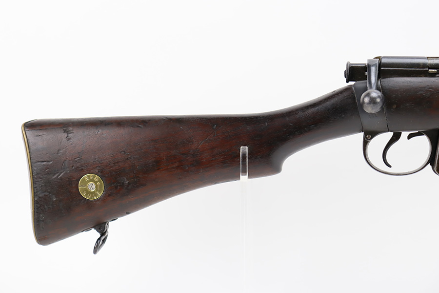 11/3/23 – This is a nice London Small Arms SHTLE III rifle issued to the British military in 1913. All matching with the proper British proofs throughout. England export mark on the receiver. No legible numbering on the stock. The stock disc is likely a replacement. The finish on the metal rates about 90%. While there is not much actual finish loss, there is noticeable brown patina throughout. The wood shows minor bruising and scratching throughout with a small hairline crack in the upper handguard in front of the receiver. Minty bore.
