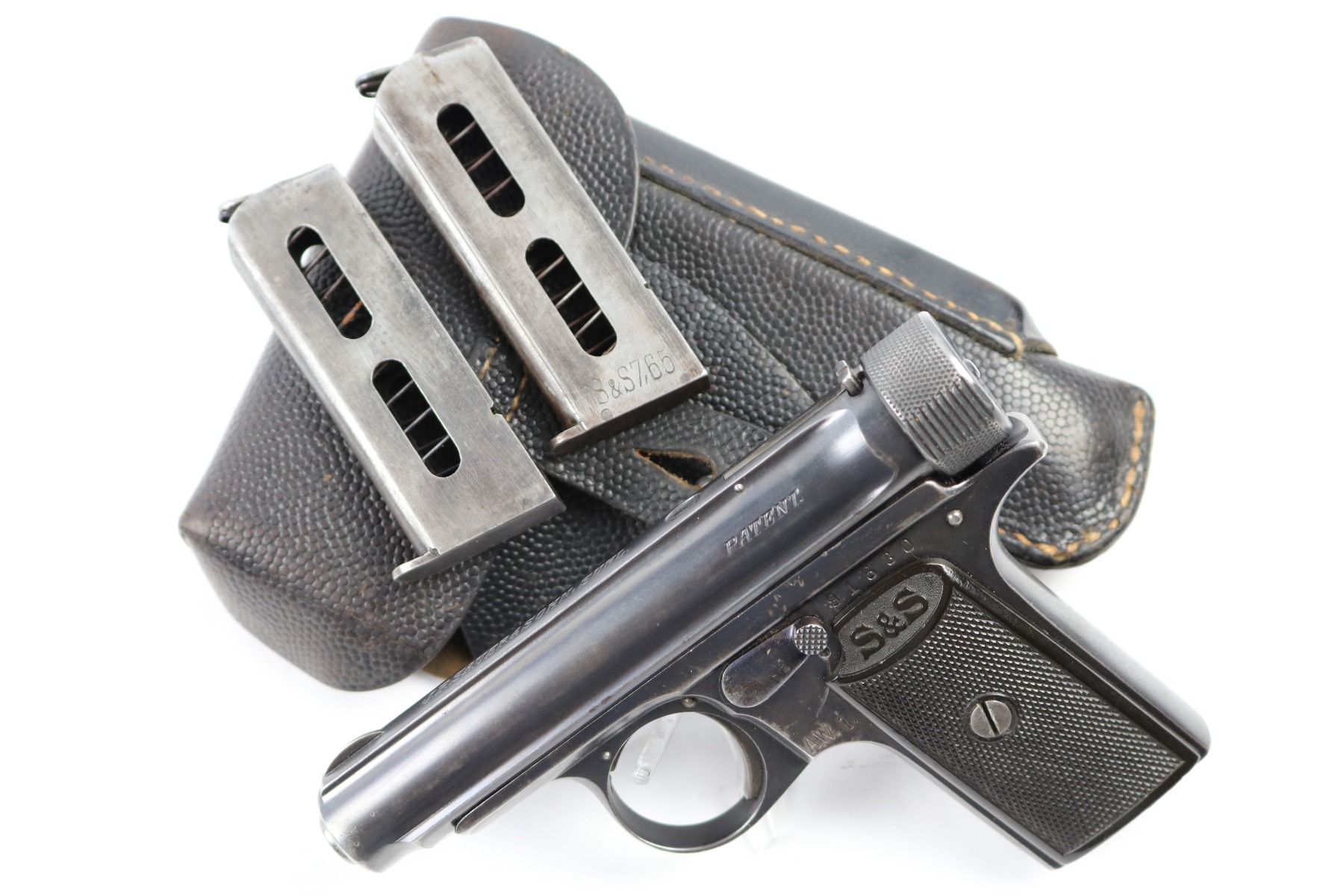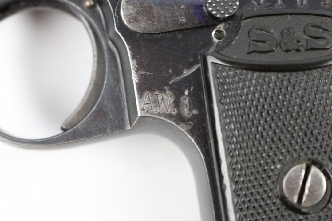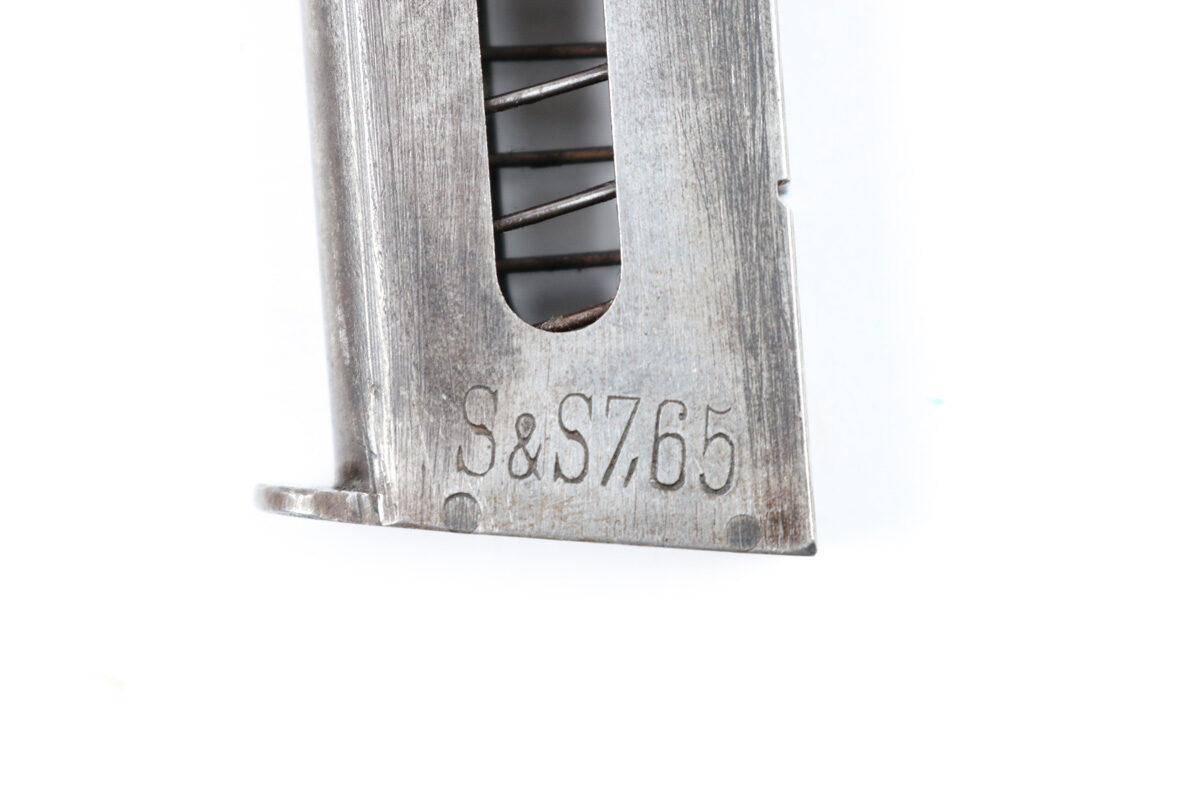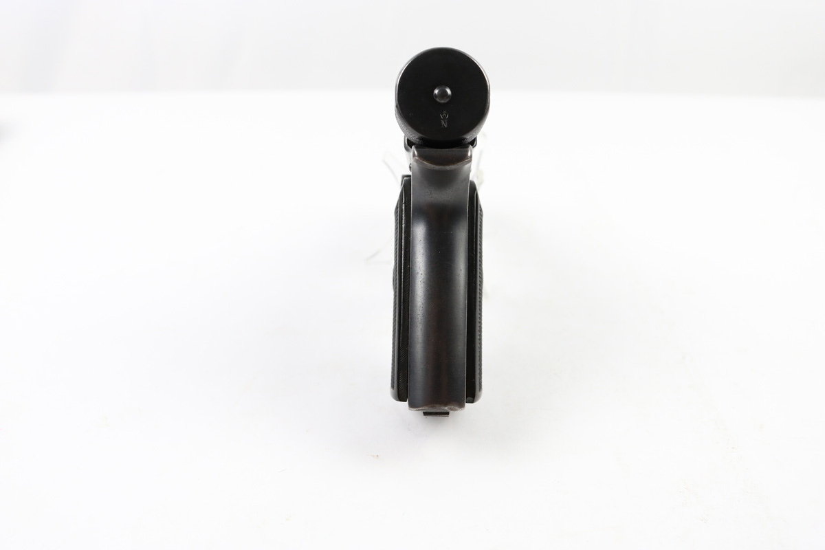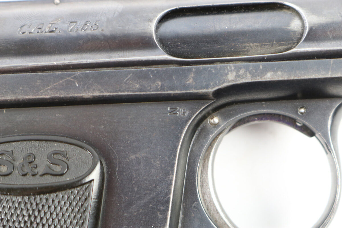 10/15/18 – This is an original Sauer model 1913 pistol 2nd variation made during the 1920s. The pistol comes with two original period correct magazines and a pebble grain holster. The holster appears to be a modified FN 1922 holster. The holster is waffen eagle stamped on the interior leather and next to that is what could potentially be a police stamp. Similarly, the pistol has an “AW 1” stamp on the frame near the trigger guard. We theorize that this is a police unit stamp. The pistol has normal wear throughout. Some light pin pricking on the front and back straps, light edge wear on the slide, and muzzle wear. The original blued finish is roughly 92% in tact. Original bakelite grips are excellent with no cracks or chips. The bore is rated at 7 out of 10. This is due to light surface wear on the grooves, and signs of general use. Guaranteed all original and fully functional.