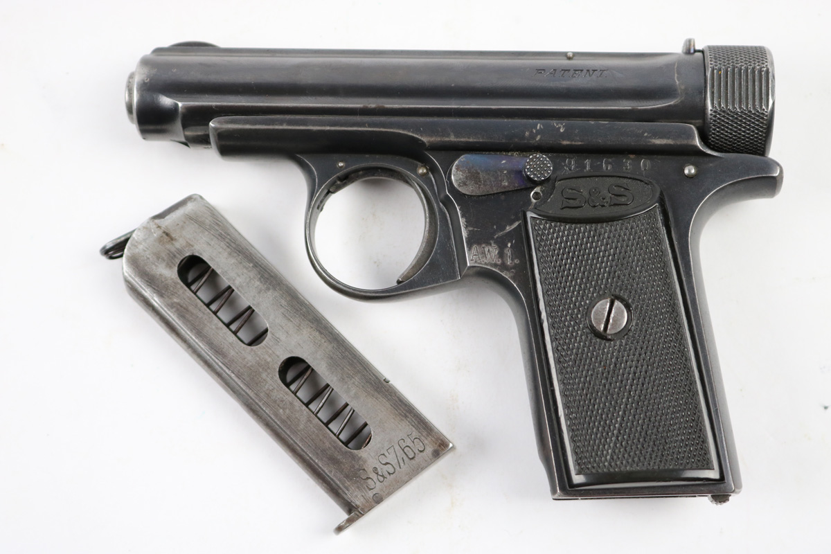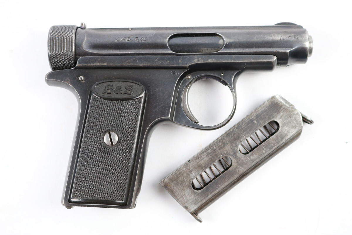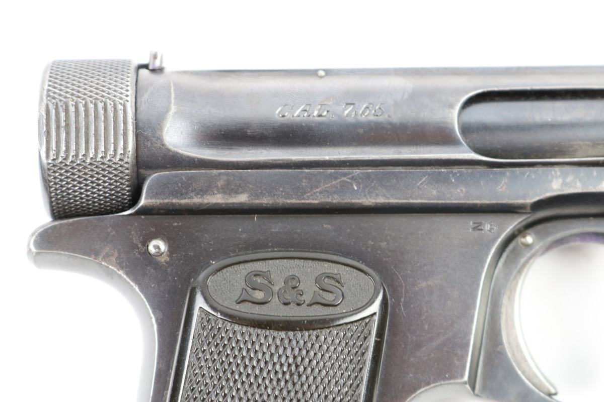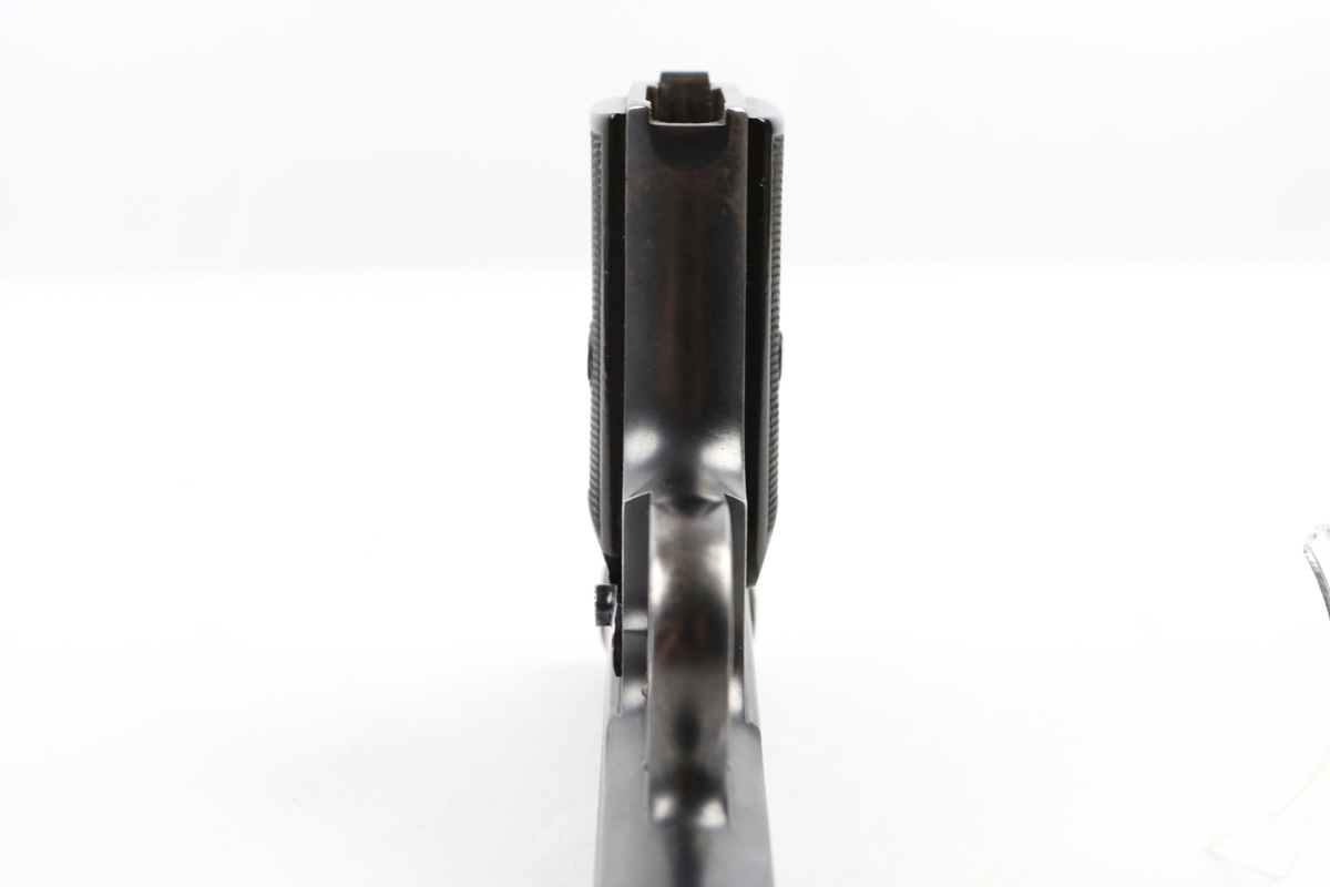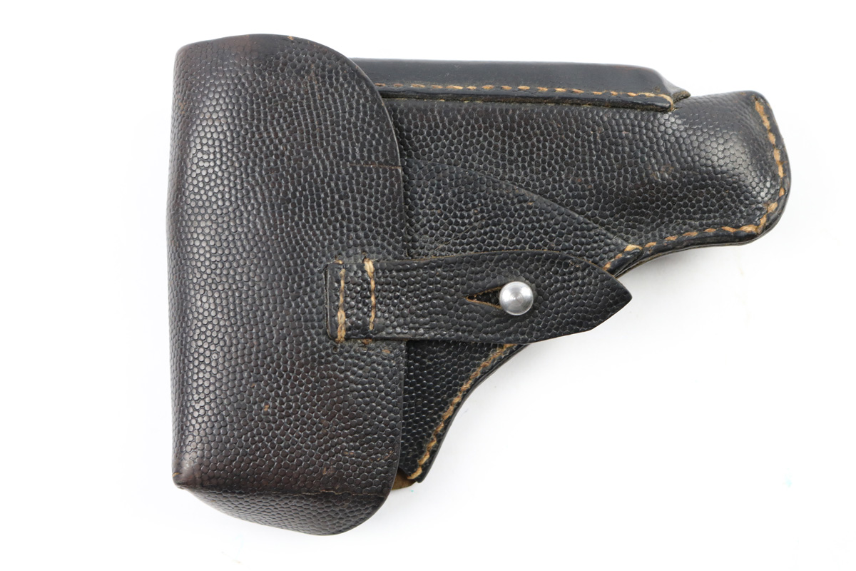 10/15/18 – This is an original Sauer model 1913 pistol 2nd variation made during the 1920s. The pistol comes with two original period correct magazines and a pebble grain holster. The holster appears to be a modified FN 1922 holster. The holster is waffen eagle stamped on the interior leather and next to that is what could potentially be a police stamp. Similarly, the pistol has an “AW 1” stamp on the frame near the trigger guard. We theorize that this is a police unit stamp. The pistol has normal wear throughout. Some light pin pricking on the front and back straps, light edge wear on the slide, and muzzle wear. The original blued finish is roughly 92% in tact. Original bakelite grips are excellent with no cracks or chips. The bore is rated at 7 out of 10. This is due to light surface wear on the grooves, and signs of general use. Guaranteed all original and fully functional.