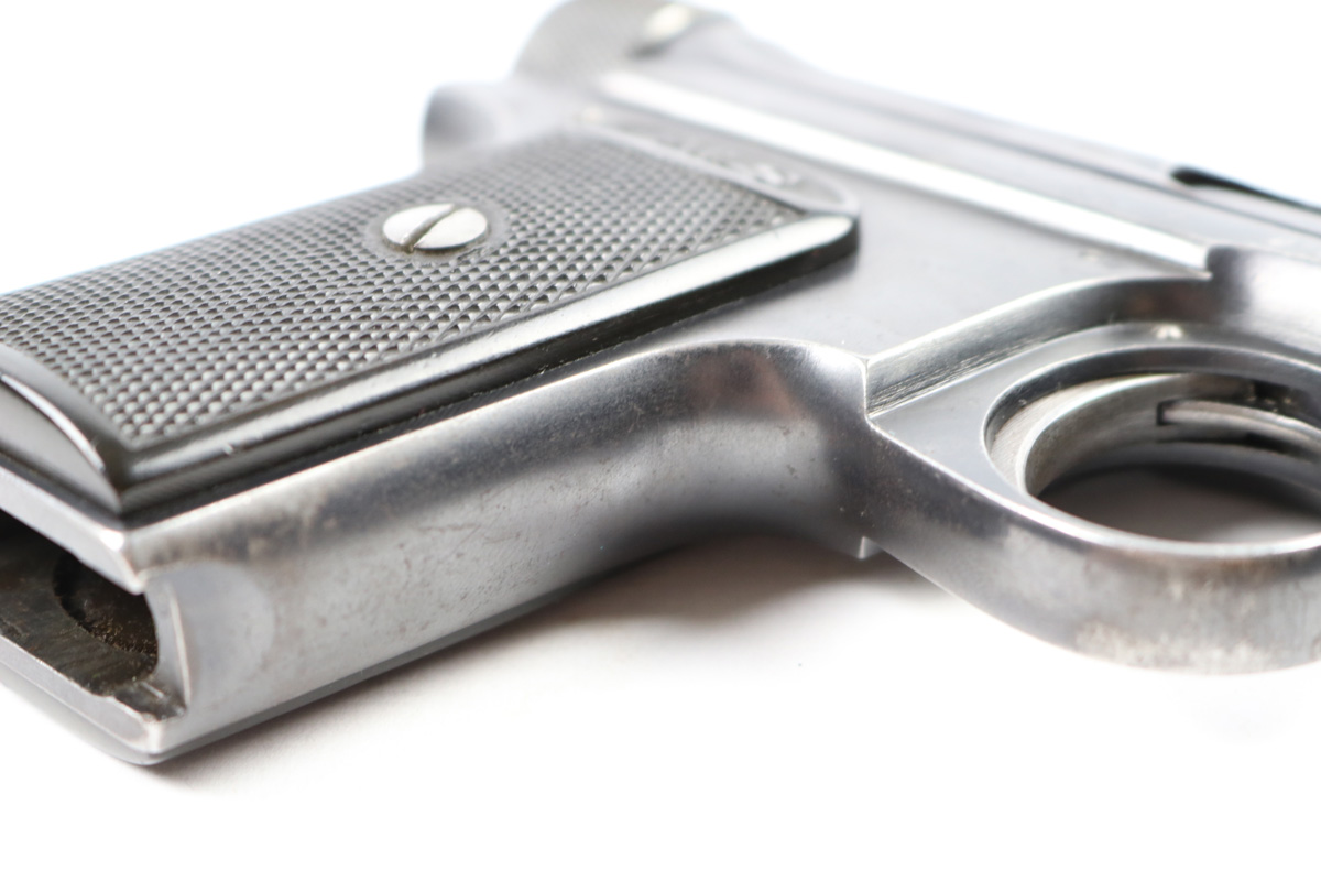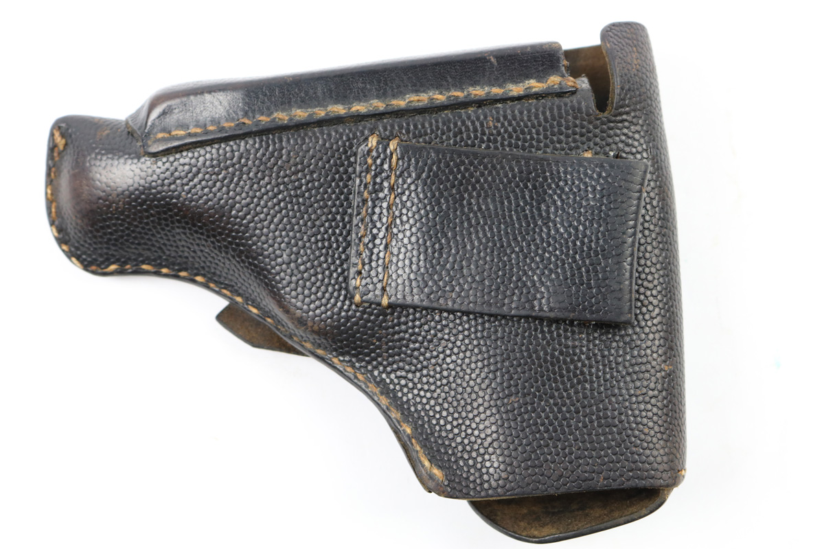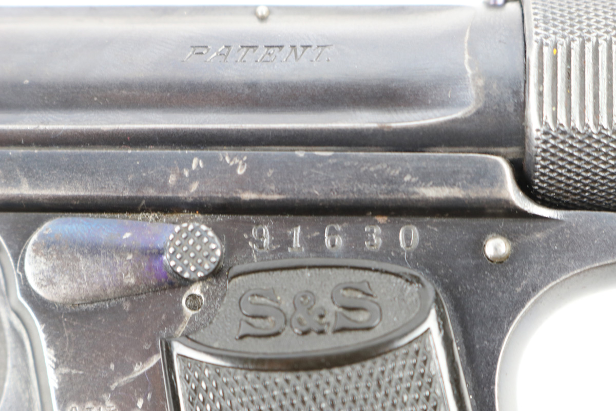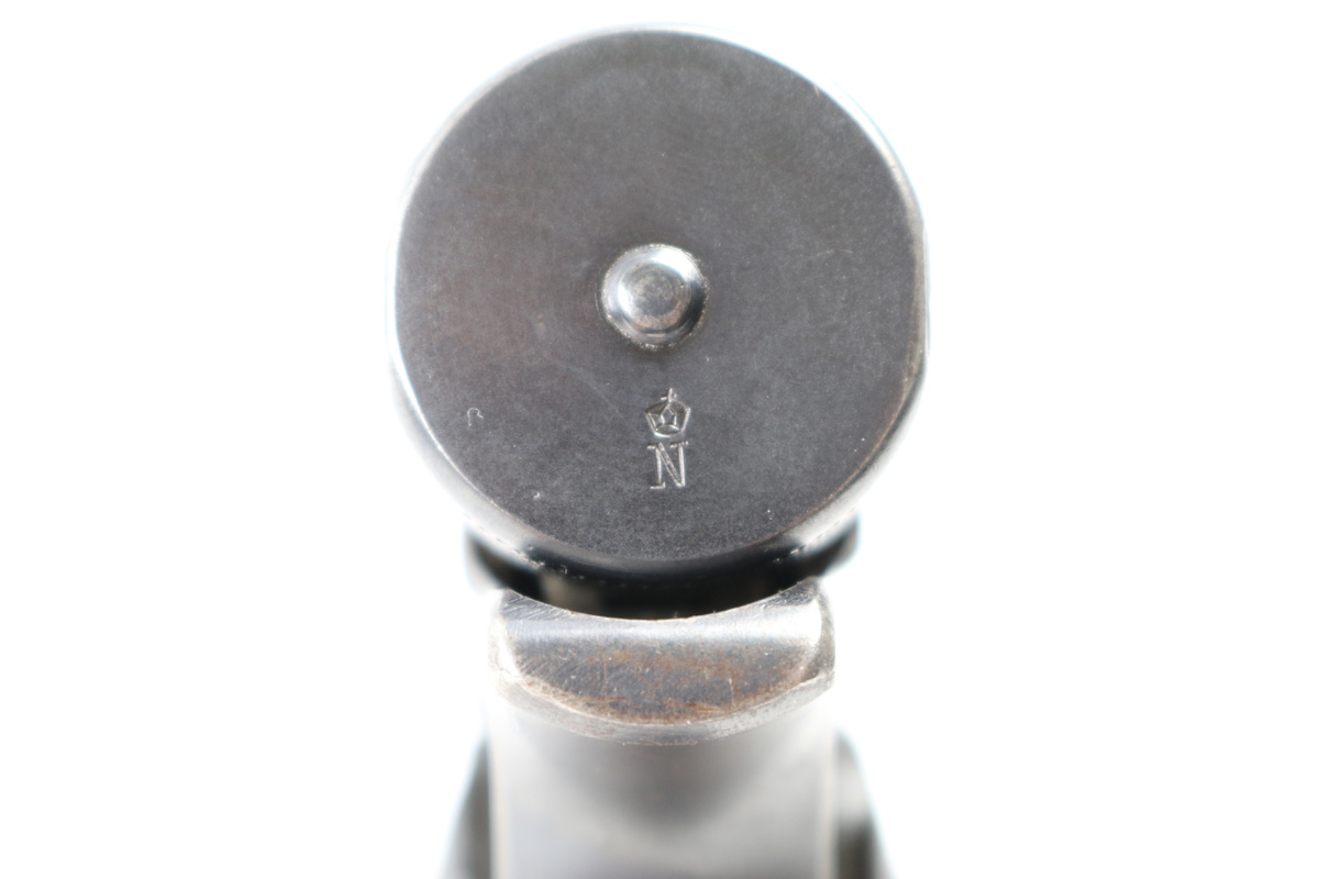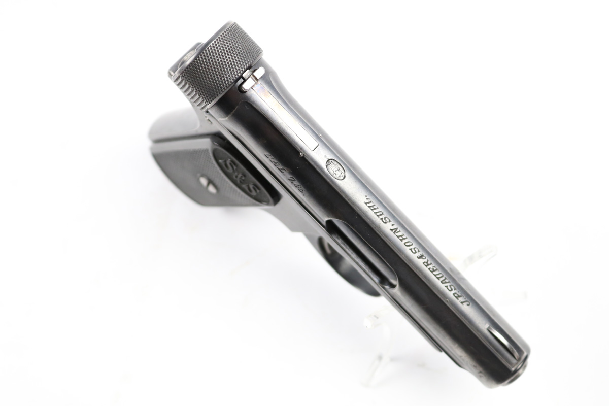 10/15/18 – This is an original Sauer model 1913 pistol 2nd variation made during the 1920s. The pistol comes with two original period correct magazines and a pebble grain holster. The holster appears to be a modified FN 1922 holster. The holster is waffen eagle stamped on the interior leather and next to that is what could potentially be a police stamp. Similarly, the pistol has an “AW 1” stamp on the frame near the trigger guard. We theorize that this is a police unit stamp. The pistol has normal wear throughout. Some light pin pricking on the front and back straps, light edge wear on the slide, and muzzle wear. The original blued finish is roughly 92% in tact. Original bakelite grips are excellent with no cracks or chips. The bore is rated at 7 out of 10. This is due to light surface wear on the grooves, and signs of general use. Guaranteed all original and fully functional.