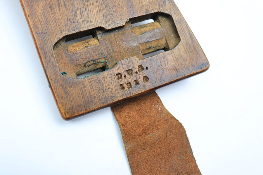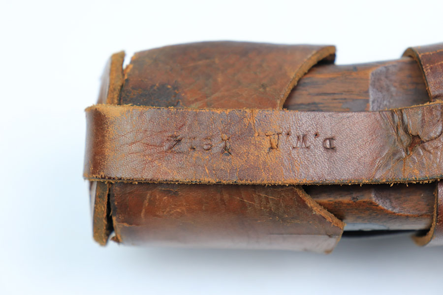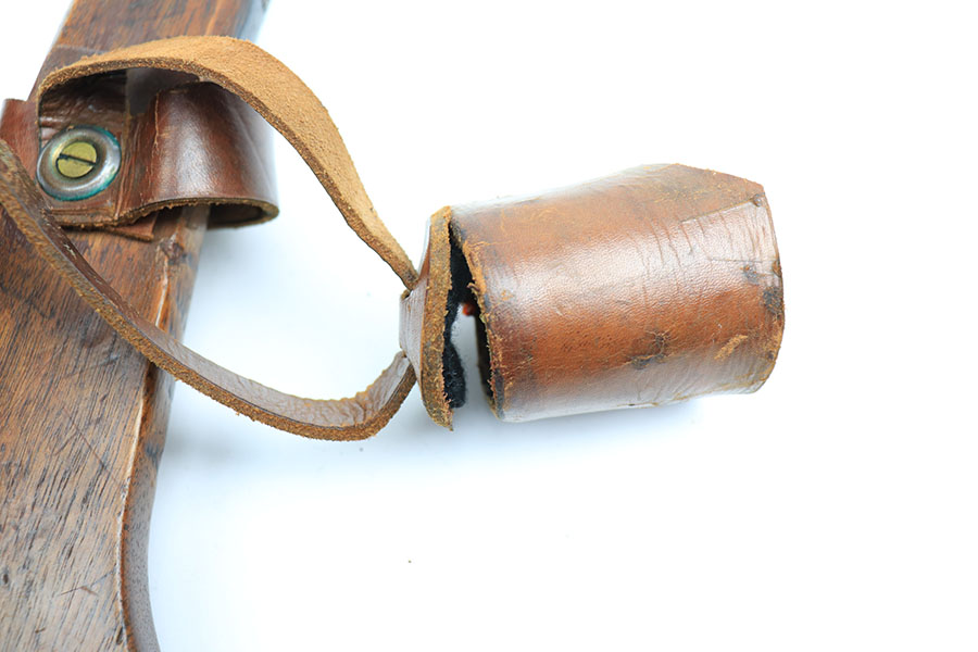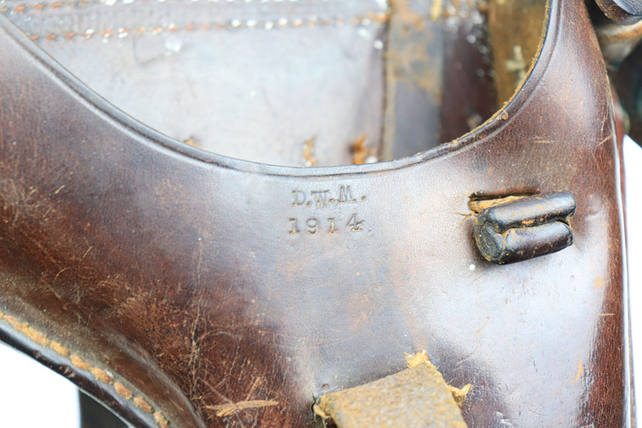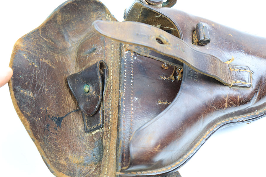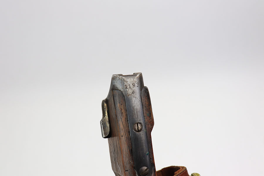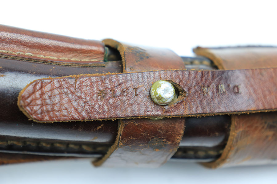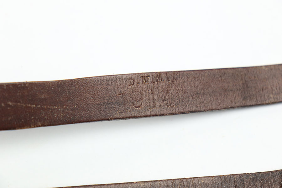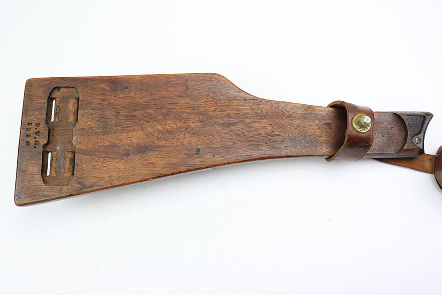 1/12/21 – This is an original WW1 era artillery luger holster with a shoulder stock and cleaning rod. The holster is stamped on the closure strap and the front leather “D.W.M. 1914”. A similar stamp is on the strap coming up the toe of the stock and securing the cup. The top strap coming from the back of the stock also has this D.W.M. 1914 stamp. Again, this stamp is found on the shoulder straps. The back of the stock is imperial proof stamped. The holster is in great overall condition with nice leather, completely in tact and has some normal signs of aging and use. The stitching is all in tact and original. The cleaning rod is stamped on the wood, as shown in photos.