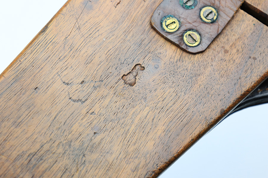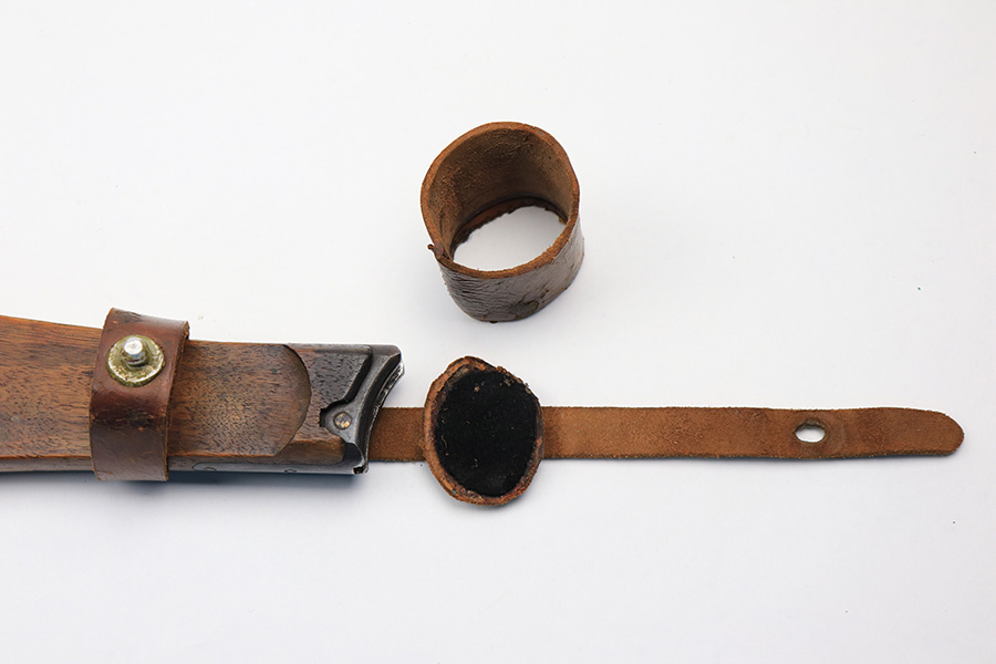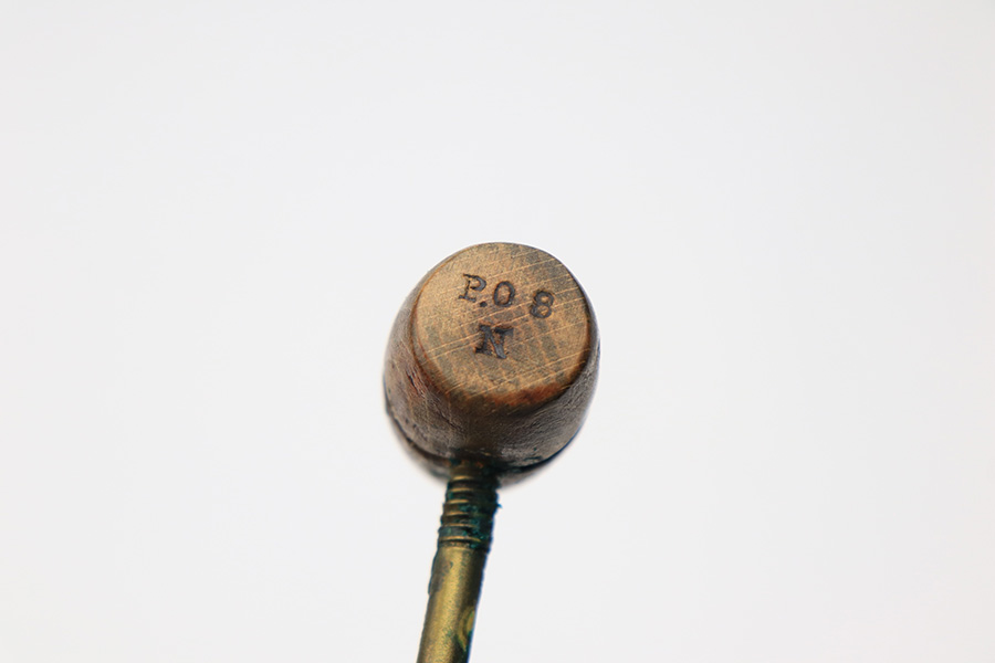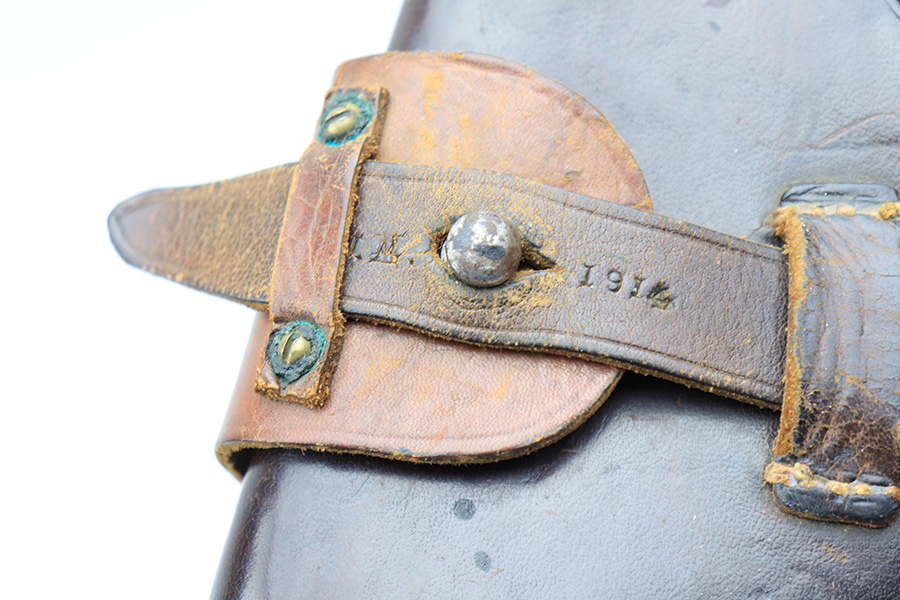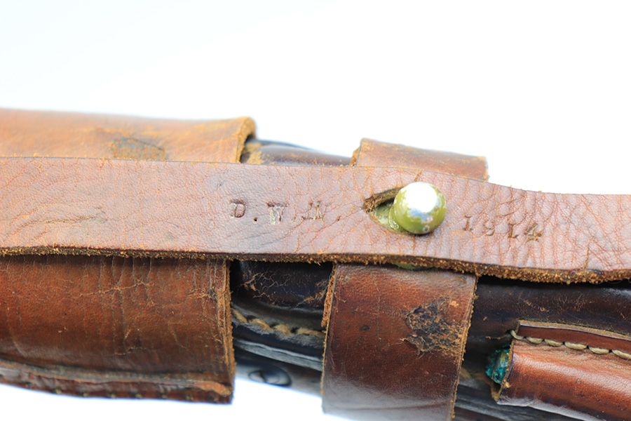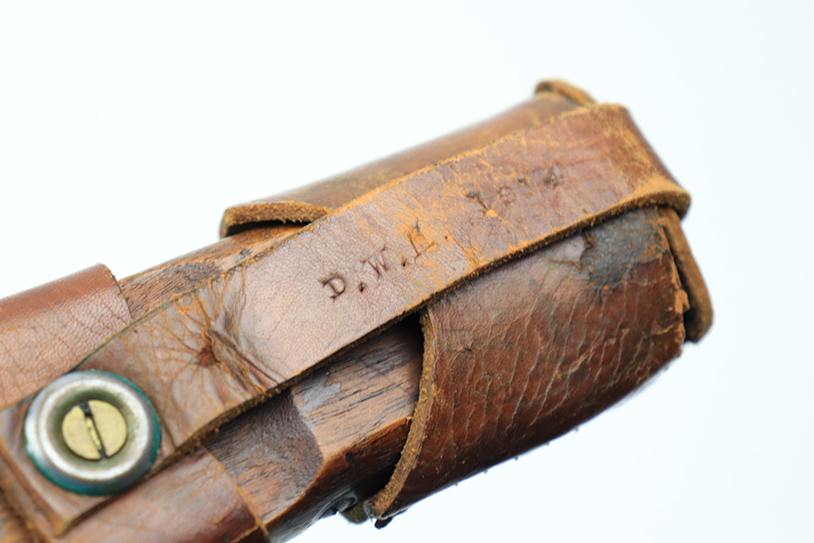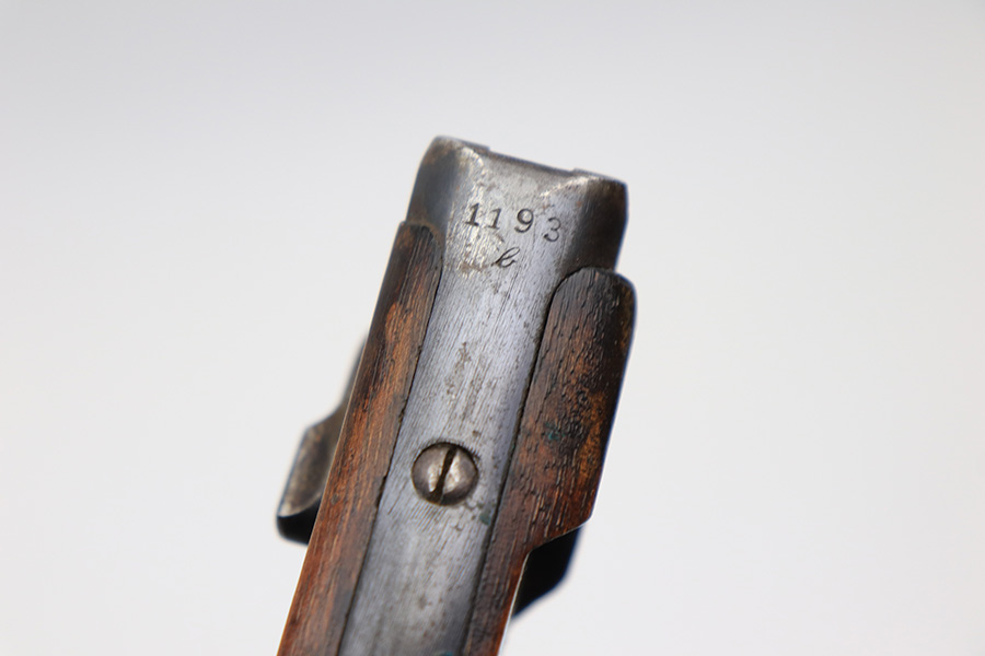 3/25/22 – This is an original WW1 Artillery Luger holster with shoulder stock, leather straps, and a cleaning rod. The holster is stamped “D.W.M. 1914” into the leather in multiple different areas including the closure strap, stock toe attachment strap, shoulder strap, front leather under the closure strap, on the wood stock, and on the cleaning rod. We can’t verify if these stamps are original, but it’s unlikely these are factory stamps as there aren’t other examples with this type of stamping. The wood is original and in great condition with an imperial proof stamp. The metal is serial numbered “1193b”. The leather is in good condition with normal surface wear and aging throughout but no major issues. The leather cup is not attached at the base, but this is generally a minor issue. No notable stitching flaws.