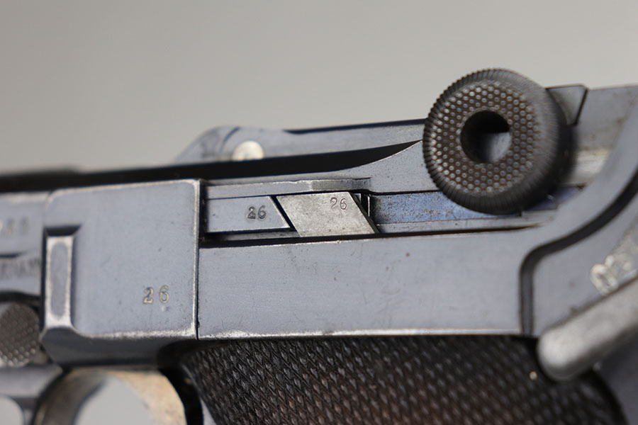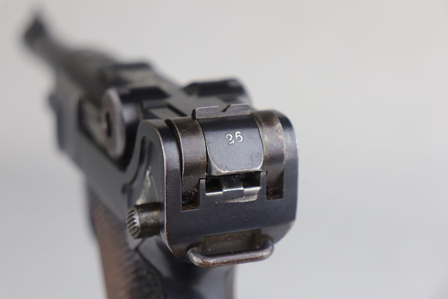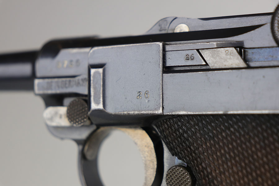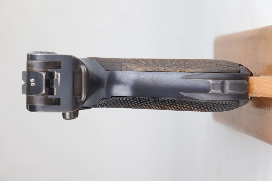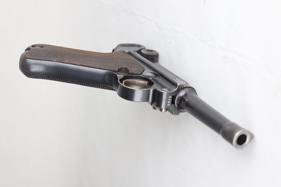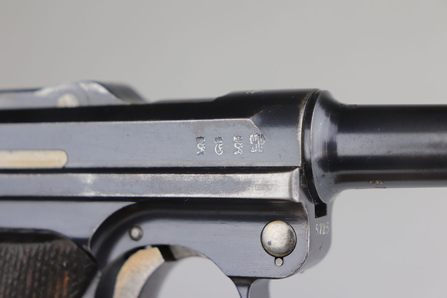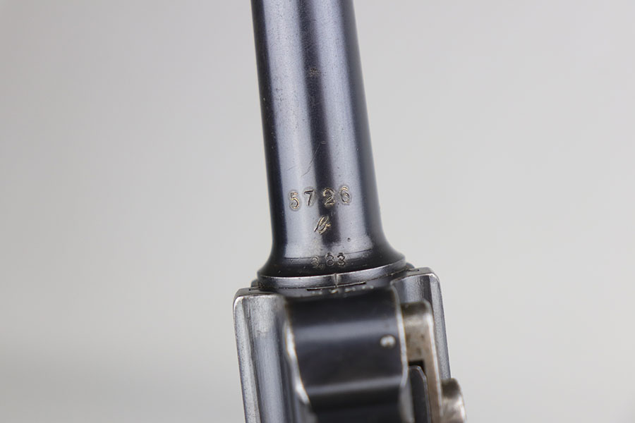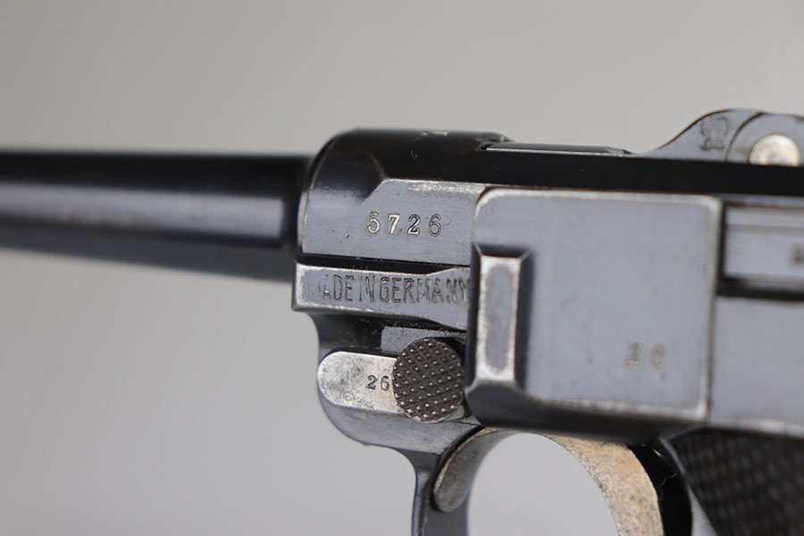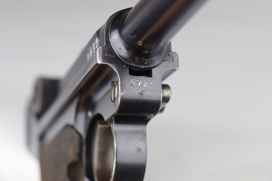 8/5/20 – This is an all matching and original DWM Luger from 1914. The pistol has about 92-94% of the original blue, with wear on either side of the muzzle, sideplate, right side rail and ears of the receiver. There’s also some oxidation on the front strap. The left side rail is marked ‘MADE IN GERMANY’, indicating it was sold commercially after the war. The grips are period original with Imperial proofs but mismatched to the gun. Magazine is also correct for the gun but mismatched. Excellent bore.