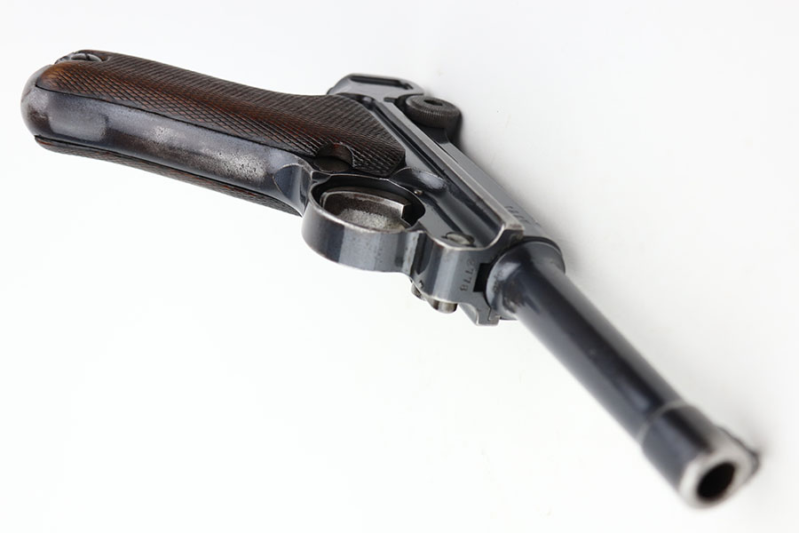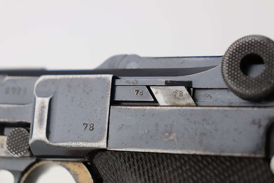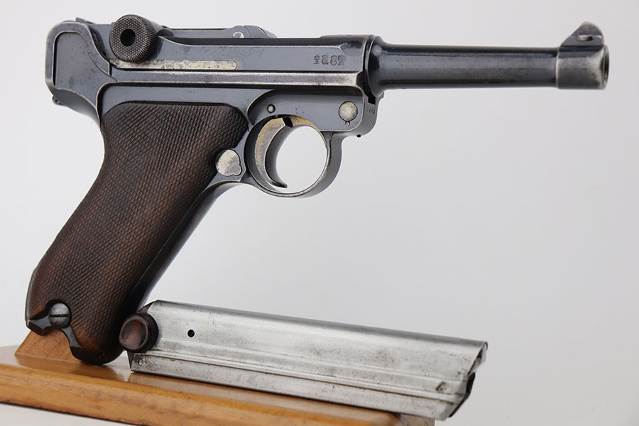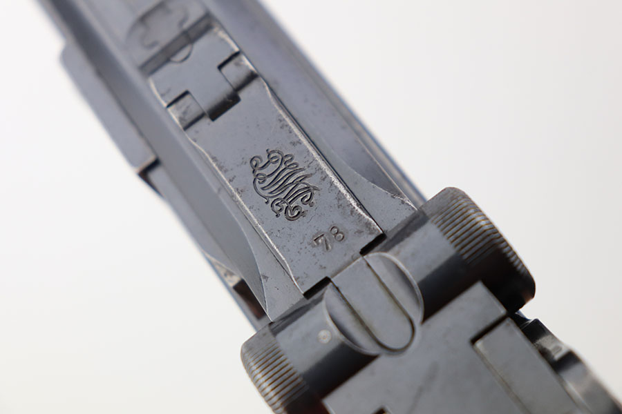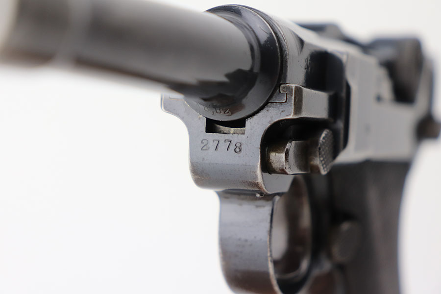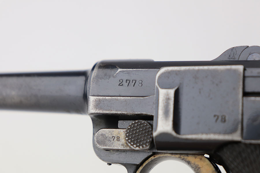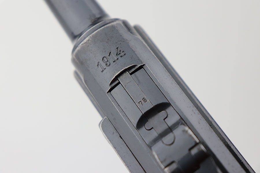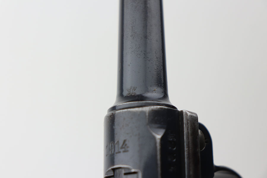 4/23/21 – This is a matching and original DWM Luger from 1914 that went to the German military during World War I. The finish shows some wear on all major surface areas, as well as oxidation and the barrel has some freckling. A previous owner also lightly scratched his initials into the right side of the frame. Period original magazine with blank wood base. The grips are worn and smoothed out but are original to the gun with the matching serial inside. Bore has strong rifling but some frost in the grooves.