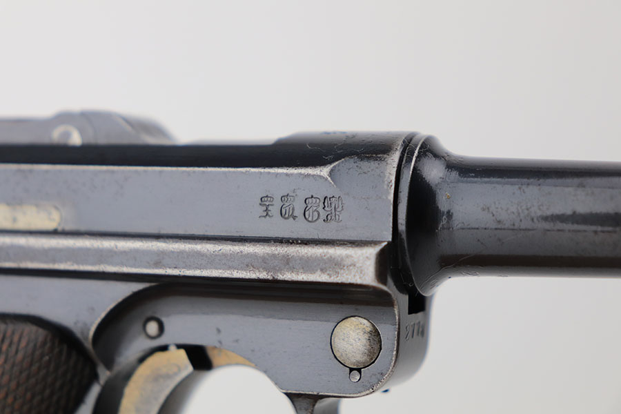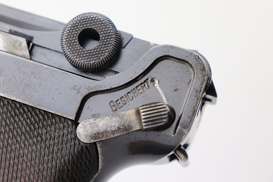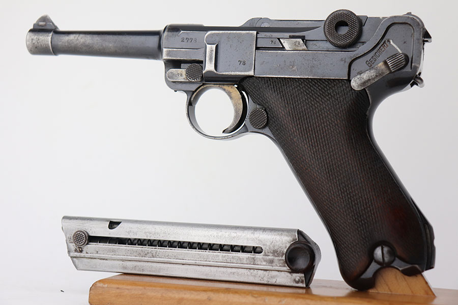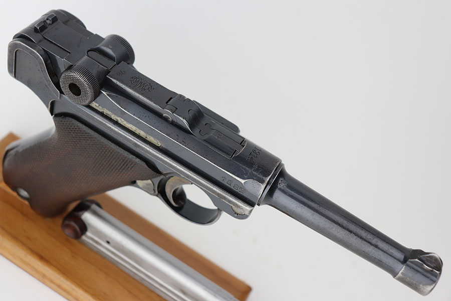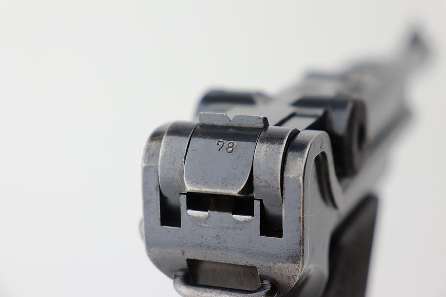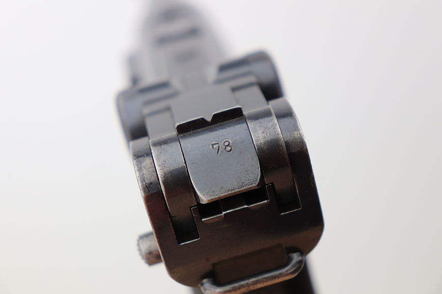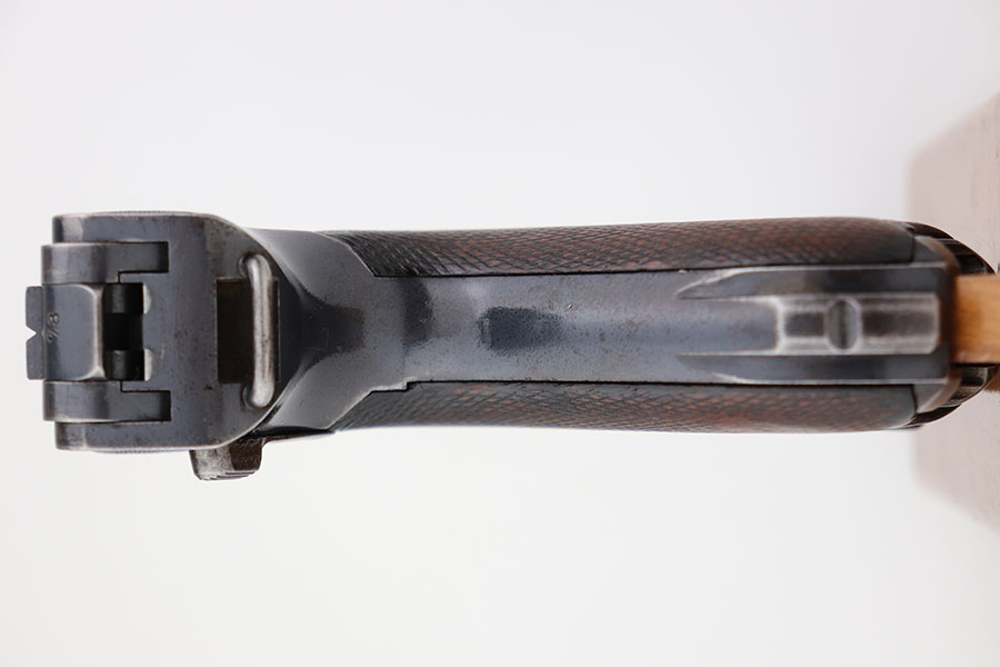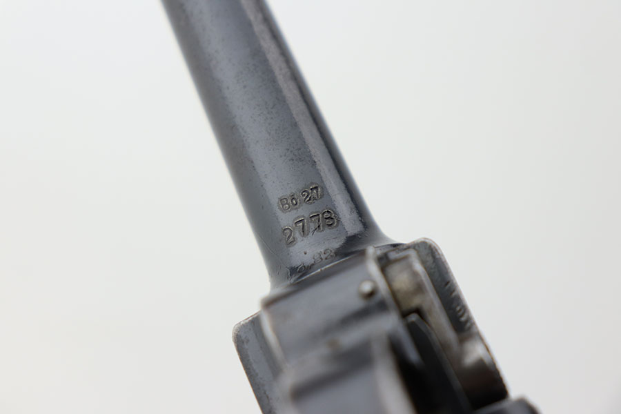 4/23/21 – This is a matching and original DWM Luger from 1914 that went to the German military during World War I. The finish shows some wear on all major surface areas, as well as oxidation and the barrel has some freckling. A previous owner also lightly scratched his initials into the right side of the frame. Period original magazine with blank wood base. The grips are worn and smoothed out but are original to the gun with the matching serial inside. Bore has strong rifling but some frost in the grooves.