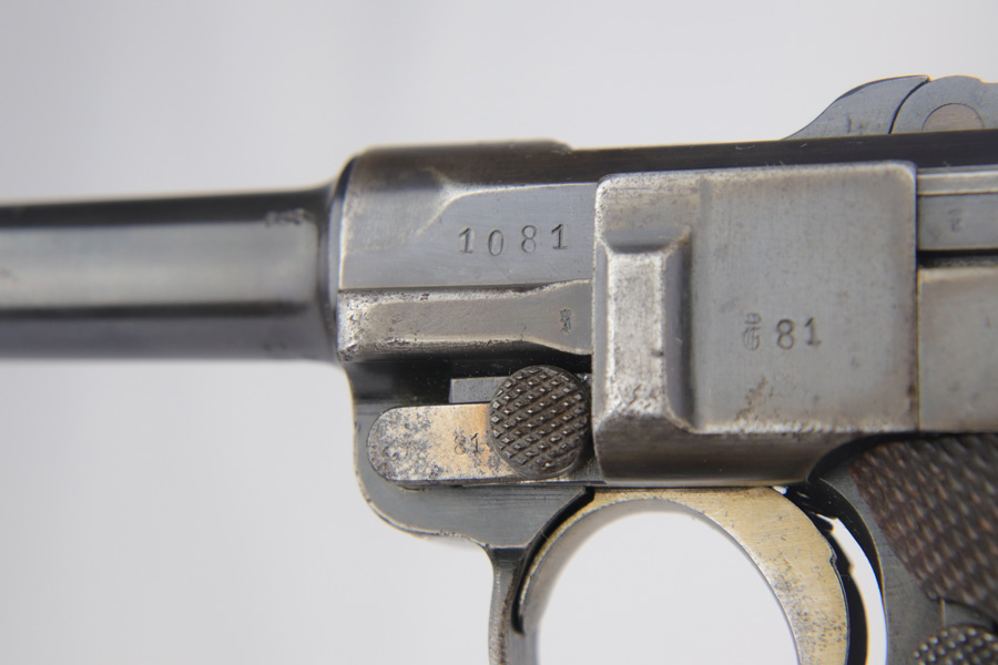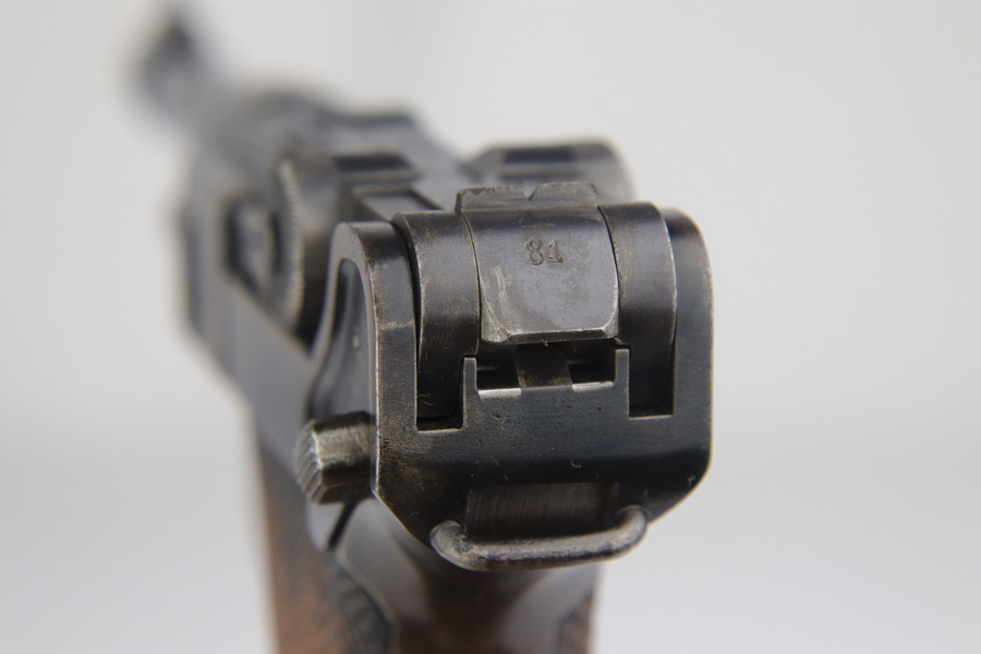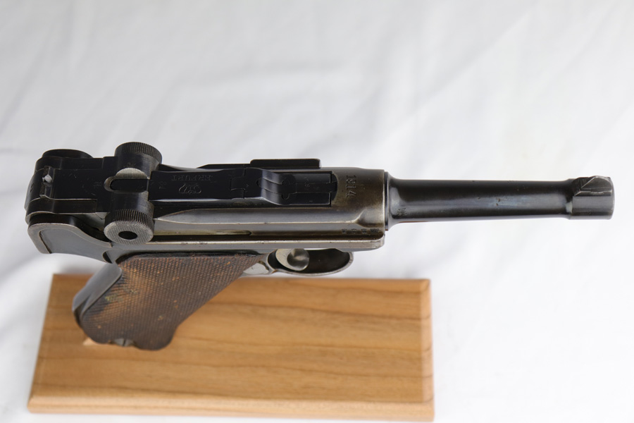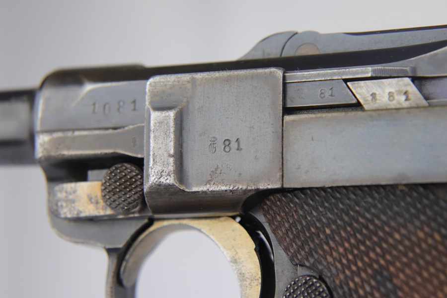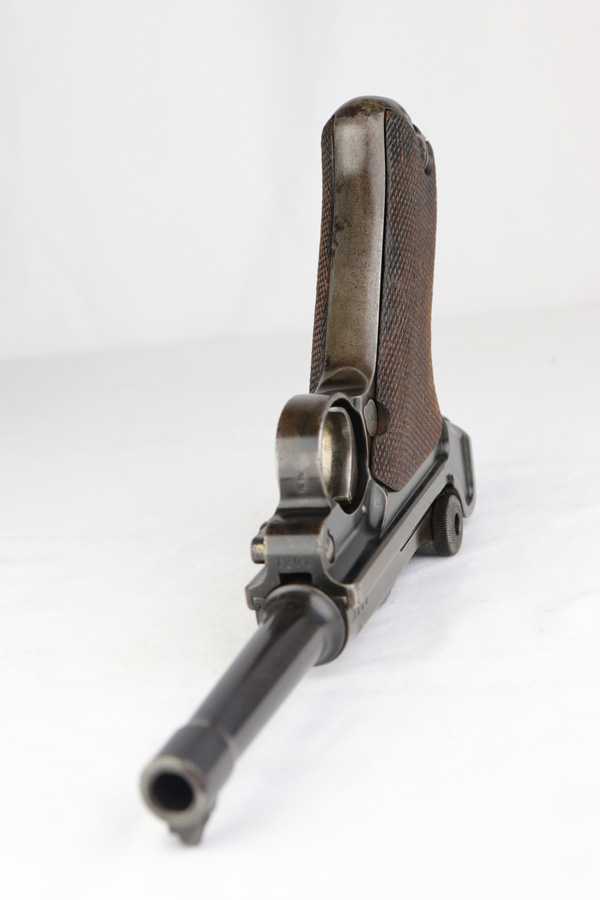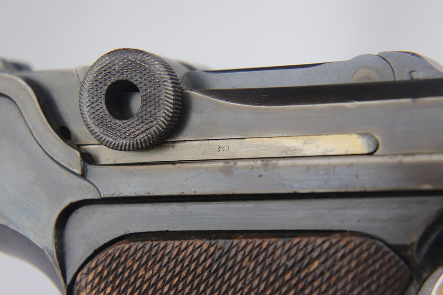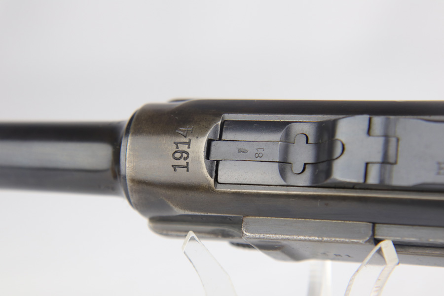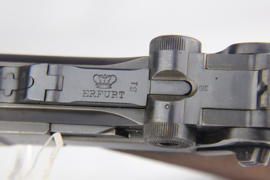 2/22/19 – This is an original Erfurt produced Luger from 1914 that was issued to the German Military. All numbered parts are matching and the original finish rates at about 60-70% with obvious thinning and patina throughout. A few areas of surface freckling but no major areas of corrosion or deep pitting. The grips are numbered and matching to the pistol but the magazine is mismatched, though it is an original Erfurt magazine. The grip screws are original and Erfurt marked. Bore shows some frost but mostly shiny with good rifling. Decent straw remains on some small parts, especially the trigger. Small parts are also Erfurt marked.