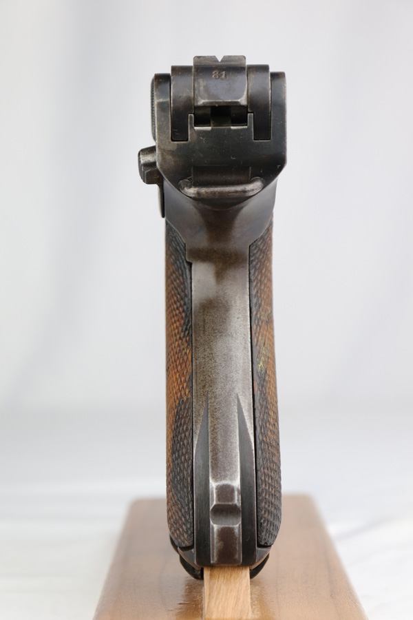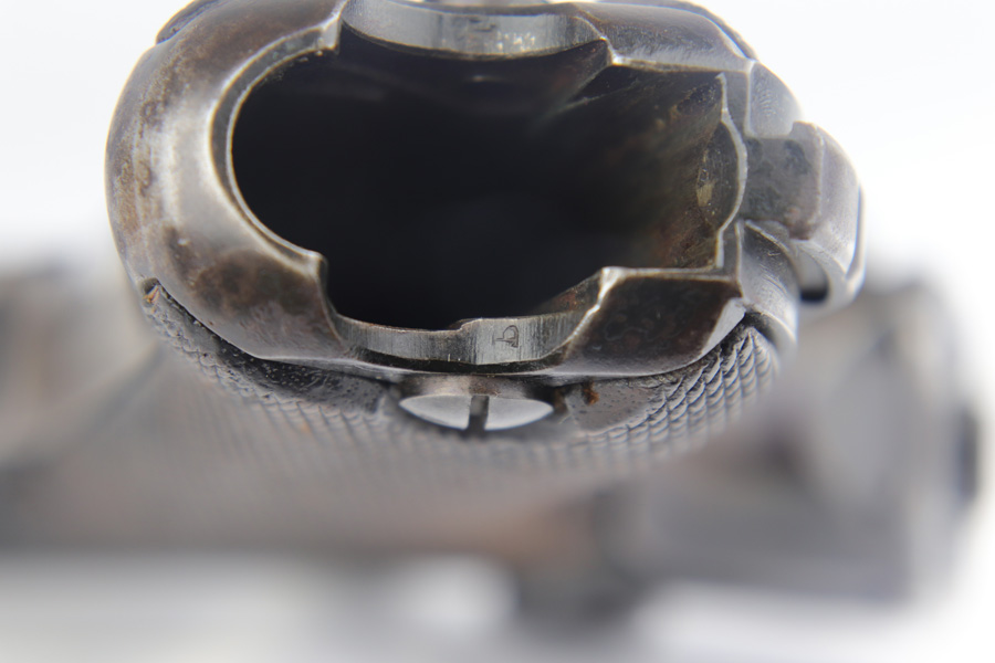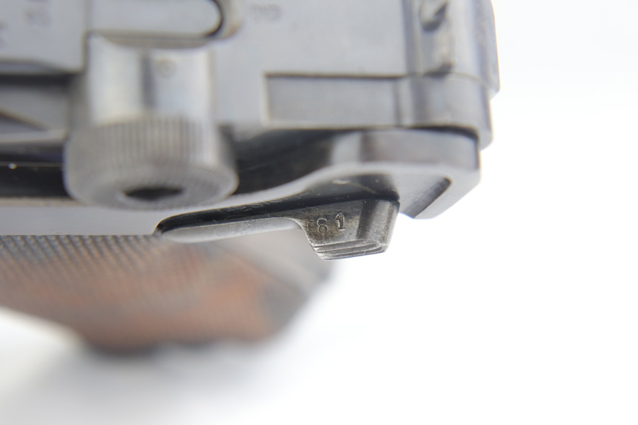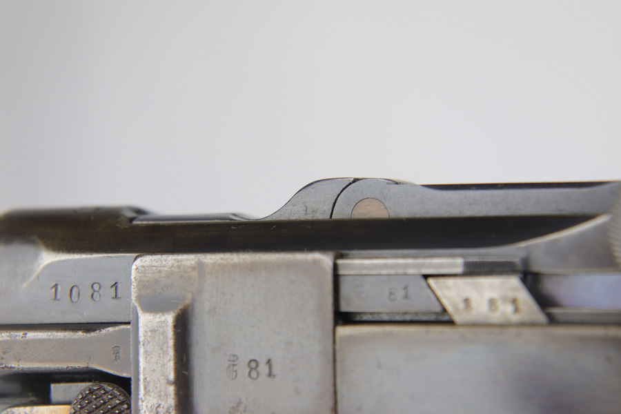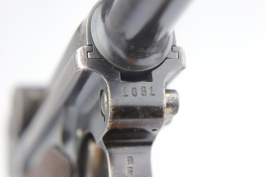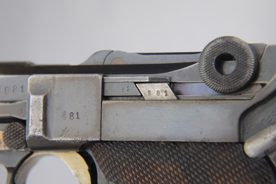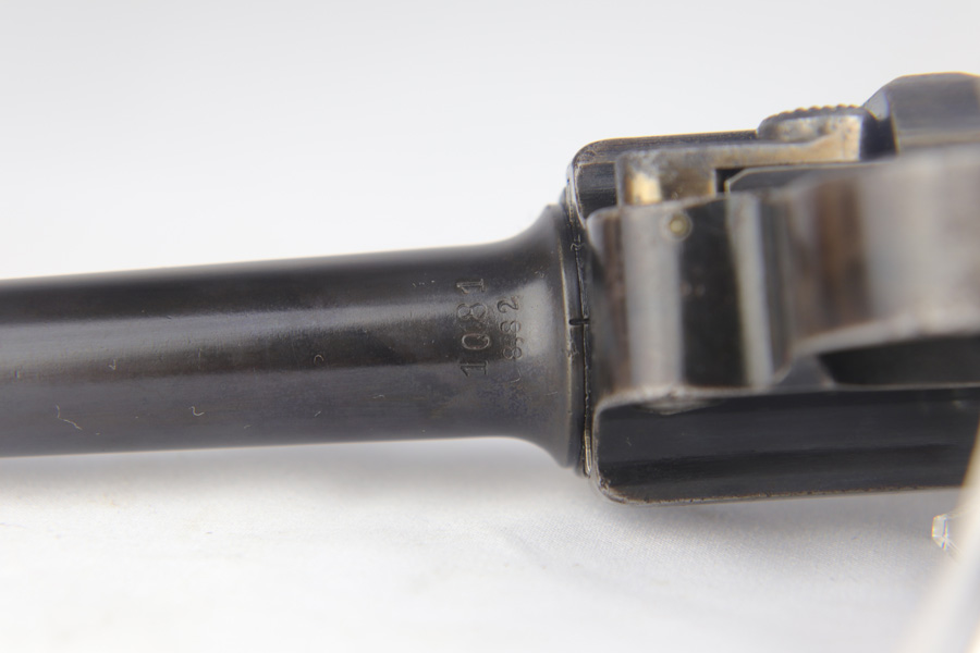 2/22/19 – This is an original Erfurt produced Luger from 1914 that was issued to the German Military. All numbered parts are matching and the original finish rates at about 60-70% with obvious thinning and patina throughout. A few areas of surface freckling but no major areas of corrosion or deep pitting. The grips are numbered and matching to the pistol but the magazine is mismatched, though it is an original Erfurt magazine. The grip screws are original and Erfurt marked. Bore shows some frost but mostly shiny with good rifling. Decent straw remains on some small parts, especially the trigger. Small parts are also Erfurt marked.