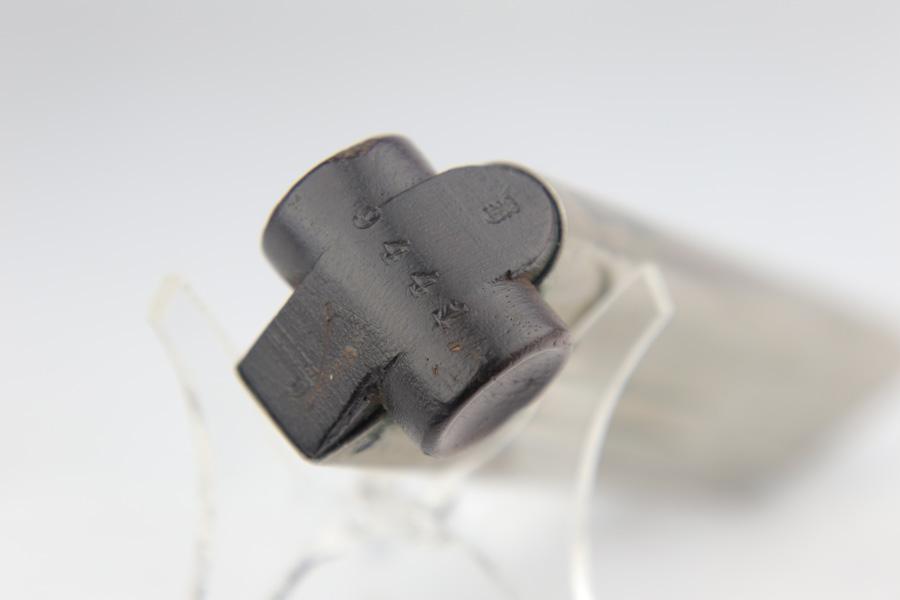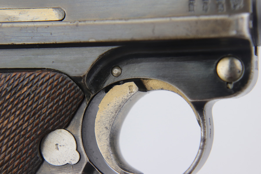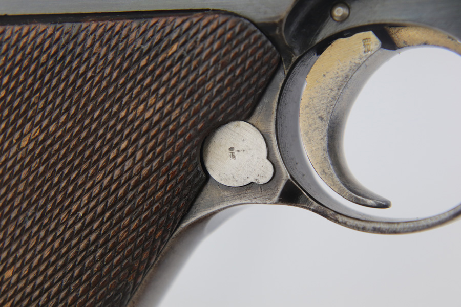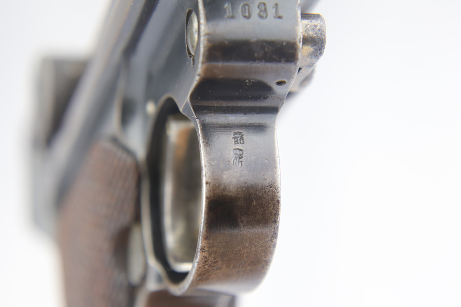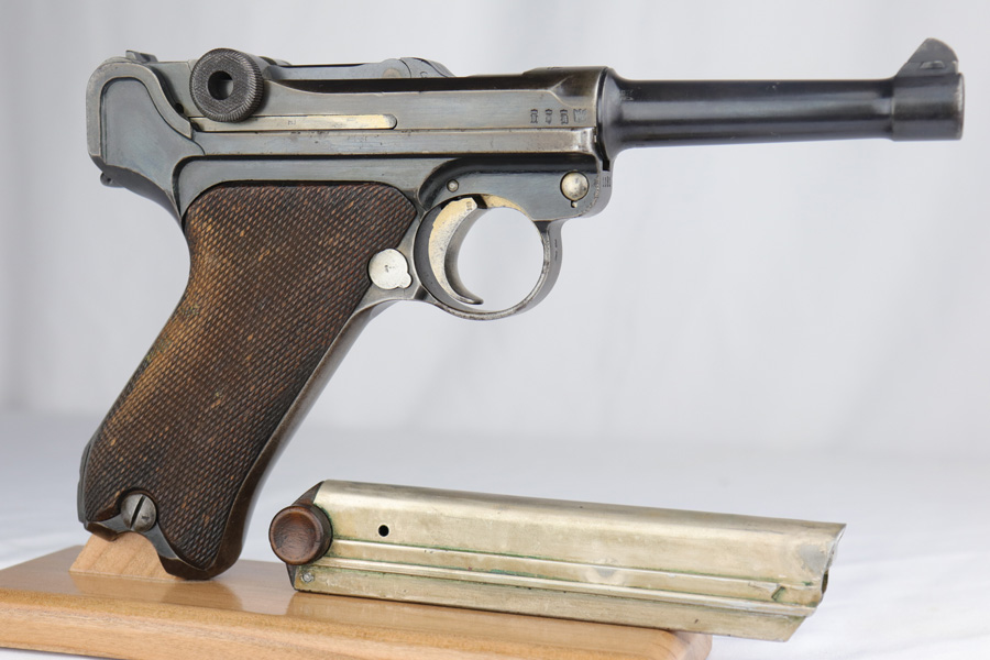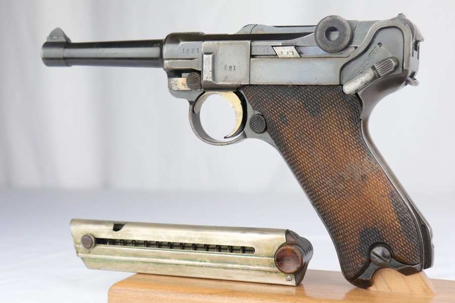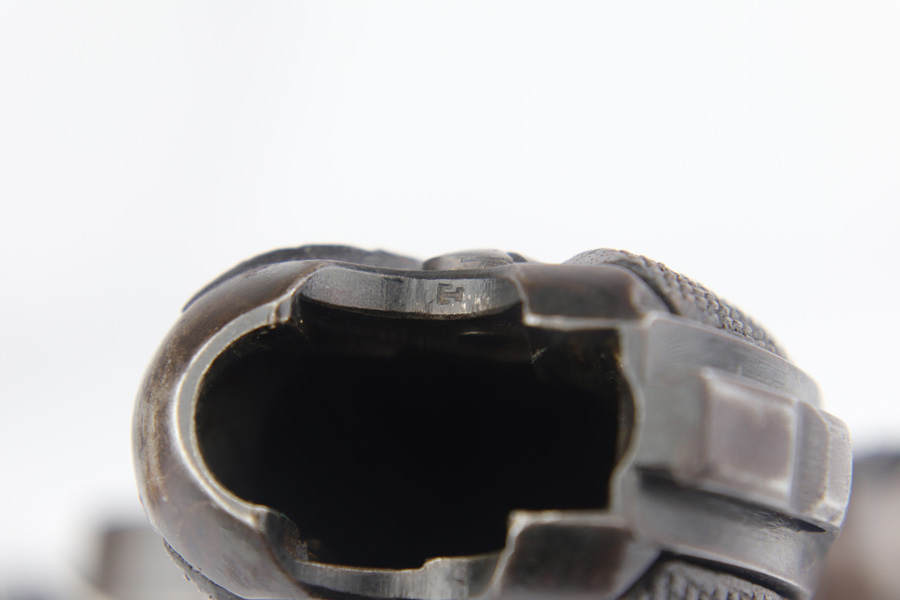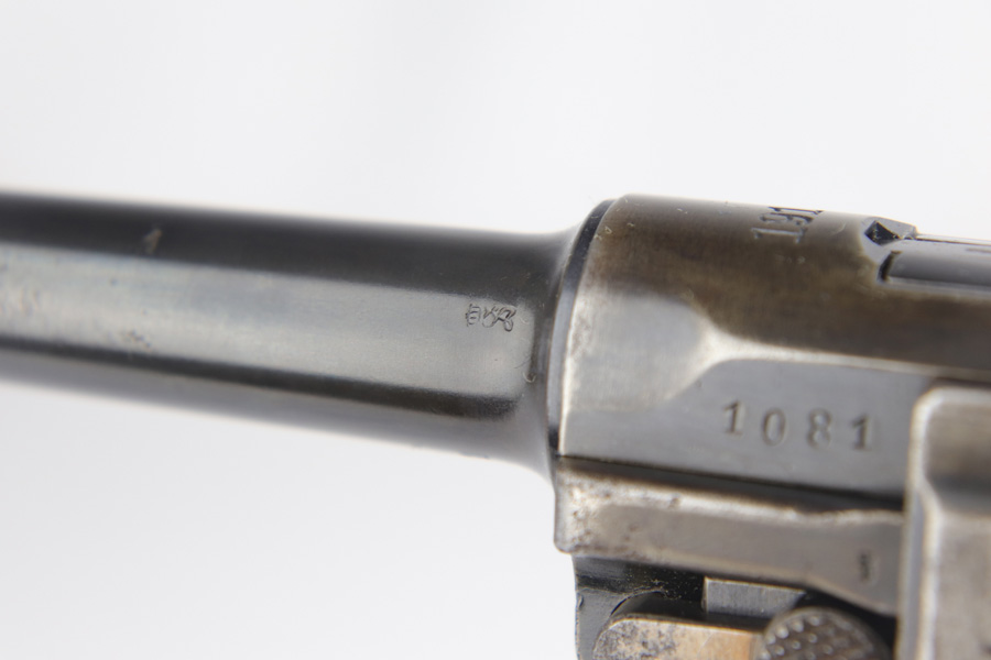2/22/19 – This is an original Erfurt produced Luger from 1914 that was issued to the German Military. All numbered parts are matching and the original finish rates at about 60-70% with obvious thinning and patina throughout. A few areas of surface freckling but no major areas of corrosion or deep pitting. The grips are numbered and matching to the pistol but the magazine is mismatched, though it is an original Erfurt magazine. The grip screws are original and Erfurt marked. Bore shows some frost but mostly shiny with good rifling. Decent straw remains on some small parts, especially the trigger. Small parts are also Erfurt marked.