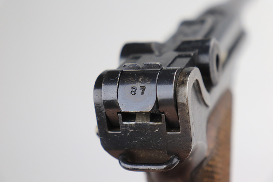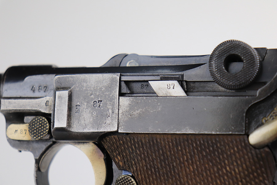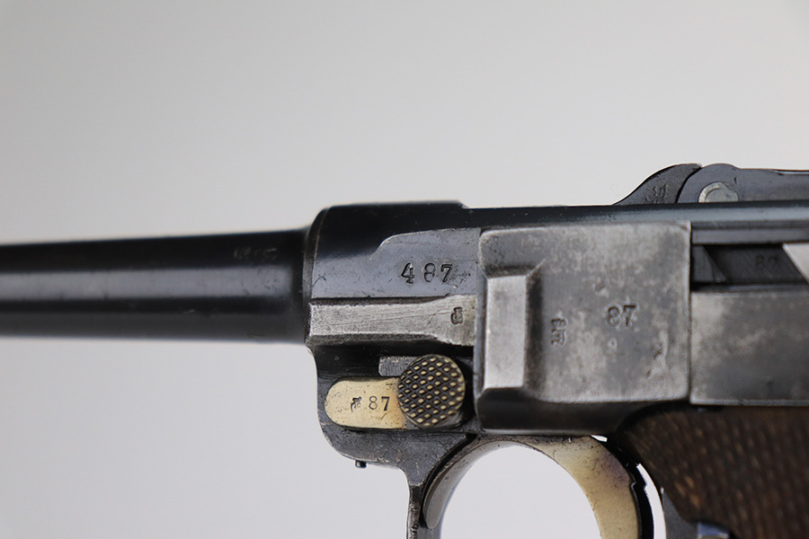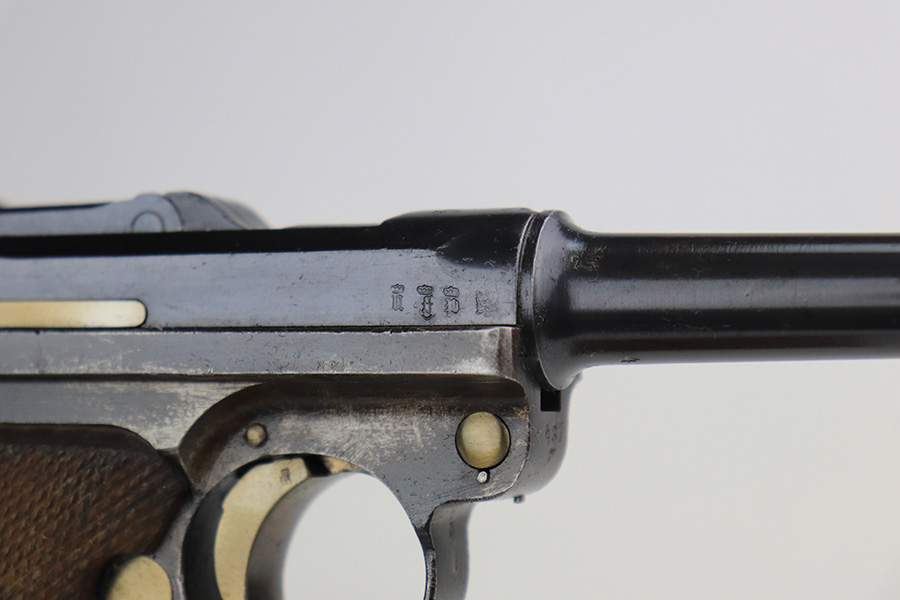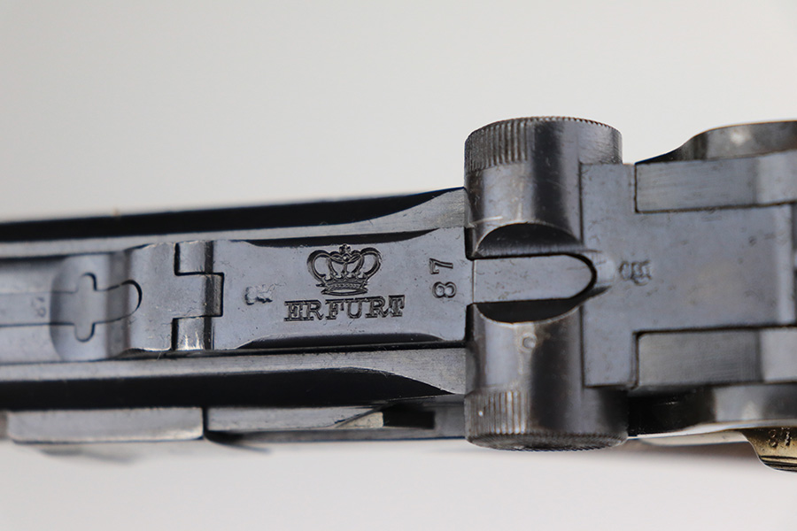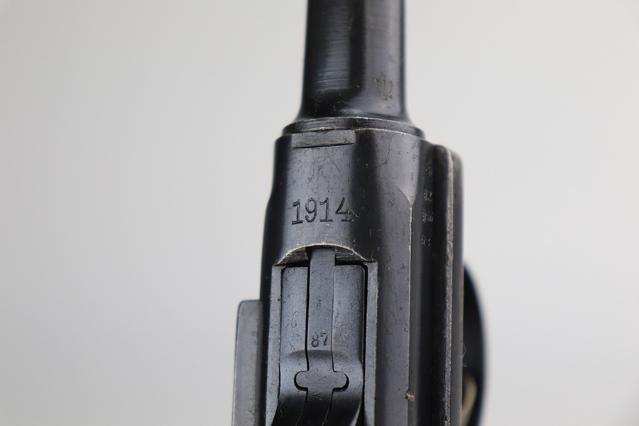 12/8/21 – This is a nice example of an Erfurt Luger issued to the Imperial German military in 1914. The gun is all matching, has Imperial German military proofs on the right side of the slide, and has the proper Erfurt proofs throughout. It has retained roughly 80% of its finish. Most of the finish loss is on the left side of the gun around the side plate. On the side plate, there are a few tiny pits. There is also spotty wear on the right side of the frame. There is minor thinning and small dots of oxidation on both grip straps. Minor muzzle wear. It comes with excellent matching-numbered wood grips and a period-correct magazine that has post-factory numbering (not matching). The bore has strong rifling with frosting in the grooves and some areas of minor pin-pricking.