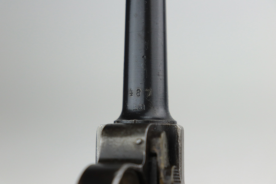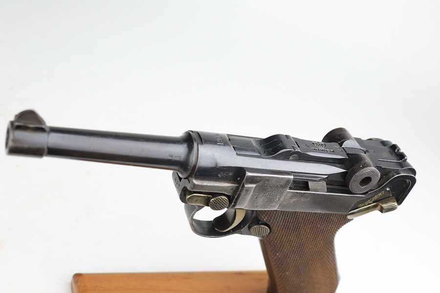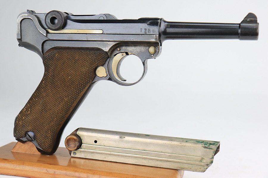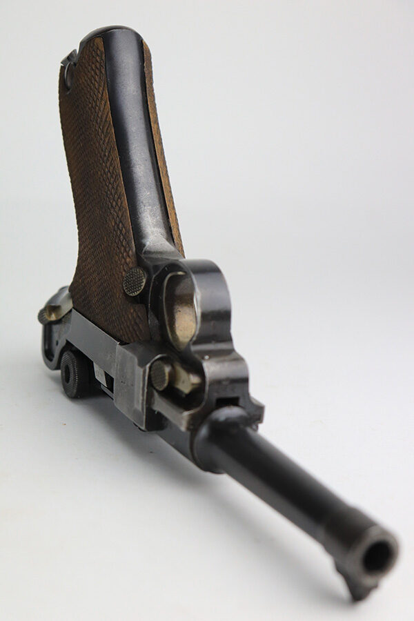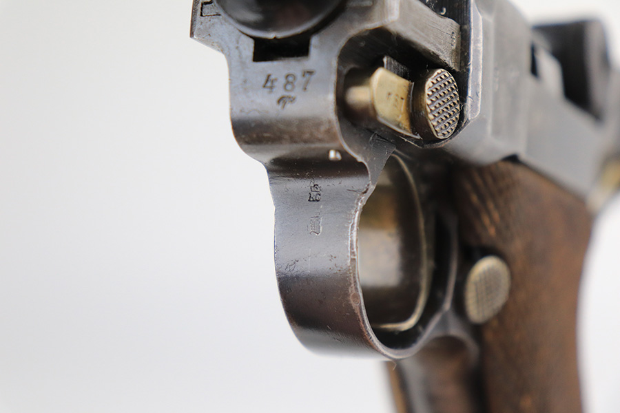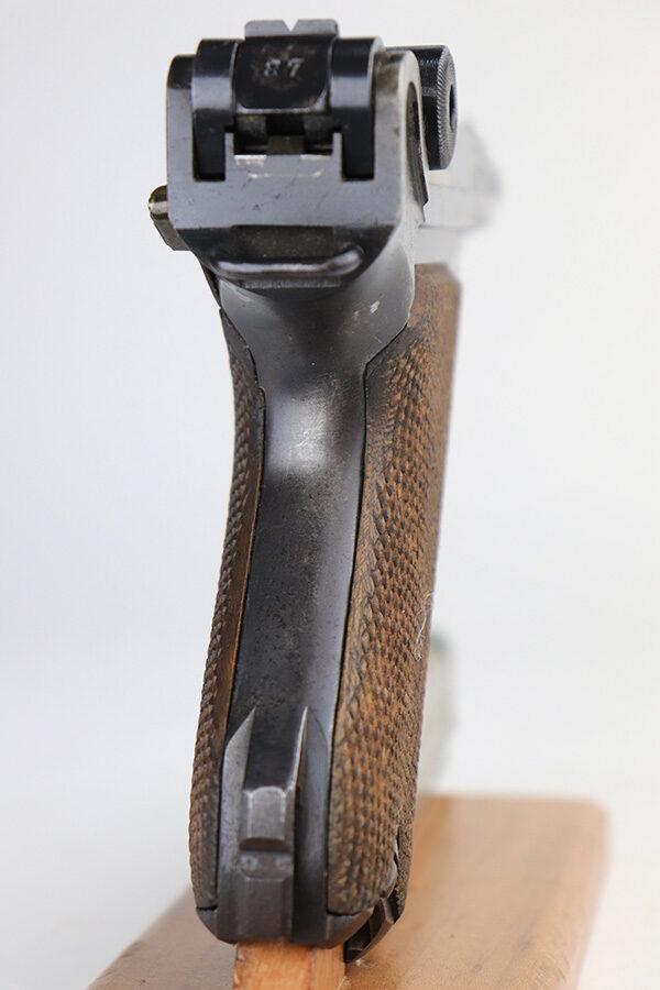 12/8/21 – This is a nice example of an Erfurt Luger issued to the Imperial German military in 1914. The gun is all matching, has Imperial German military proofs on the right side of the slide, and has the proper Erfurt proofs throughout. It has retained roughly 80% of its finish. Most of the finish loss is on the left side of the gun around the side plate. On the side plate, there are a few tiny pits. There is also spotty wear on the right side of the frame. There is minor thinning and small dots of oxidation on both grip straps. Minor muzzle wear. It comes with excellent matching-numbered wood grips and a period-correct magazine that has post-factory numbering (not matching). The bore has strong rifling with frosting in the grooves and some areas of minor pin-pricking.