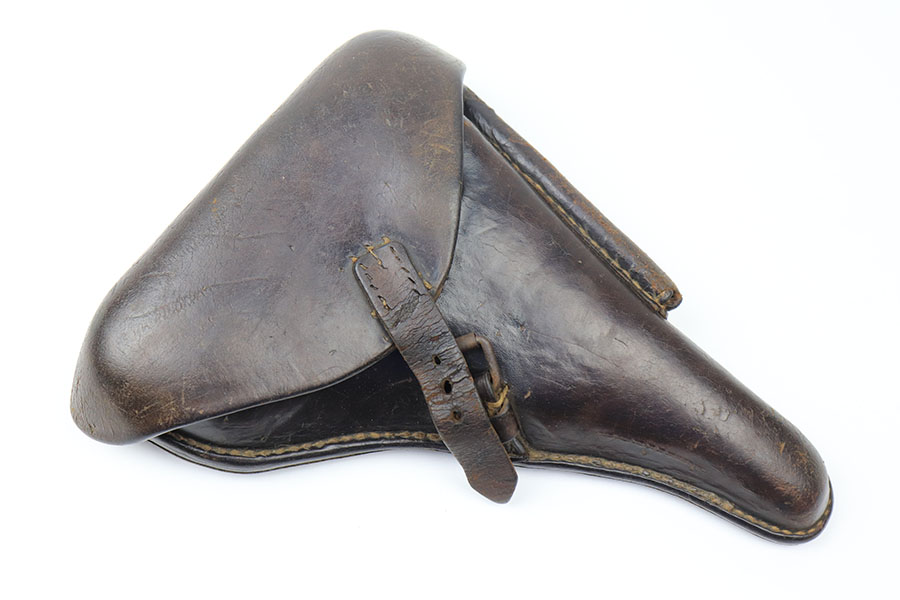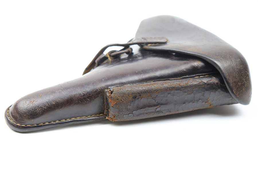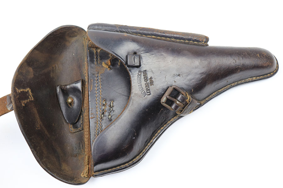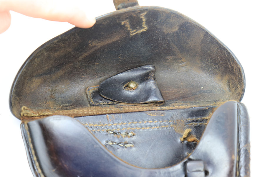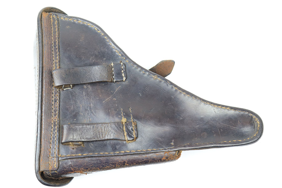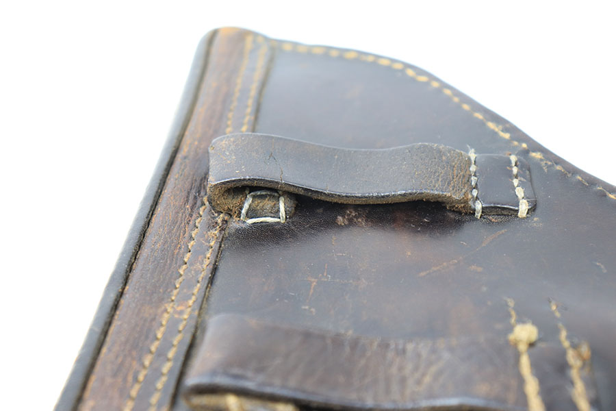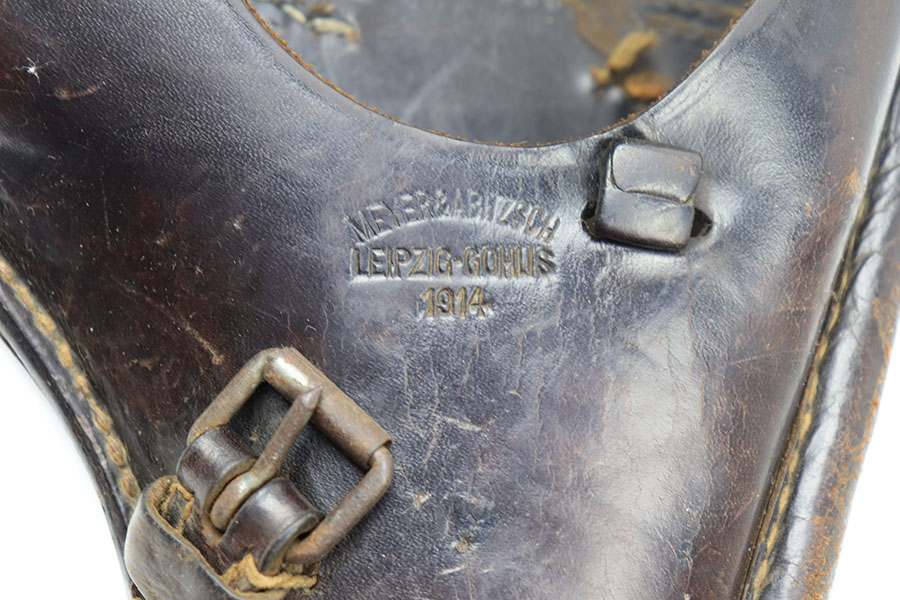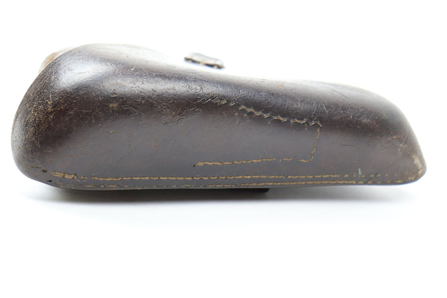 6/1/21 – This is a fairly early WW1 production Luger holster. The front of the holster is dated 1914 and maker stamped with crisp markings. The holster would be more expensive as it’s fairly scarce, if it weren’t for one of the belt loops being restitched. The closure strap also has some loose / missing stitches but is still attached. The leather has some mild surface wear and normal pliability except on the magazine pouch where there’s slightly more wear and leather pliability. Clean interior leather and no other major issues.