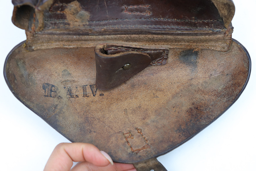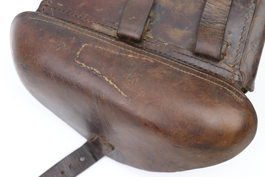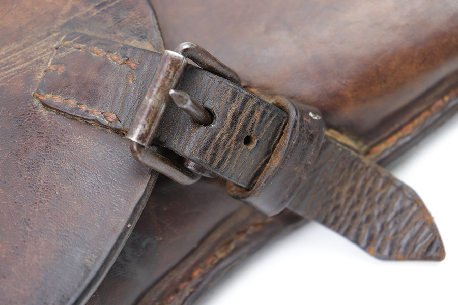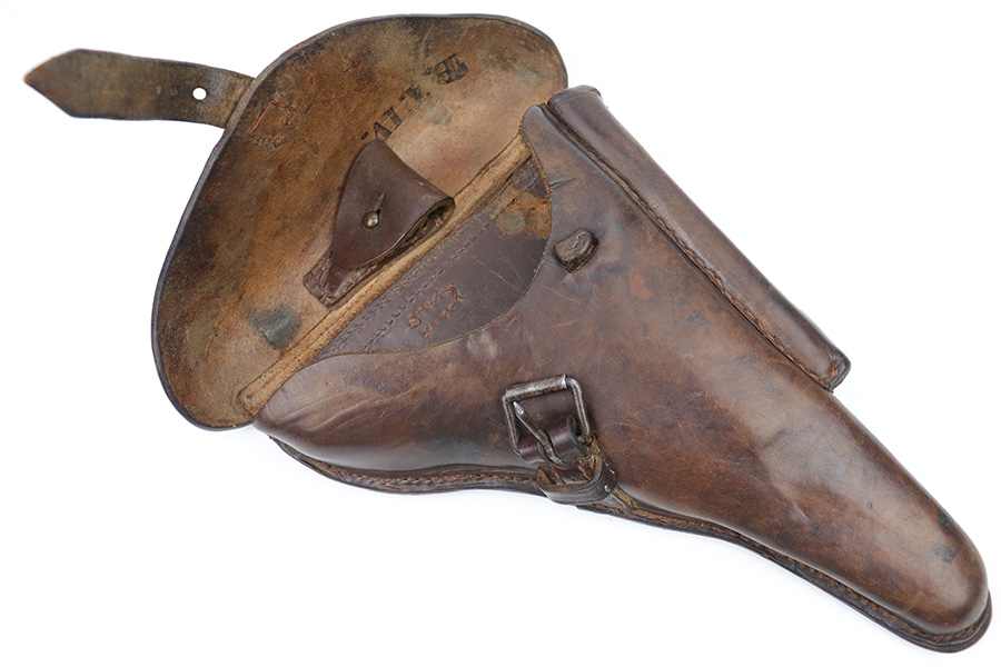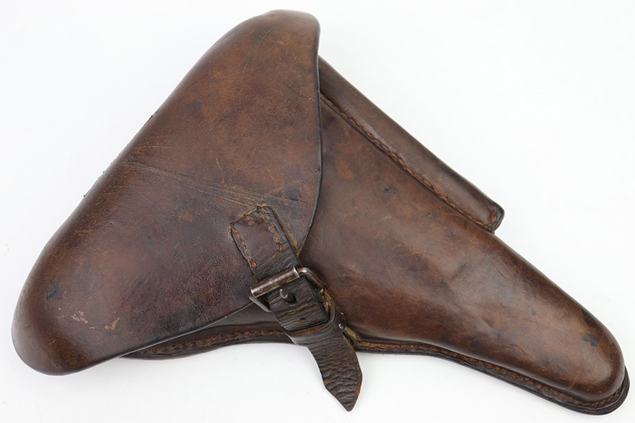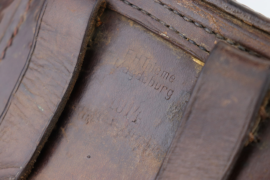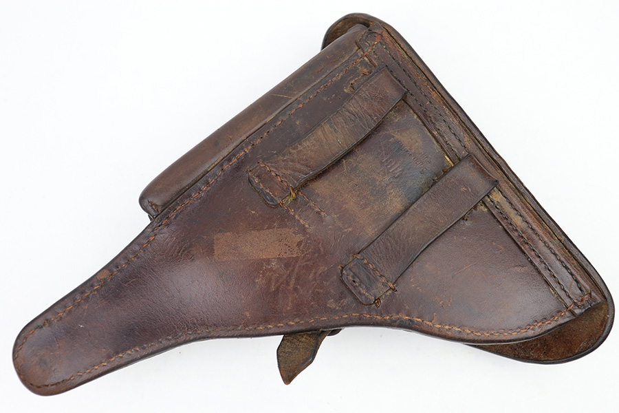 3/7/23 – This is an original 1914 dated Luger holster from WW1. The holster is in great condition with all original leather that’s completely intact with normal pliability. There’s some typical surface discoloration and signs of previous use, but no excessive wear or damage. The interior lid is ink stamped with a unit number, and the back leather is maker stamped and dated on the exterior between the belt loops. The stitching is in excellent condition and all original except for two lines of black stitching on the back leather. These two lines are found at the top where the lid attaches to the main body of leather. Likely a period replacement or repair, as there’s wear over the leather and stitching on the interior that is definitely aged and is married to the leather in a way that only time can create. An overall impressive early WW1 example holster.