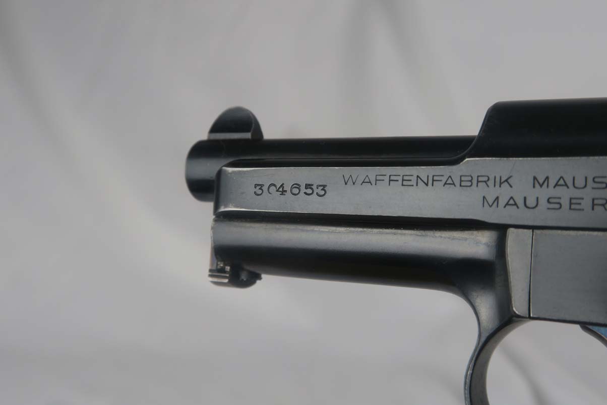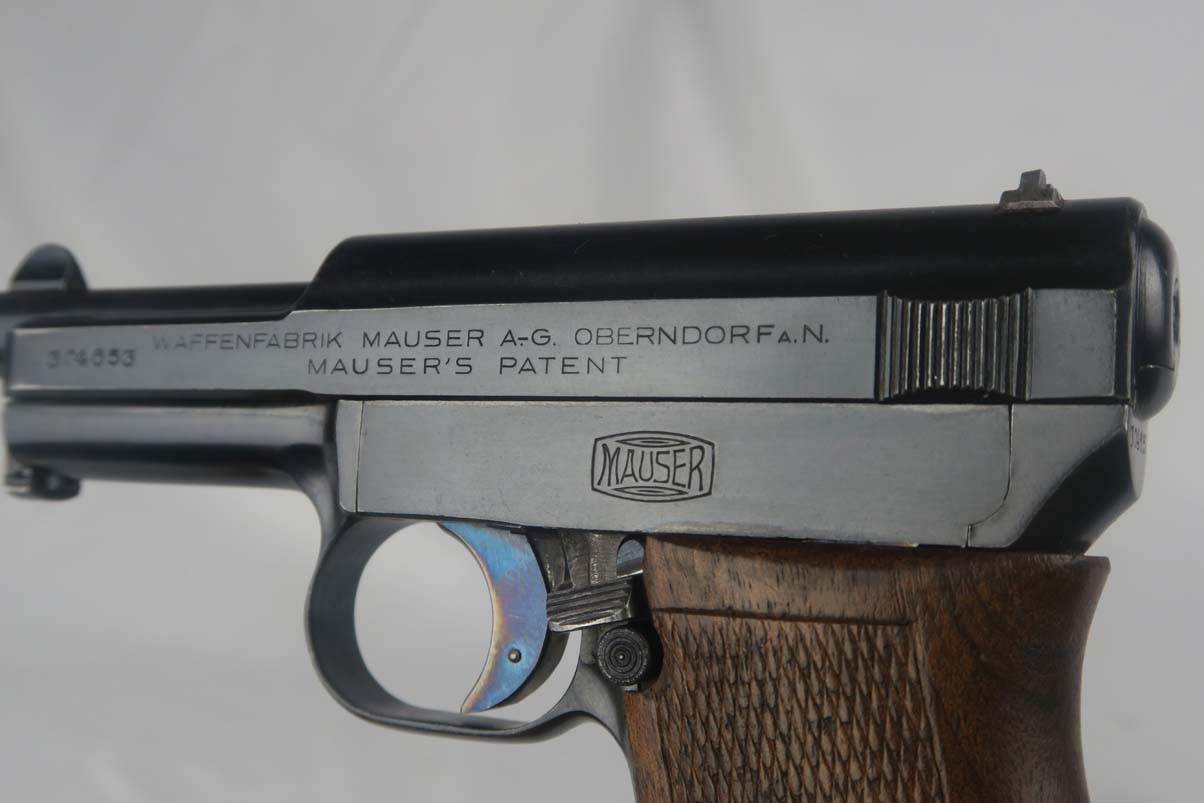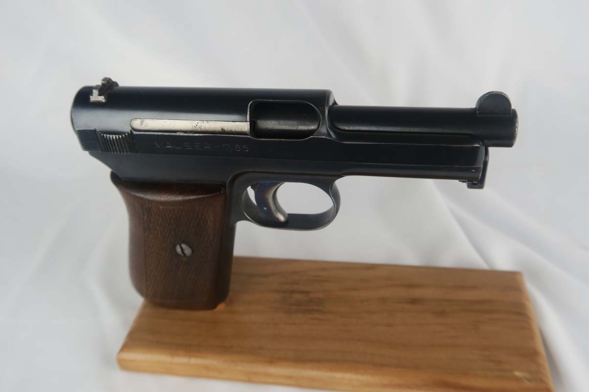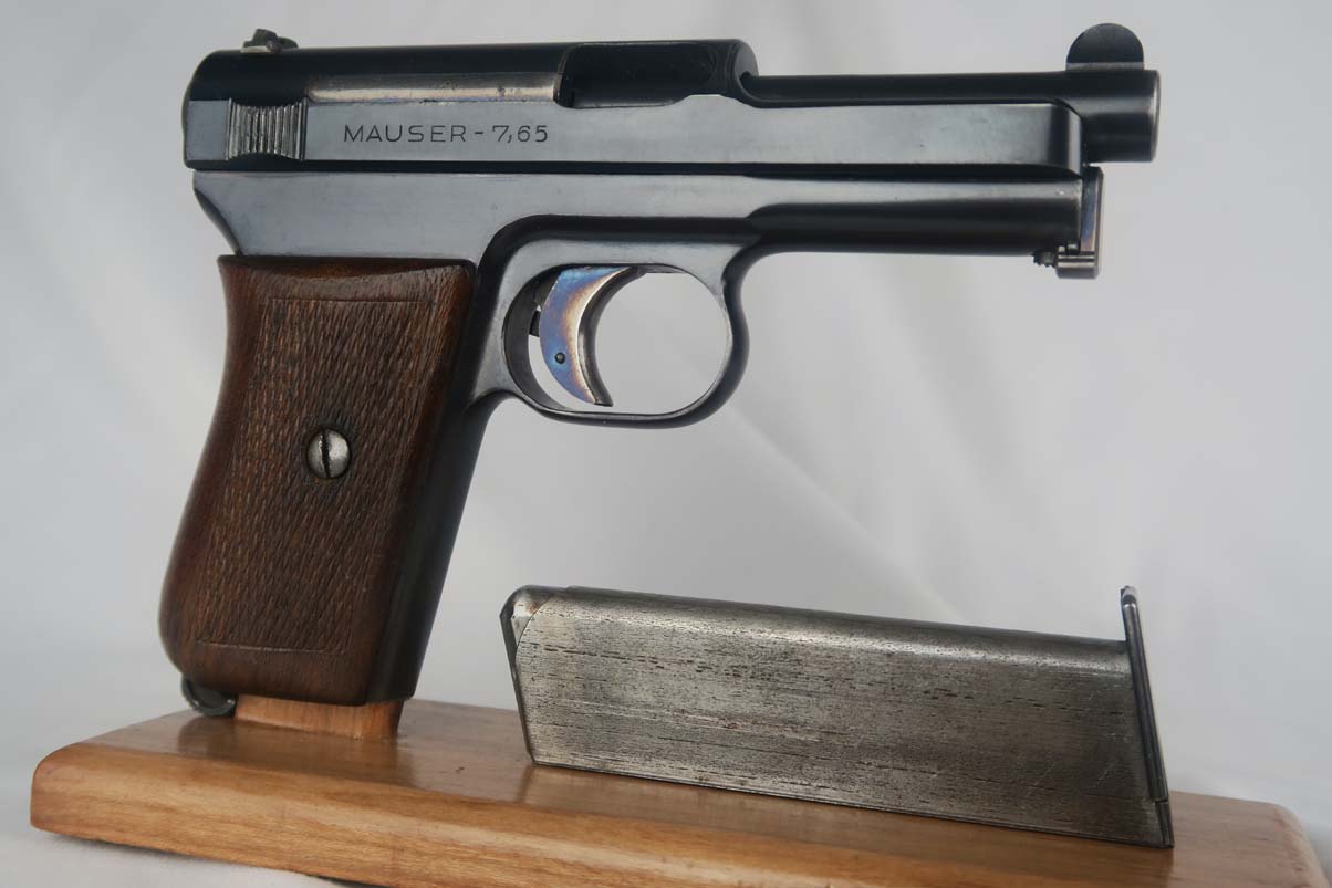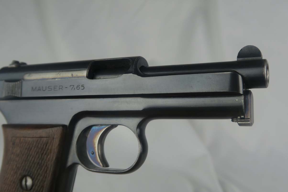6/22/17 – This is an original Mauser model 1914 in 7.65mm. The pistol is in beautiful condition with very nice high polish bluing throughout. The tripper and muzzle latch are both fire blue finished with minimal wear. The trigger has some normal edgewear. The front strap has most of the pistol wear. This is typical thinning wear, and there is no rust or pitting on the pistol. The grips are excellent and original with no cracks or chips. The bore has strong rifling and very minimal wear/signs of use. Guaranteed original and authentic.