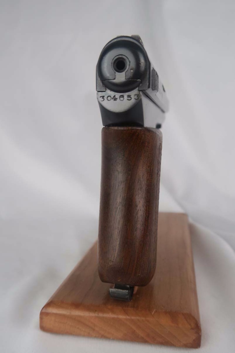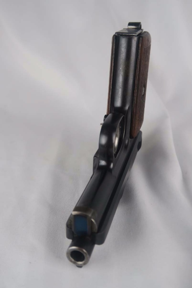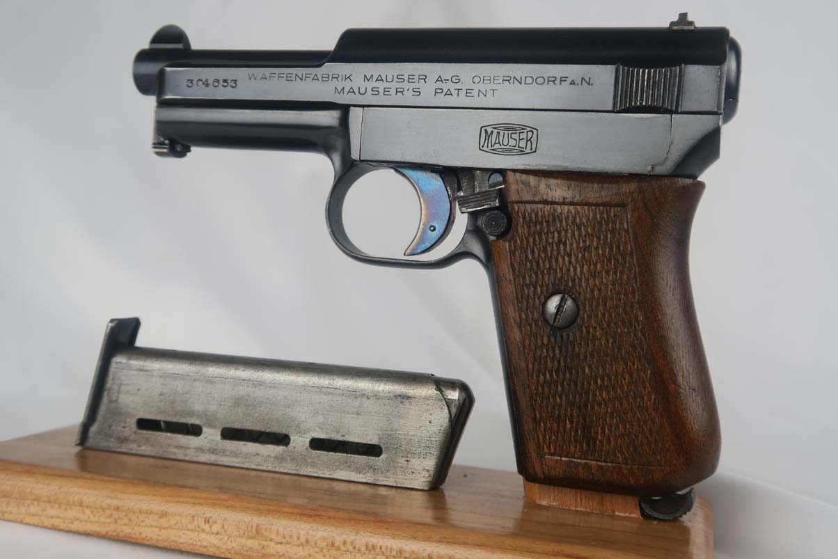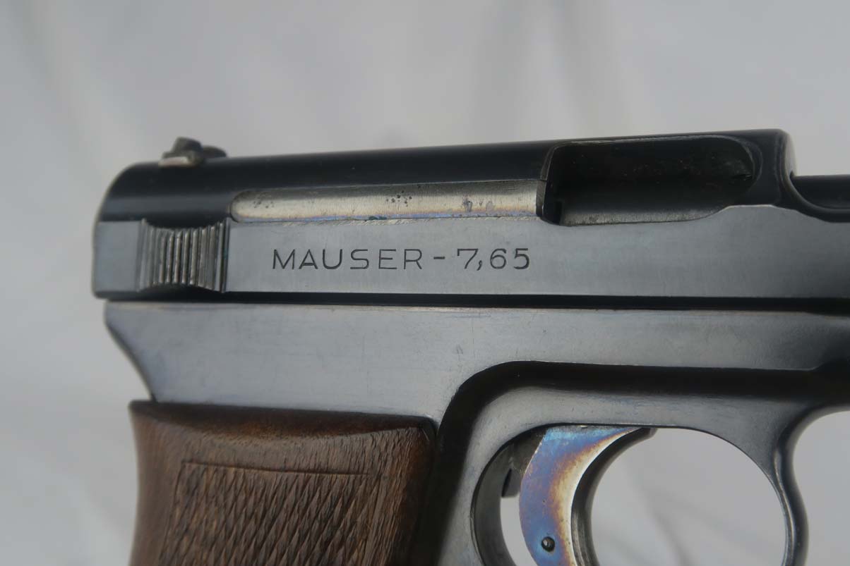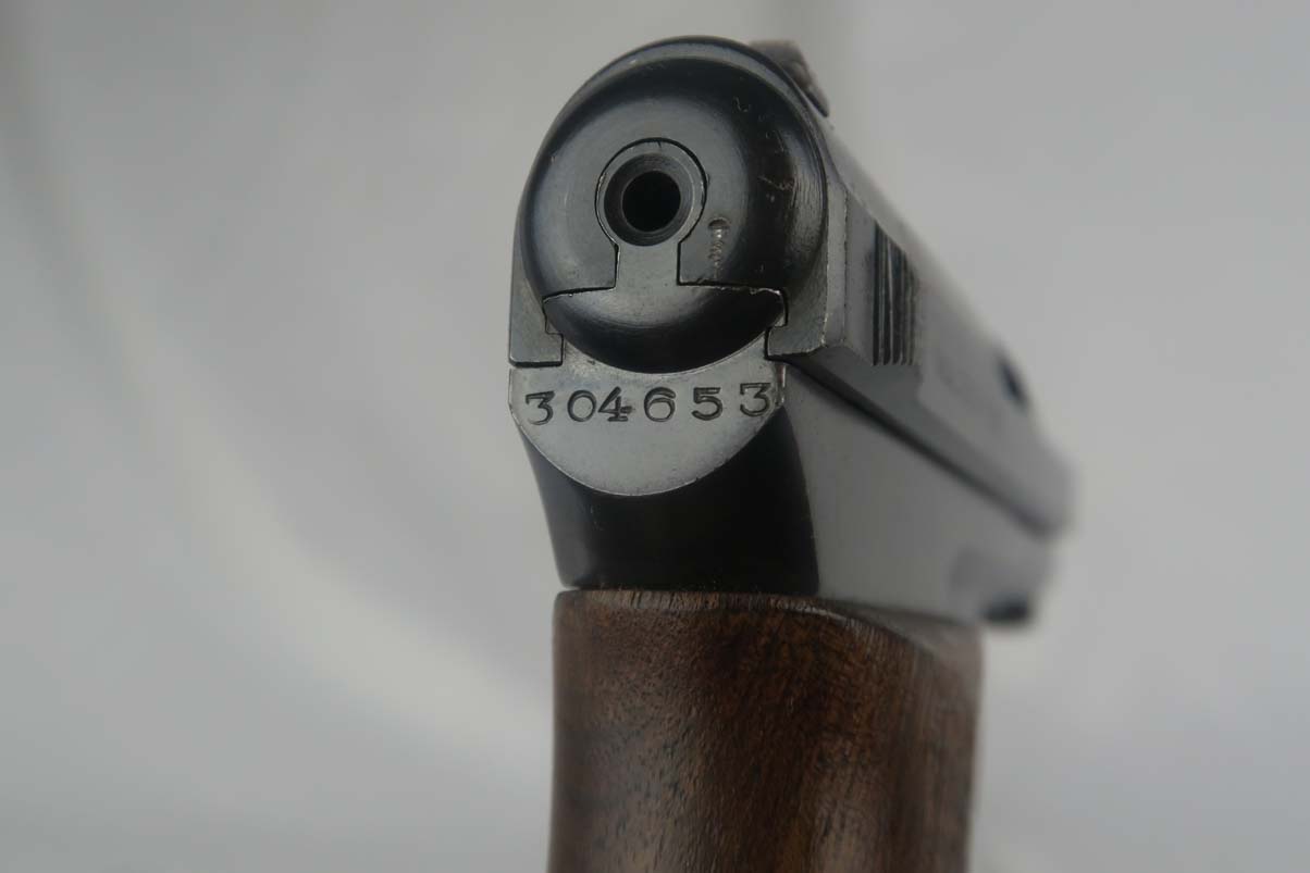 6/22/17 – This is an original Mauser model 1914 in 7.65mm. The pistol is in beautiful condition with very nice high polish bluing throughout. The tripper and muzzle latch are both fire blue finished with minimal wear. The trigger has some normal edgewear. The front strap has most of the pistol wear. This is typical thinning wear, and there is no rust or pitting on the pistol. The grips are excellent and original with no cracks or chips. The bore has strong rifling and very minimal wear/signs of use. Guaranteed original and authentic.