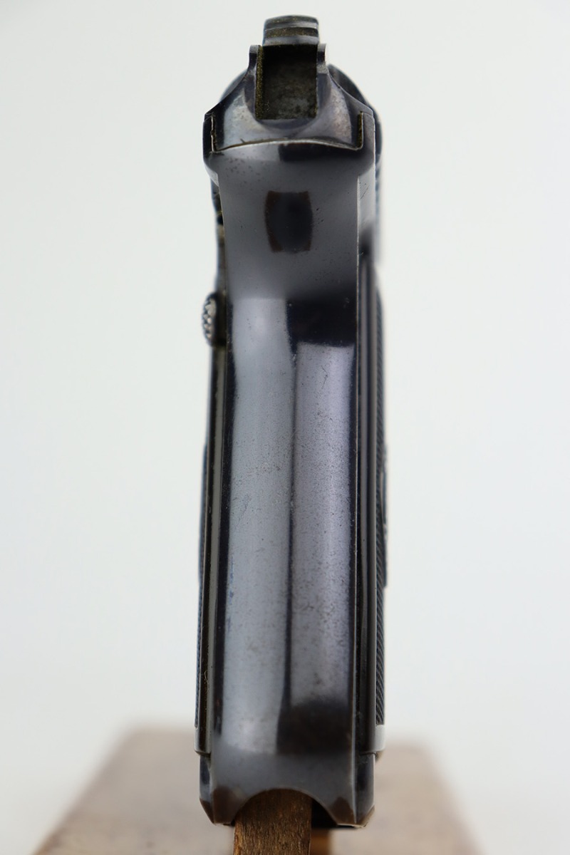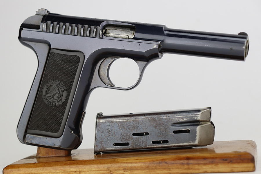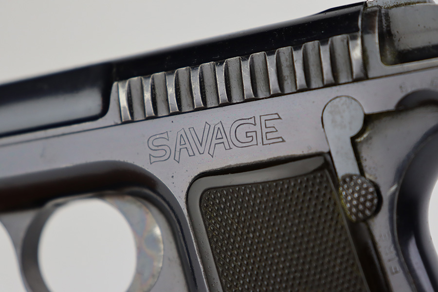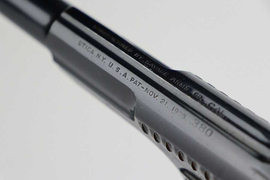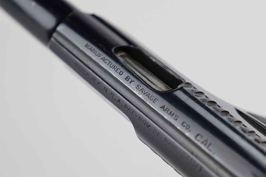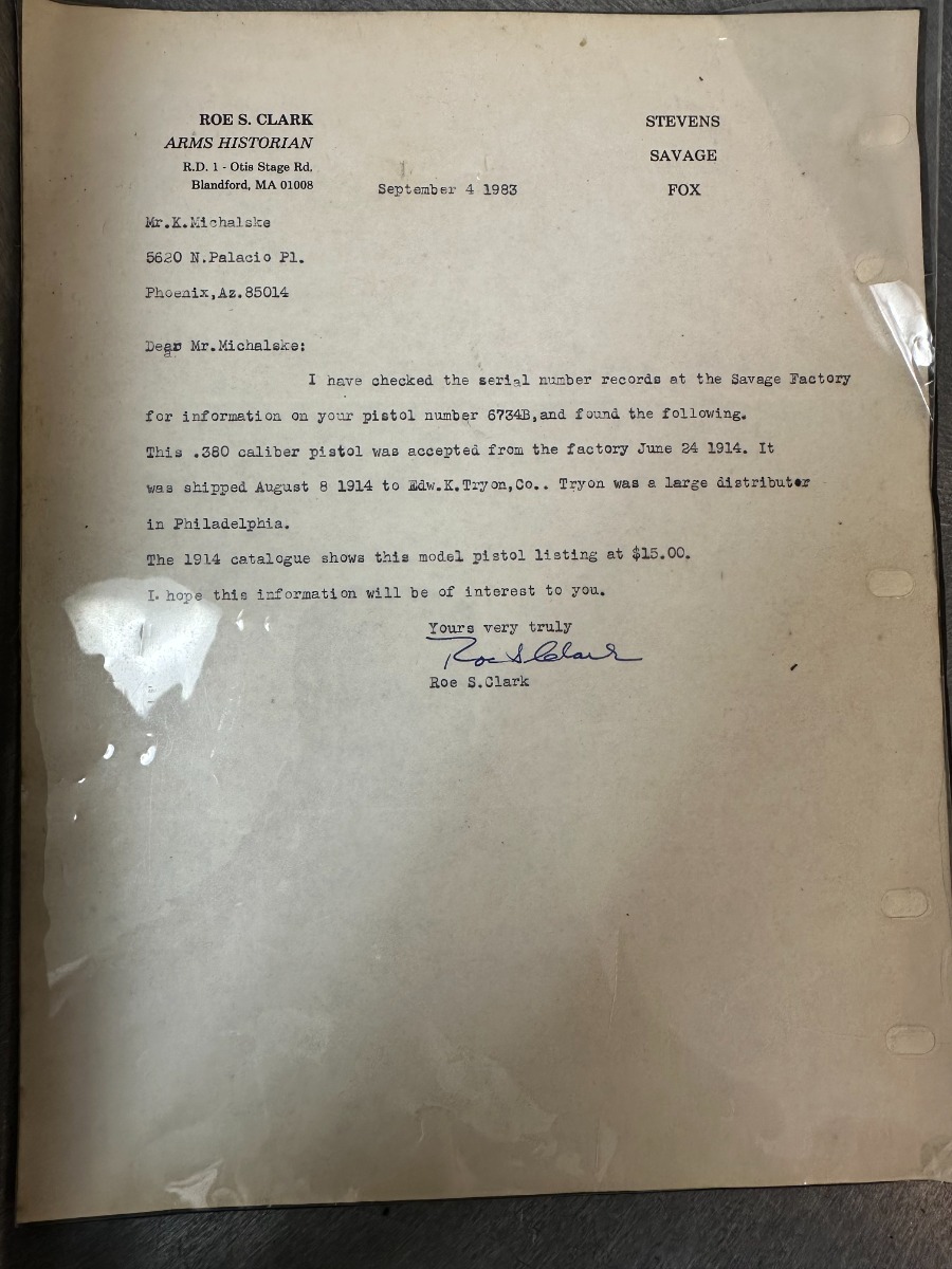 8/15/23 – This is an excellent example of a Savage Model 1907, chambered in .380 ACP. Included with the gun are a couple of articles, a reprint of the Savage #60 catalogue, and an original signed archive letter. The letter is dated 1983 and certifies that this particular pistol was shipped to Edw. K. Tyron Co. in Philadelphia on June 24, 1914. The gun itself has retained about 95% of its original beautiful high polish finish. There is minor wear around the muzzle and on the high edges in general. Some tiny handling marks here and there and hints of pin-pricking on the grip straps. Fitted with excellent period-correct bakelite grips. Comes with one proper magazine. Excellent bore with strong rifling.
