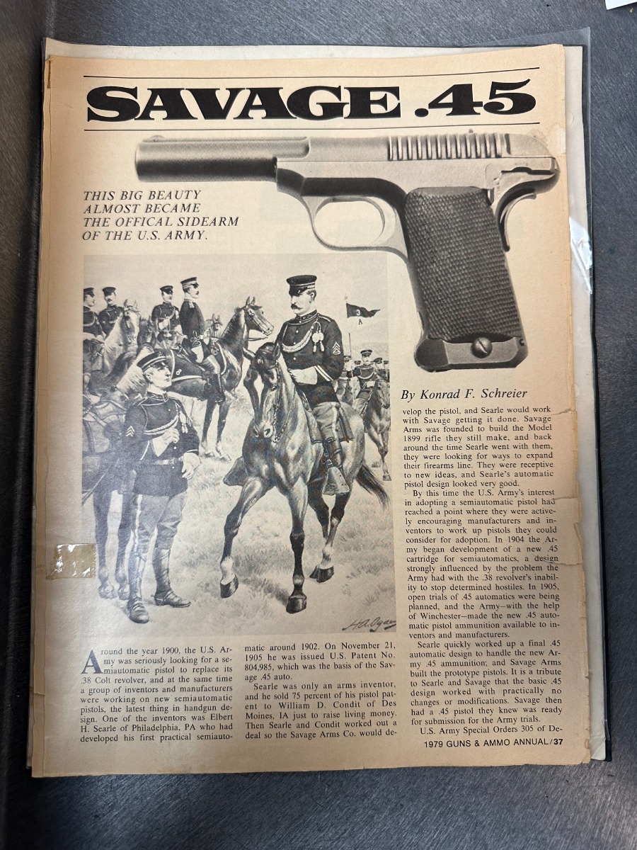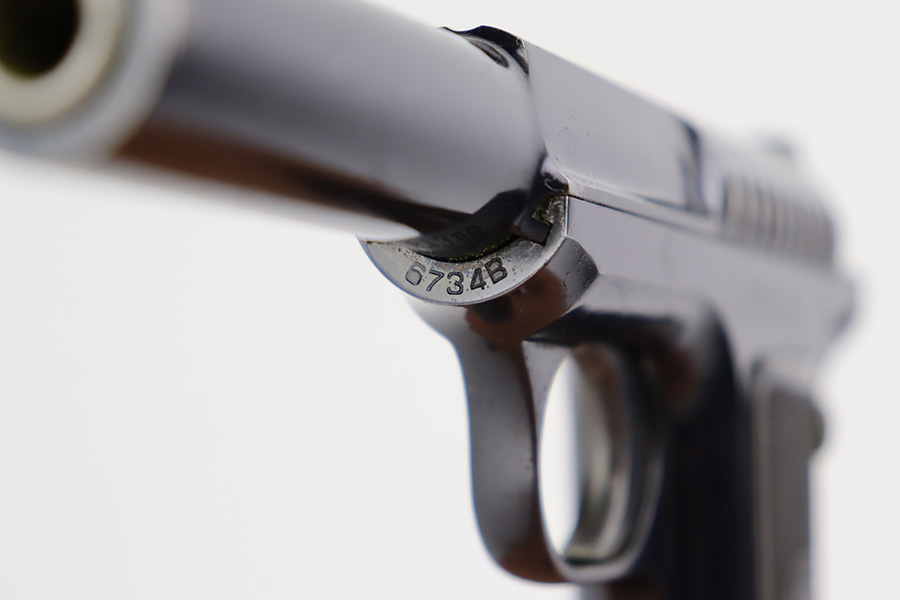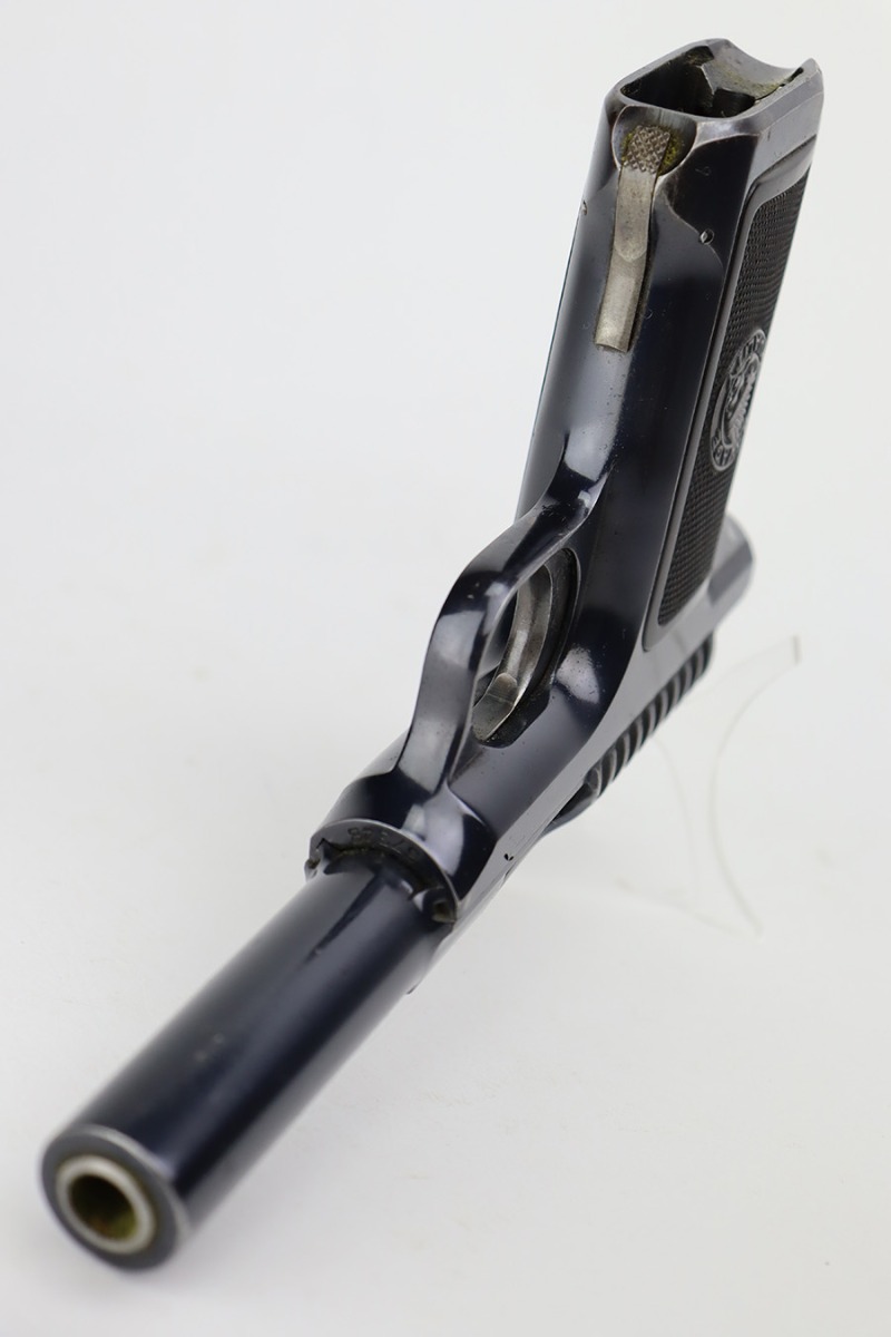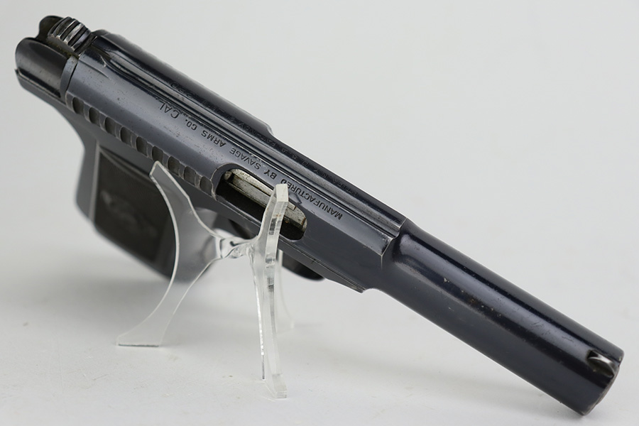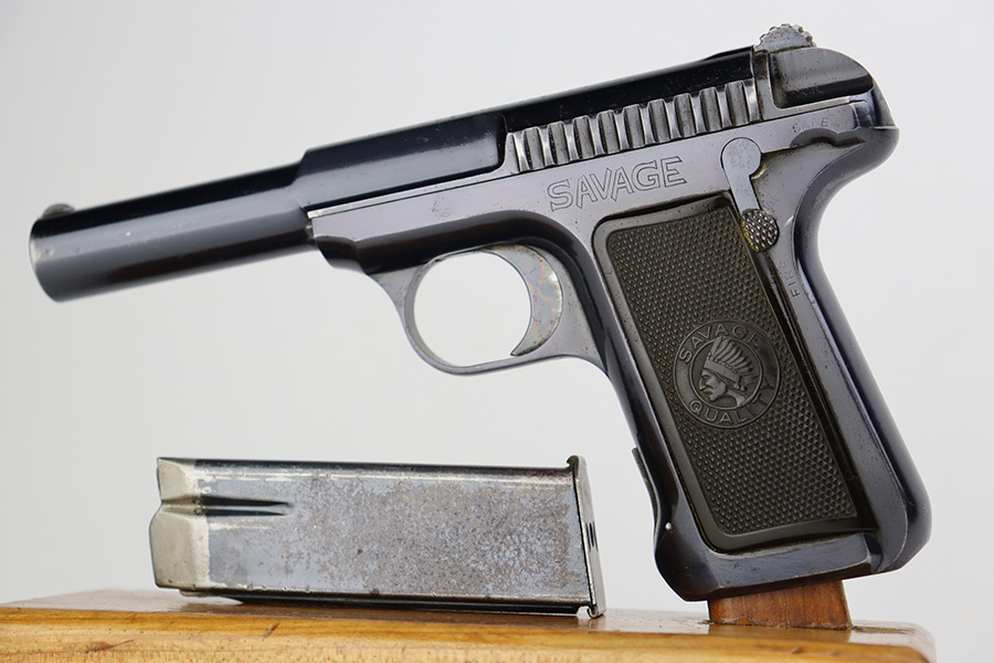 8/15/23 – This is an excellent example of a Savage Model 1907, chambered in .380 ACP. Included with the gun are a couple of articles, a reprint of the Savage #60 catalogue, and an original signed archive letter. The letter is dated 1983 and certifies that this particular pistol was shipped to Edw. K. Tyron Co. in Philadelphia on June 24, 1914. The gun itself has retained about 95% of its original beautiful high polish finish. There is minor wear around the muzzle and on the high edges in general. Some tiny handling marks here and there and hints of pin-pricking on the grip straps. Fitted with excellent period-correct bakelite grips. Comes with one proper magazine. Excellent bore with strong rifling.