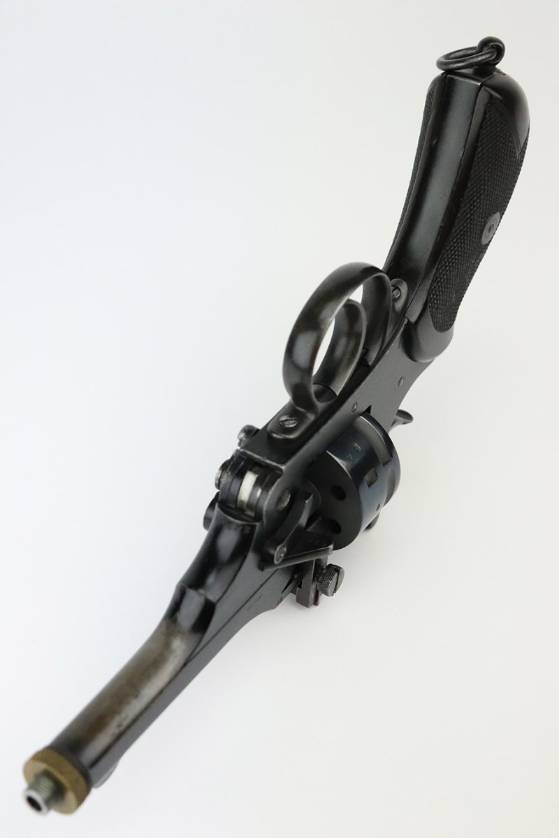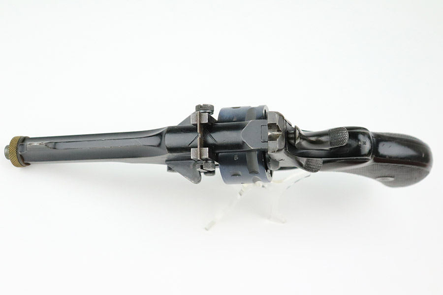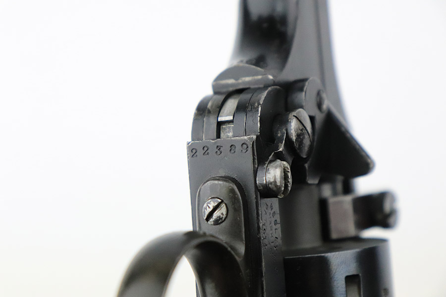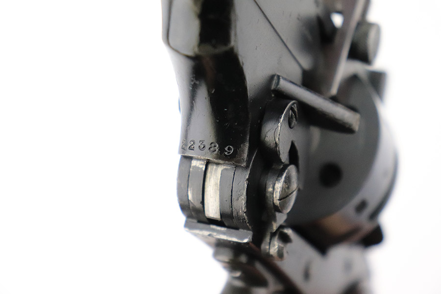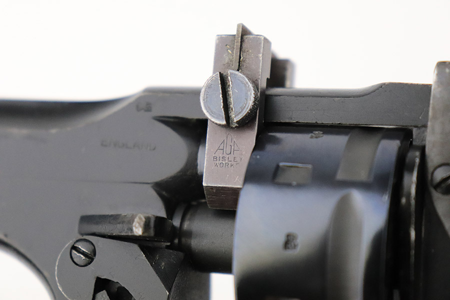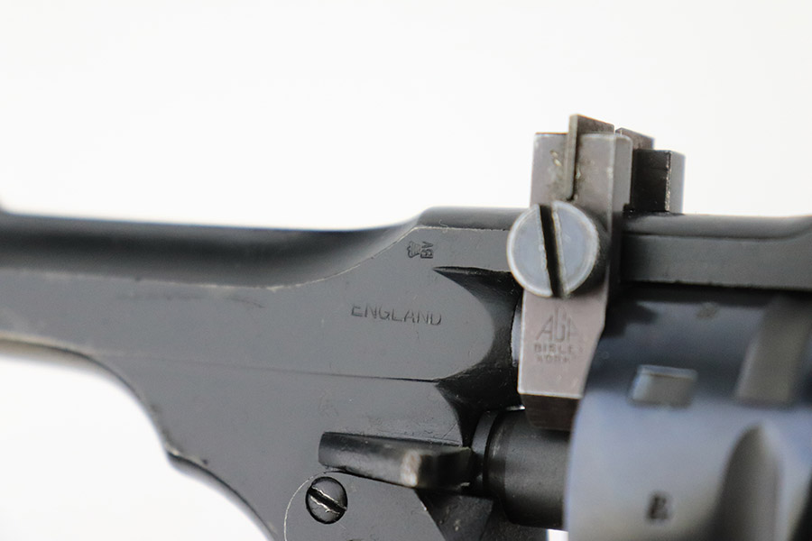 11/30/22 – This is a nice example of a scarce 1914 Webley Mark I revolver that was originally issued to the British military during WW1 but was later converted to fire .22 caliber. The cylinder was replaced, a barrel sleeve was installed, and an additional rear sight was added. The left side of the rear sight assembly is marked “AGA Bisley Works”. The gun has retained about 92% of its black enamel finish. The majority of the finish loss is on the underside of the barrel around the muzzle. There is minor wear around the high edges in general, minor thinning on the back strap, and some small chips in the finish here and there. The cylinder appears to be blued and buffed. Comes with nice brown bakelite grips. Mint bore.